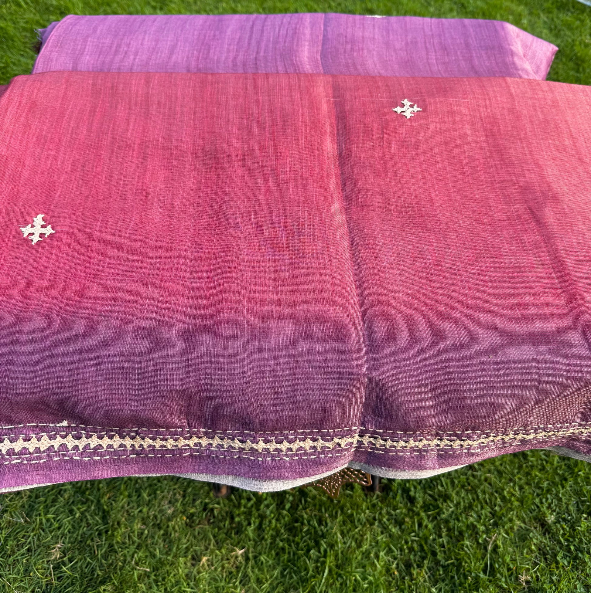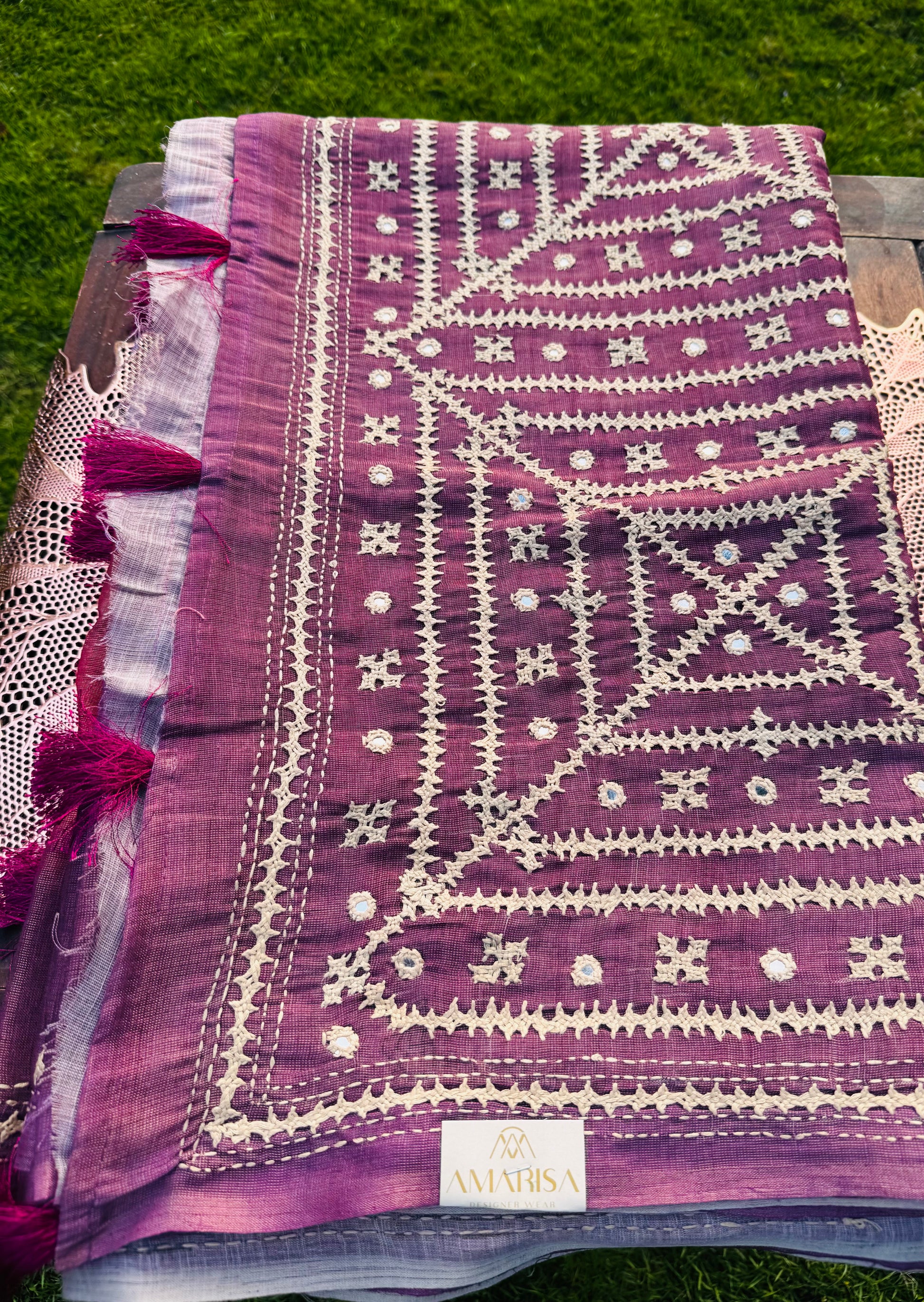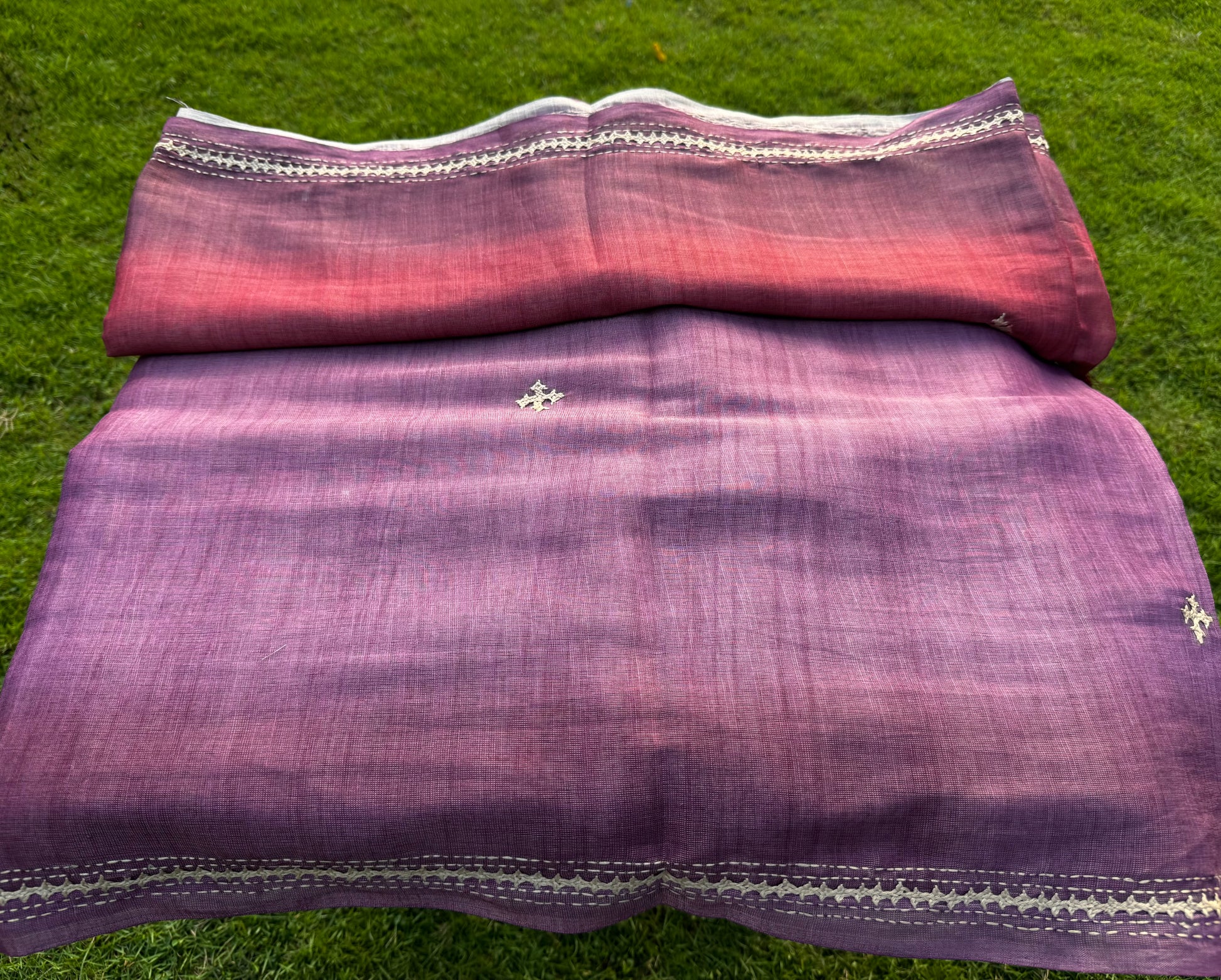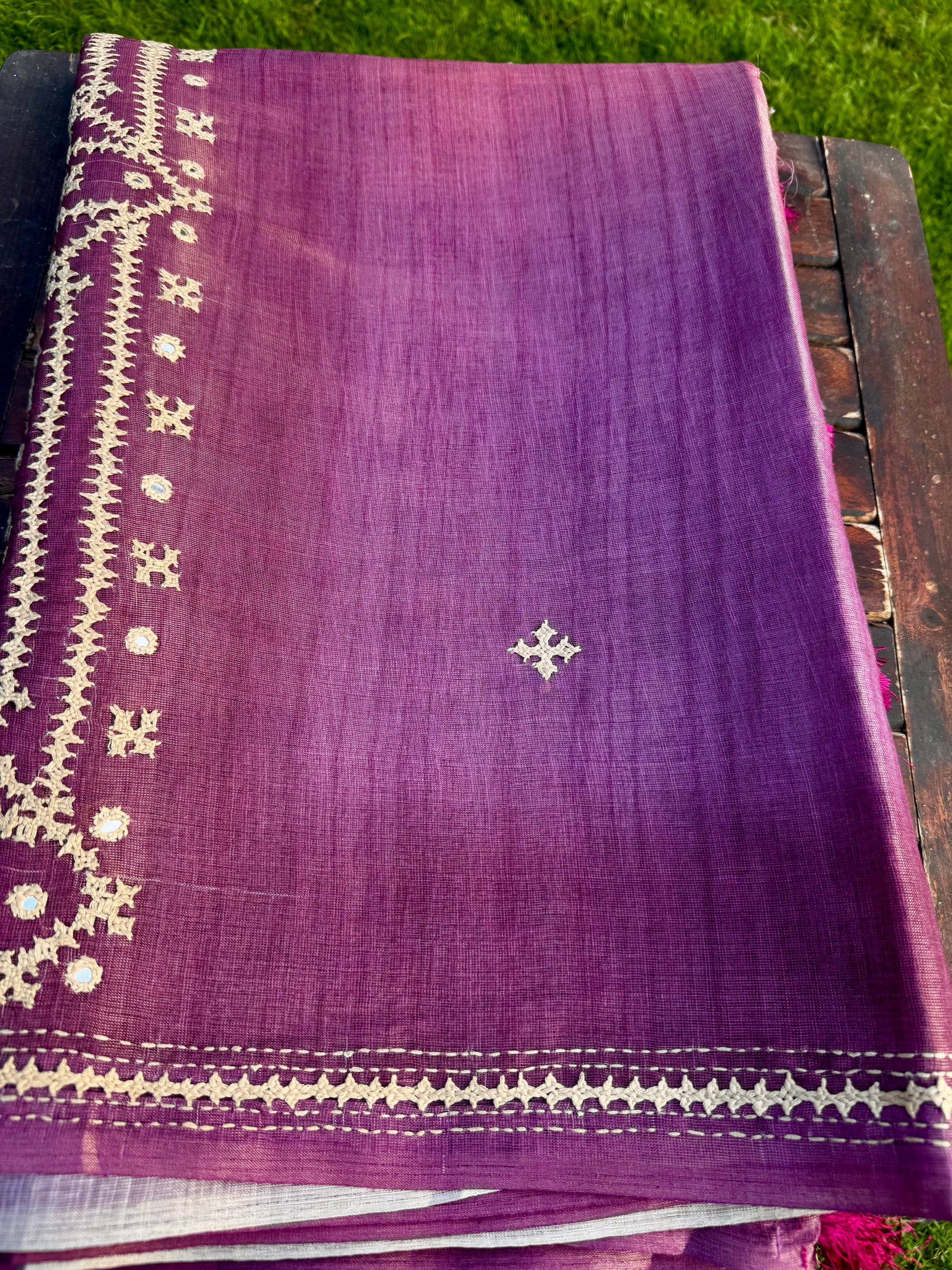 This stunning linen-blend drape features a rich ombre effect transitioning from deep plum to soft magenta, creating a uniquely graceful flow. The highlight of the saree is its exquisite Kutch embroidery, meticulously hand-worked along the pallu and borders with traditional geometric motifs and mirror-style accents.