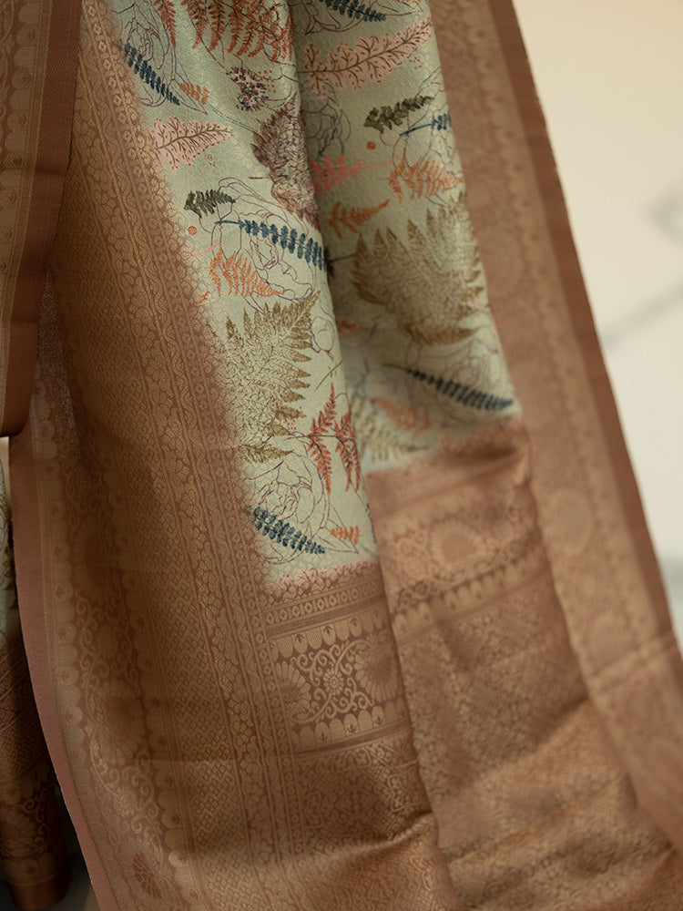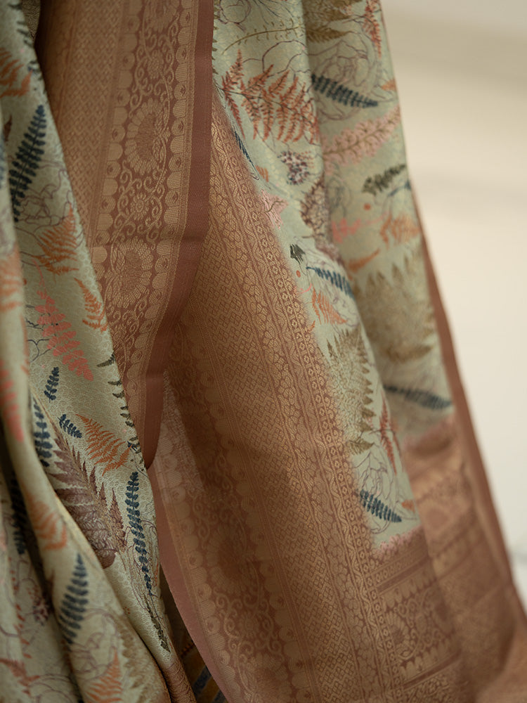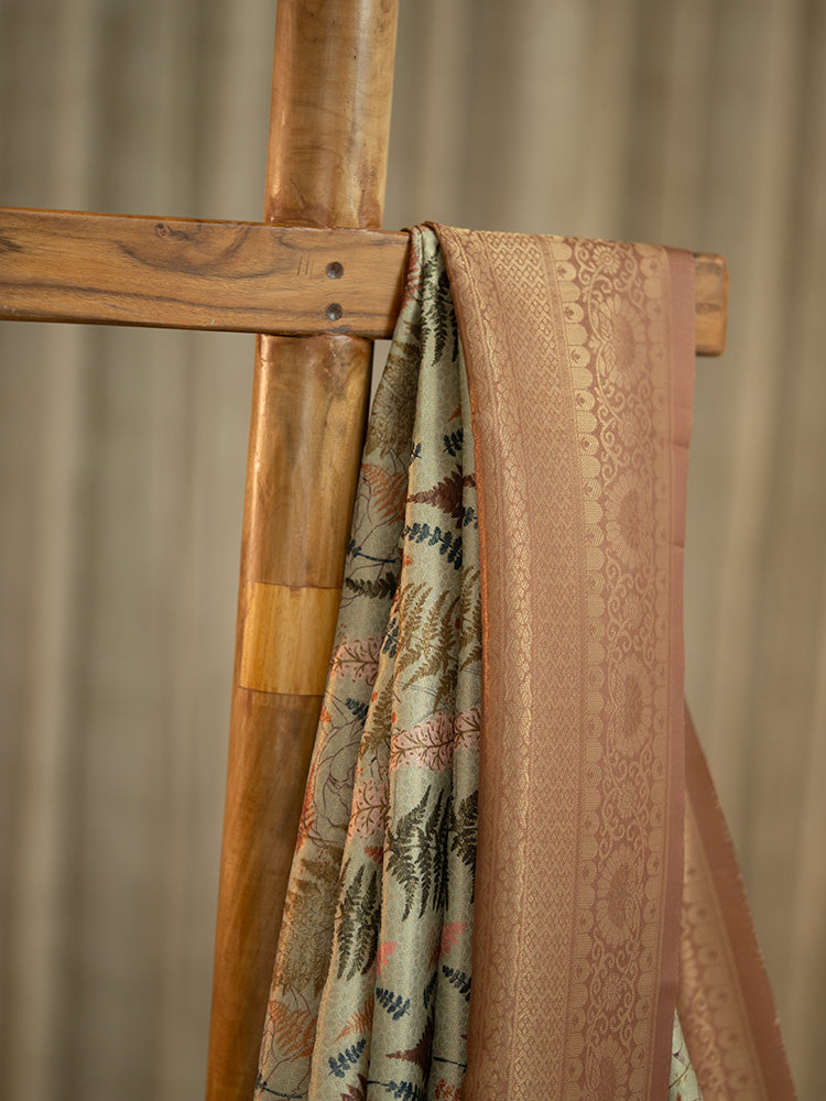 Color: Beige with intricate brocade print and brown zari border and pallu.