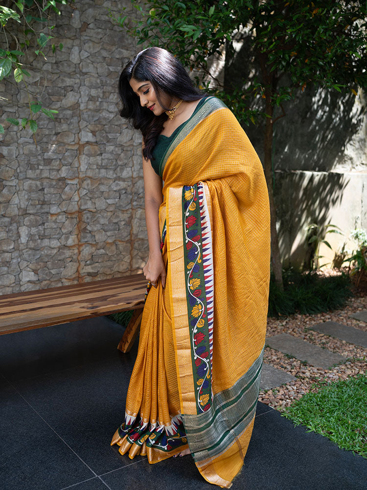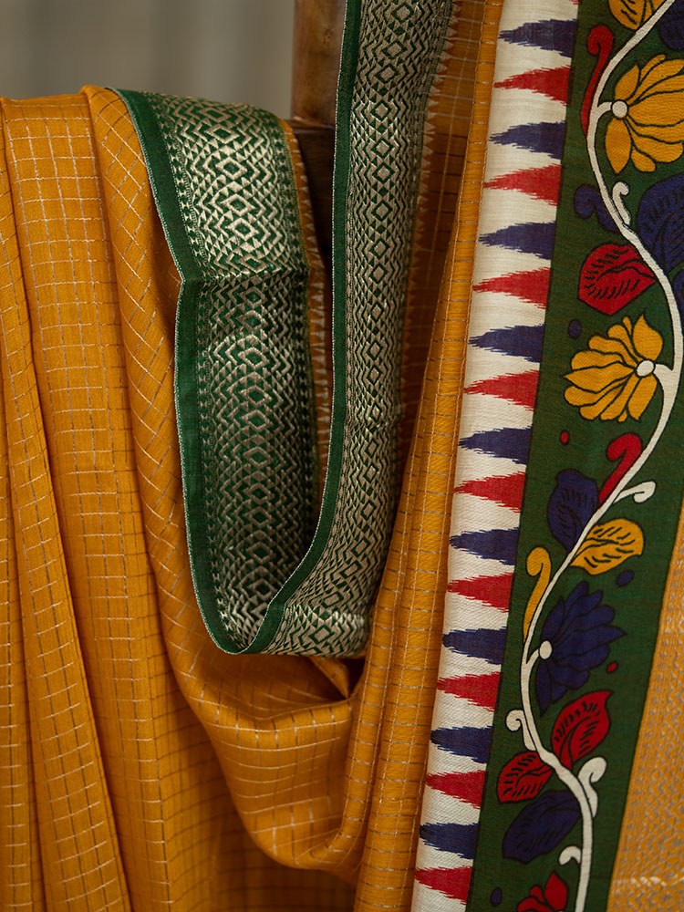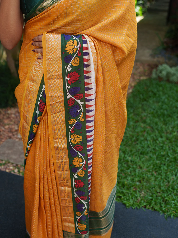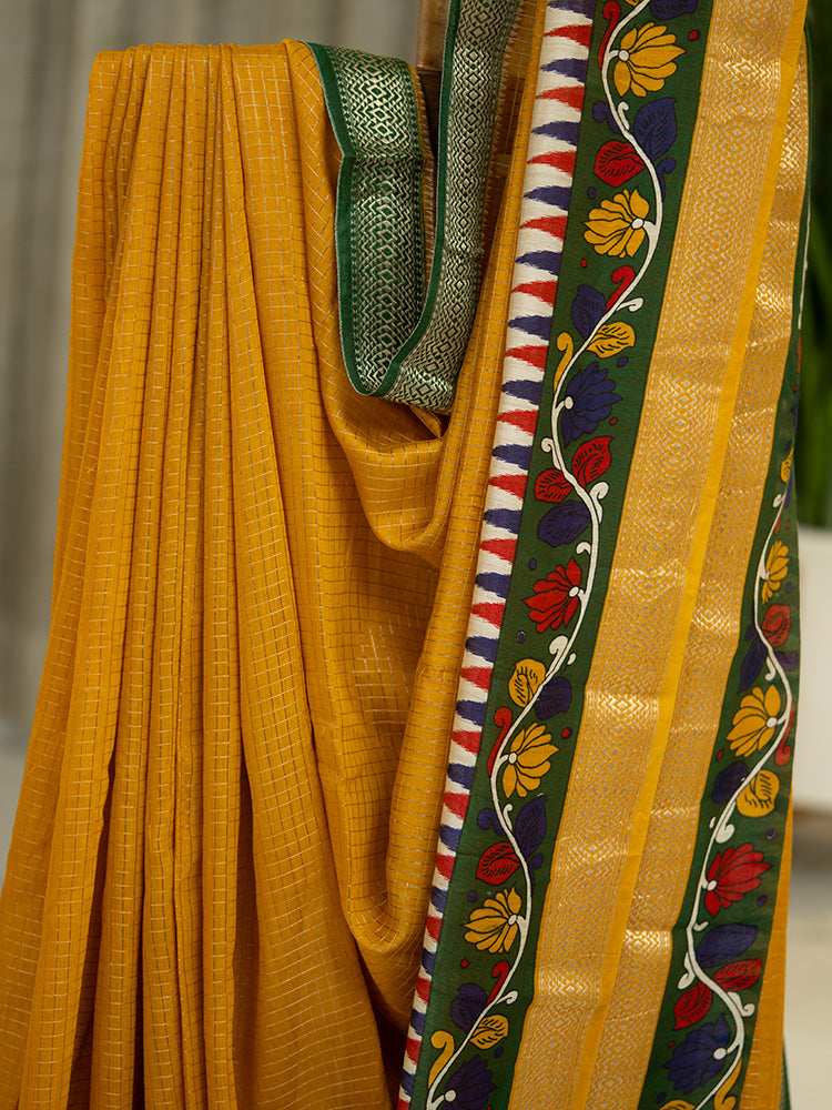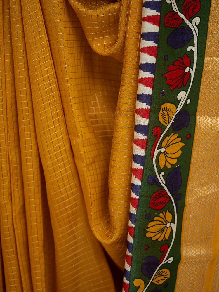 Chanderi Check Saree in Mustard Yellow with Green Kalamkari Work
