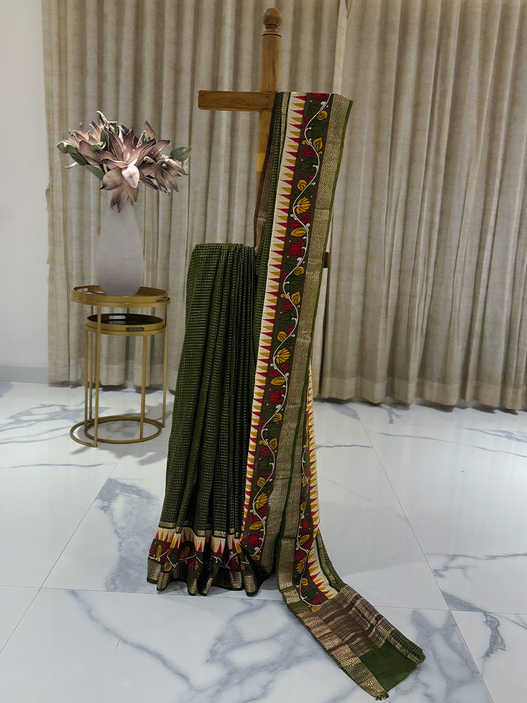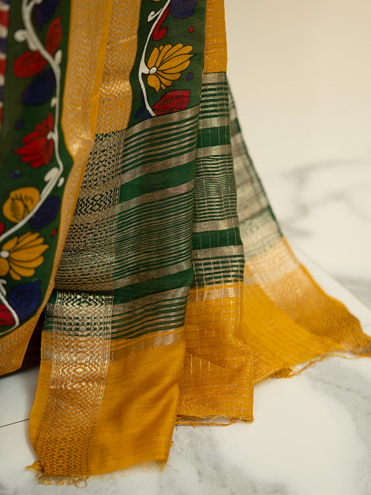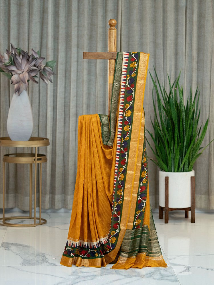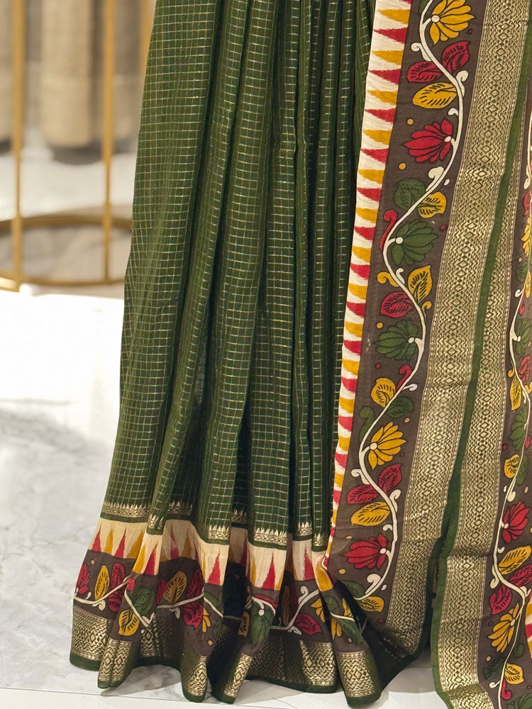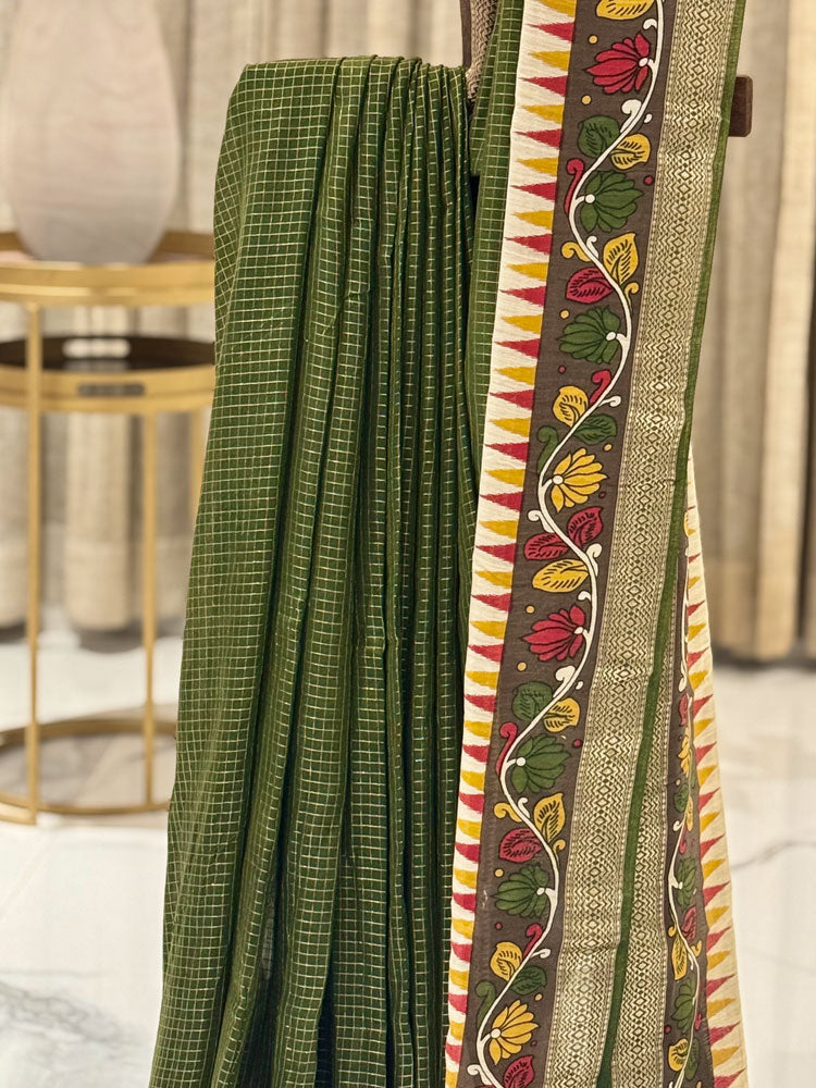 Chanderi Check Saree in Mustard Yellow with Green Kalamkari Work