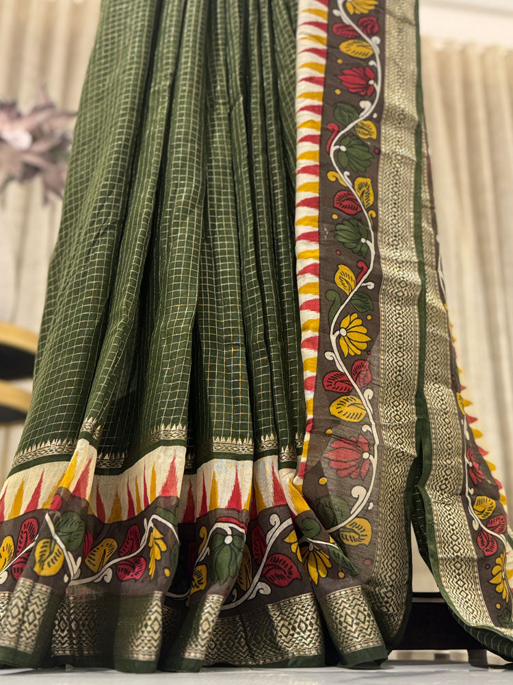 Order Now for a Stunning Look! Refresh your wardrobe with the Chanderi Check Saree in Mustard Yellow with Green Kalamkari Work. Shop today to embrace timeless elegance!