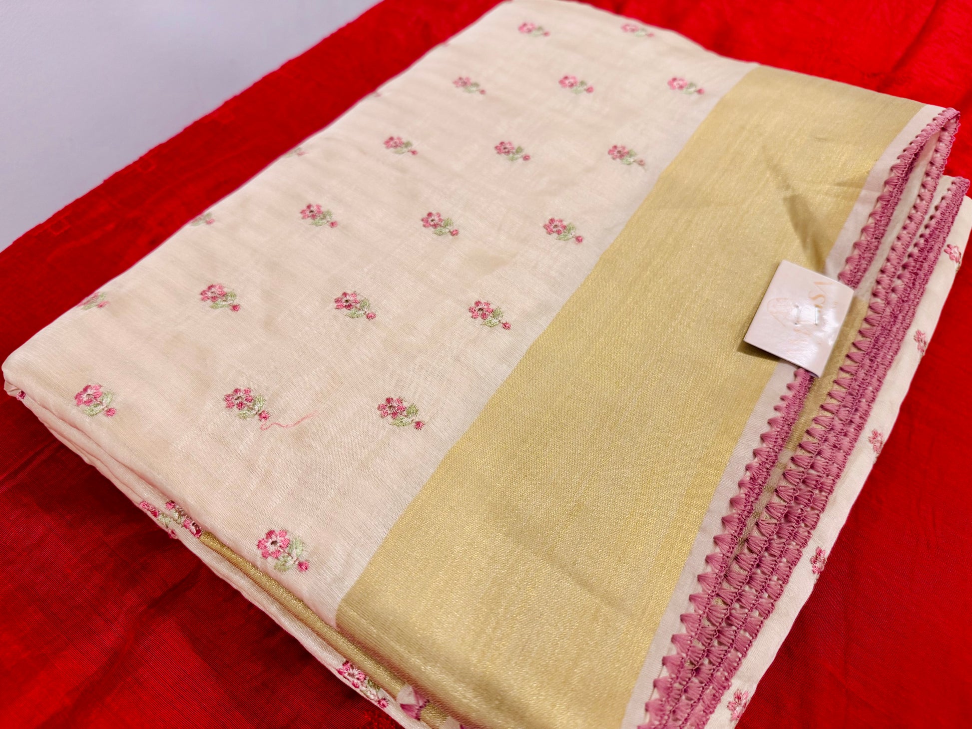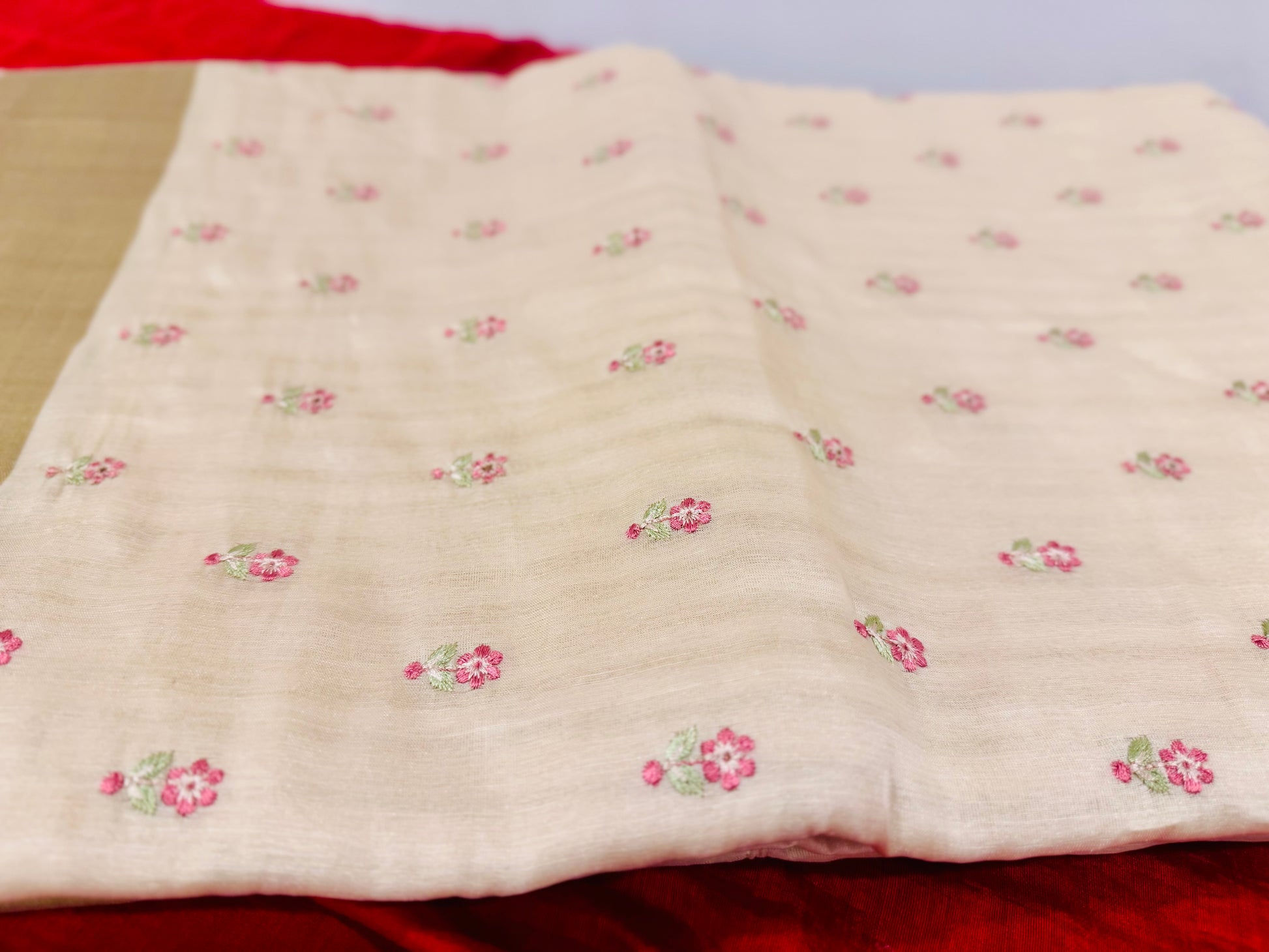 Elevate your ethnic wardrobe with this elegant Chanderi silk saree, featuring an off-white base adorned with delicate handwoven floral bhuttis. The subtle pink and green floral motifs add a touch of grace and femininity, making it perfect for festive occasions and intimate gatherings.