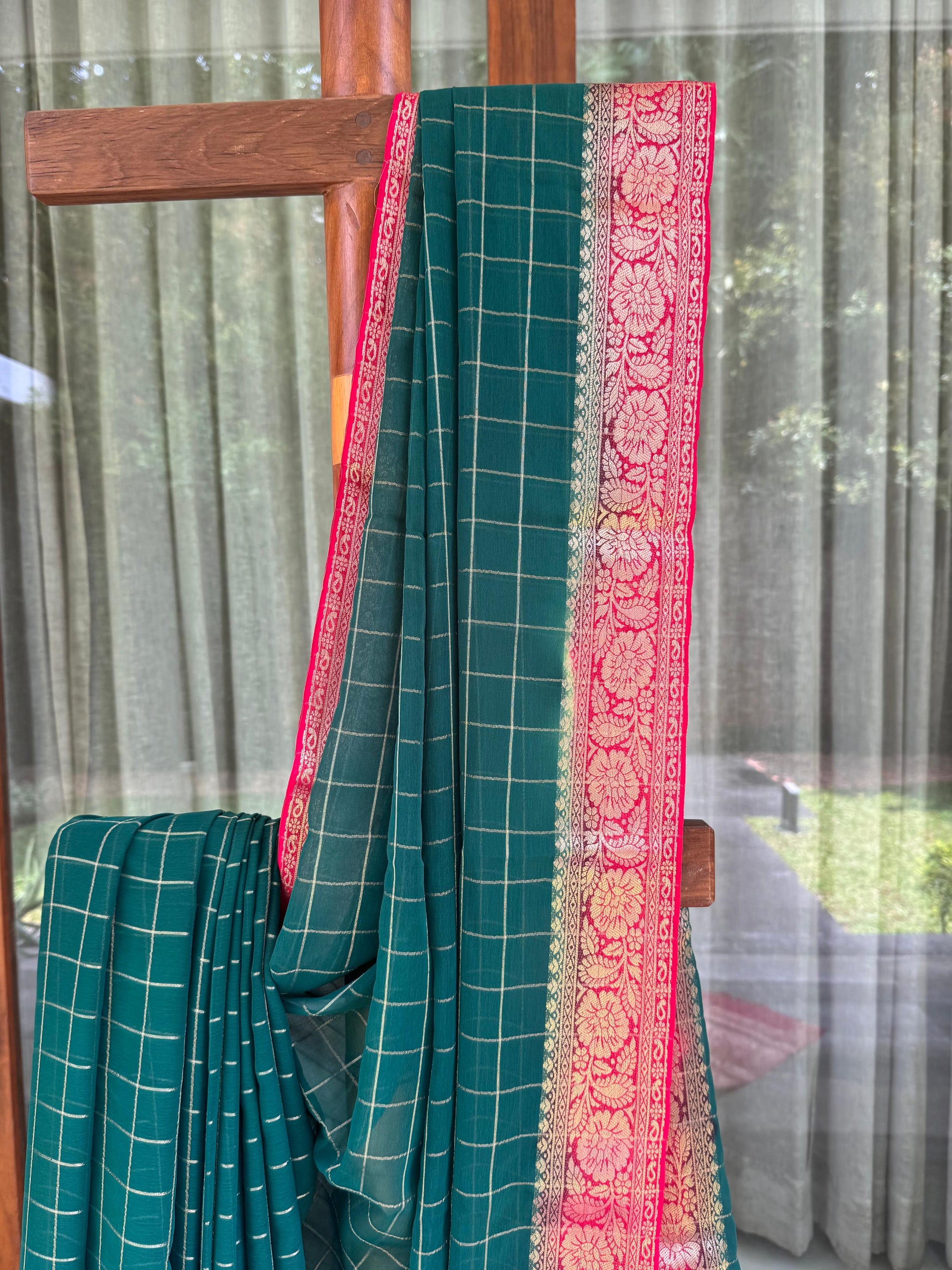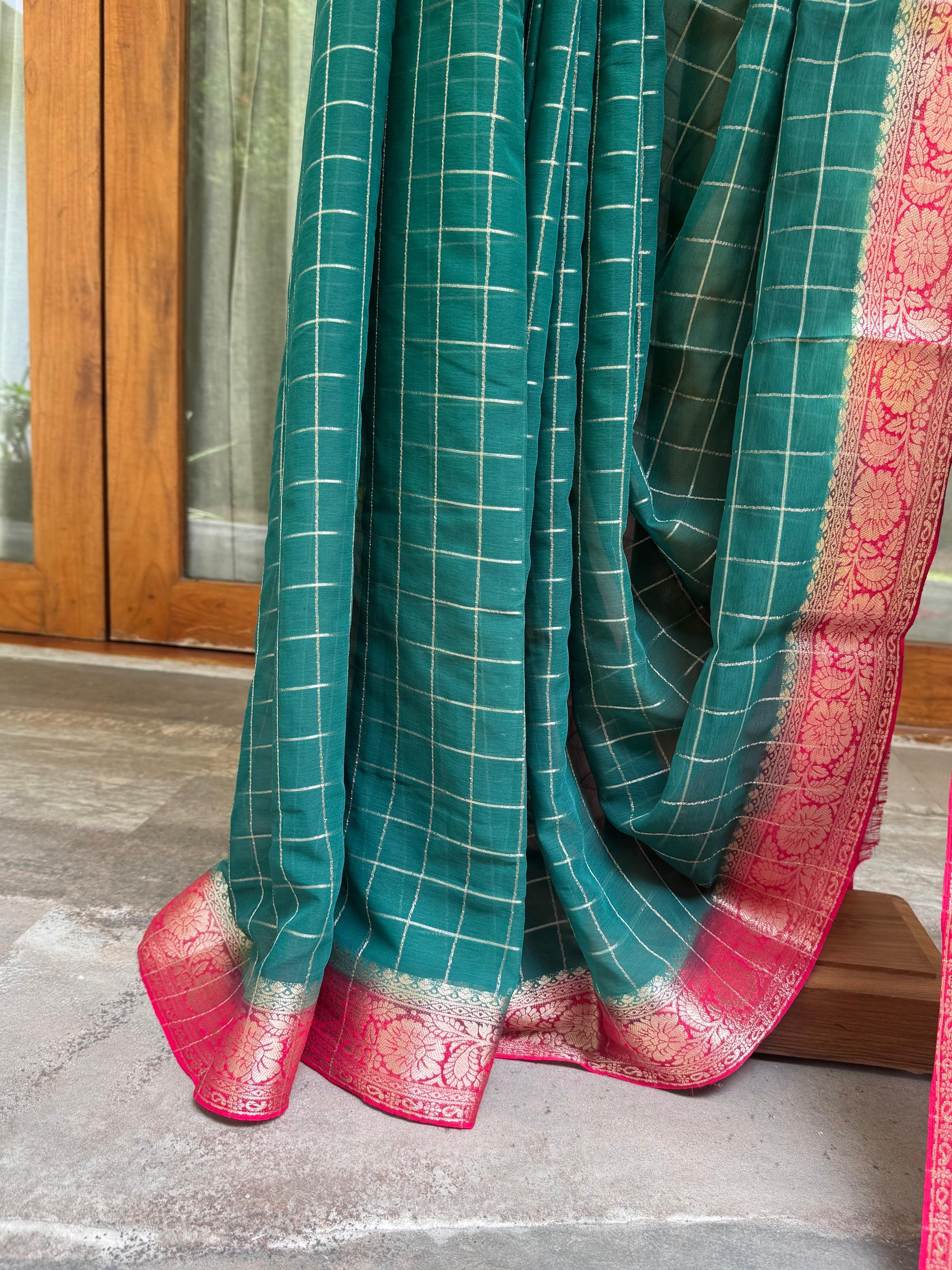The ensemble is paired with a contrasting red blouse piece, designed with green checks and finished with floral Banarasi borders. This thoughtful detailing adds depth and elegance, making it a perfect complement to the saree’s traditional yet trendy appeal.