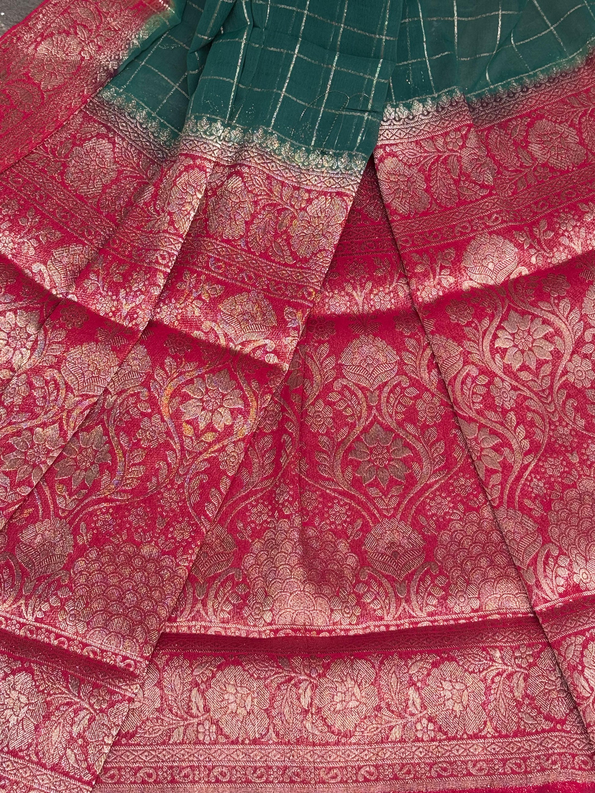 The saree features subtle checkered patterns woven across the body, adding a touch of texture and charm to the soft, flowing silhouette. Enhancing its visual appeal is the contrast red Banarasi work on the pallu and border, richly detailed with intricate motifs that bring in a classic, festive flair. The combination of vibrant red and calming green creates a striking yet balanced aesthetic.
