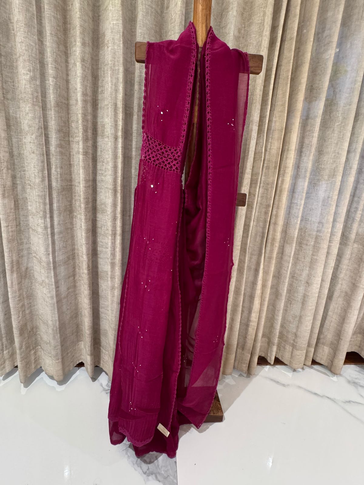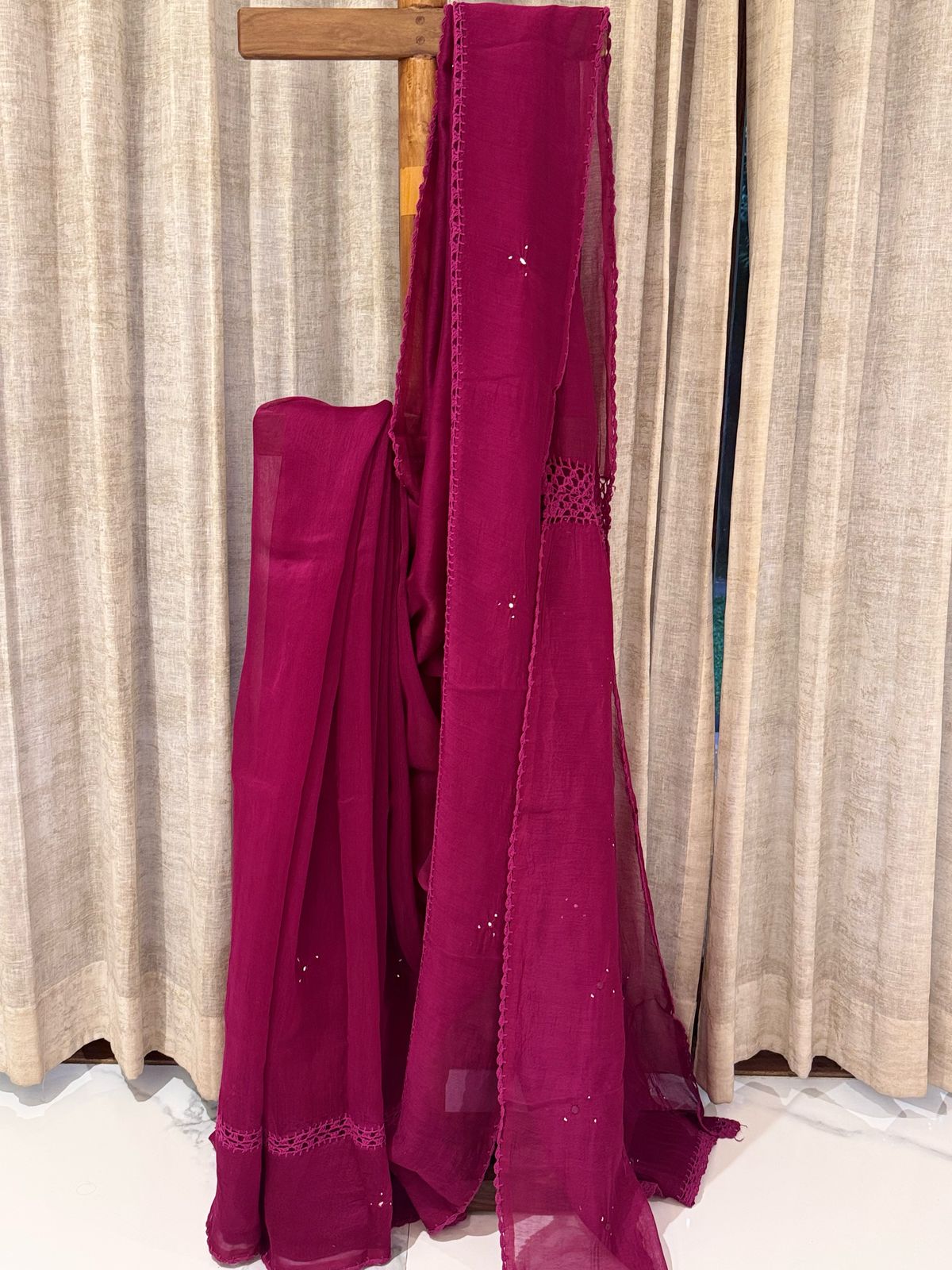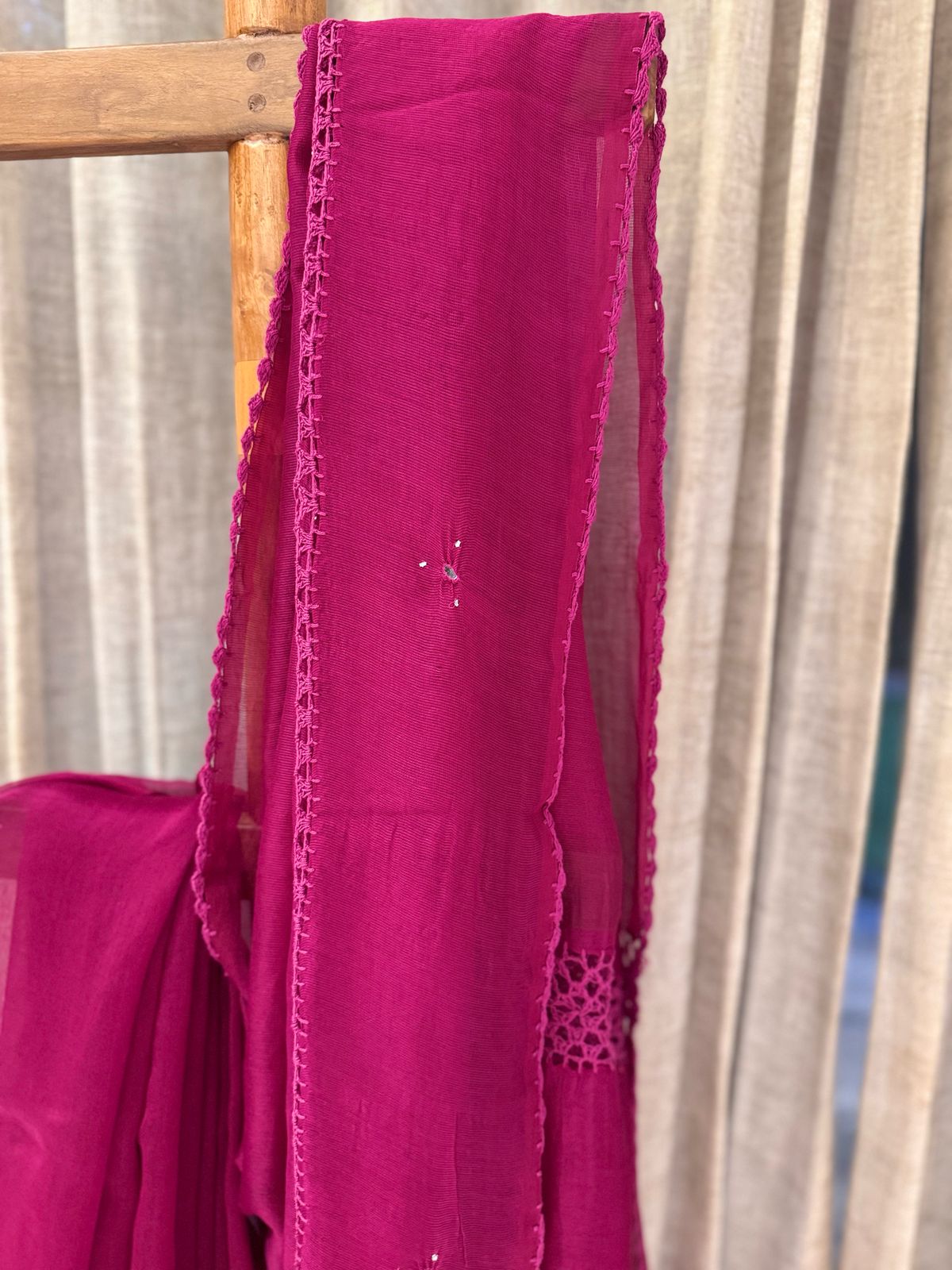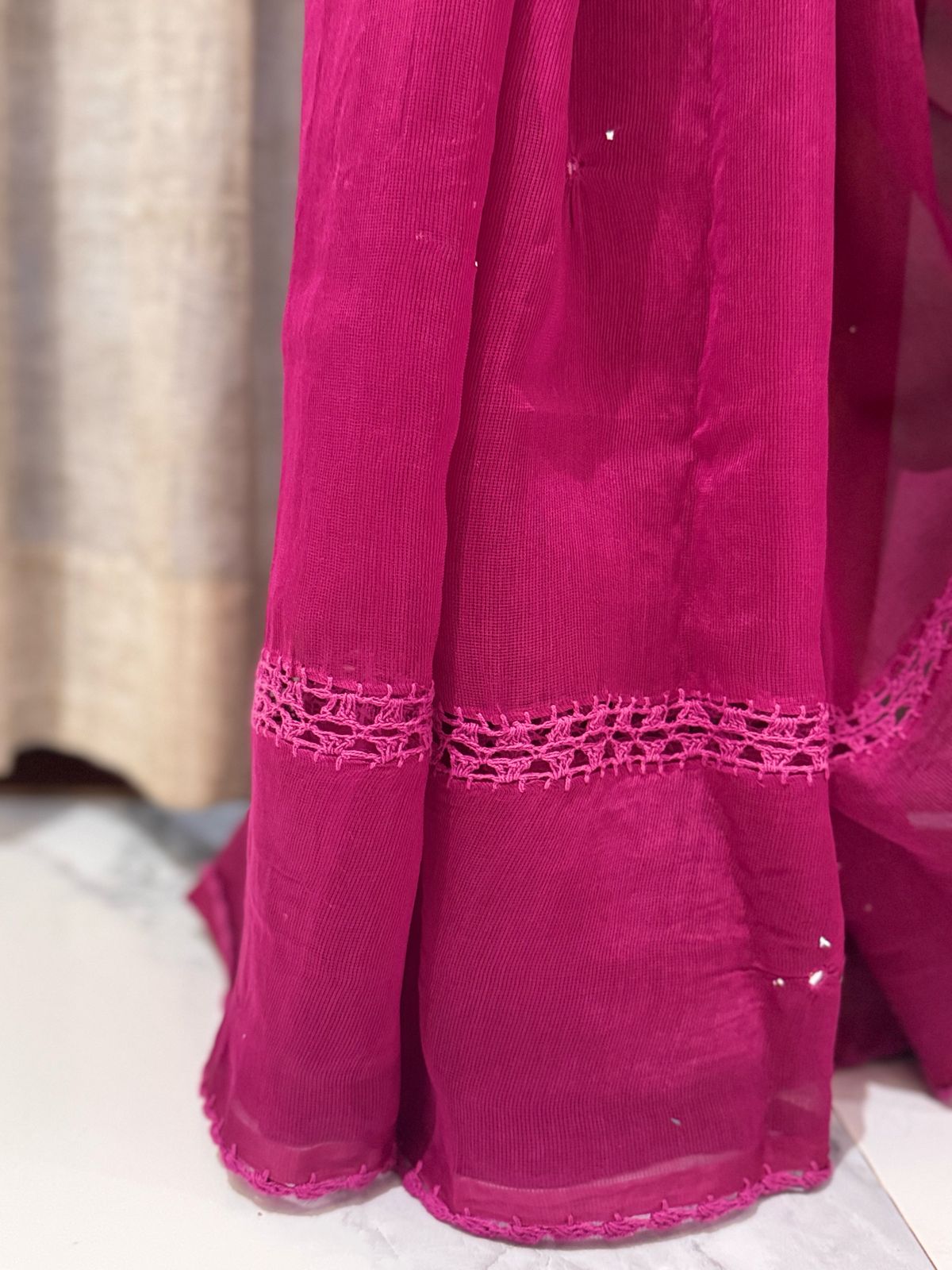 The ensemble is paired with a matching magenta pink blouse piece, featuring minimal crochet work along the border. This thoughtful touch ties the whole look together, adding continuity while allowing room for styling versatility — be it classic or contemporary.