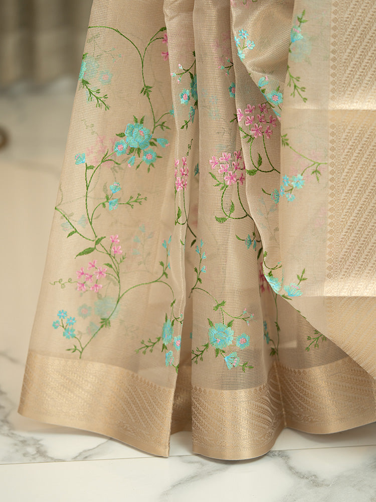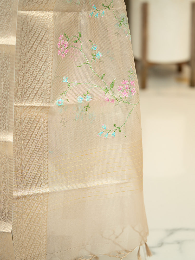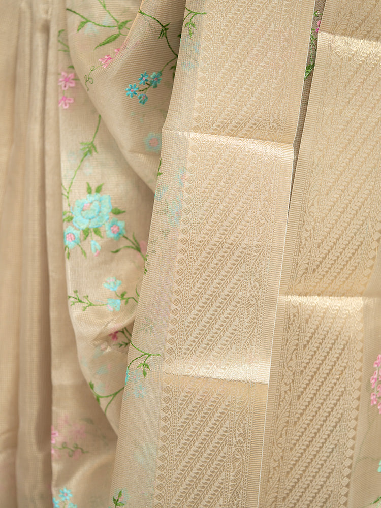 Cream Tissue Silk Saree with Floral Thread Work and Gold Zari Border