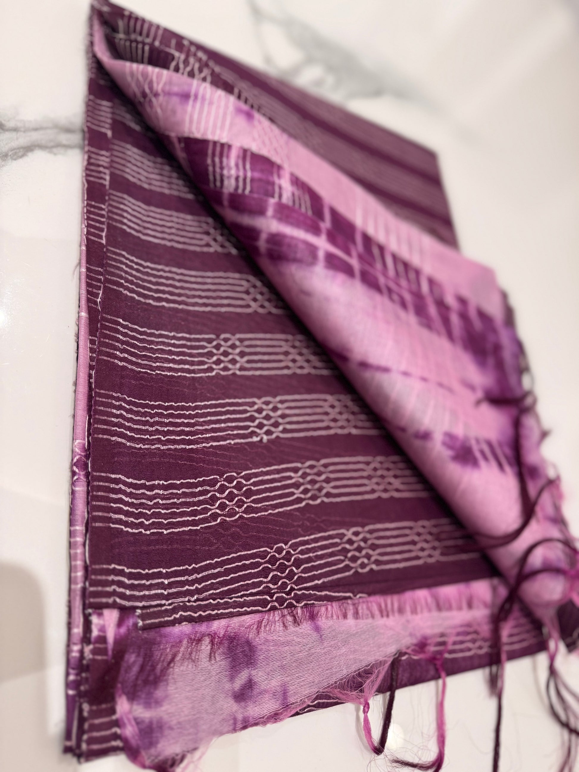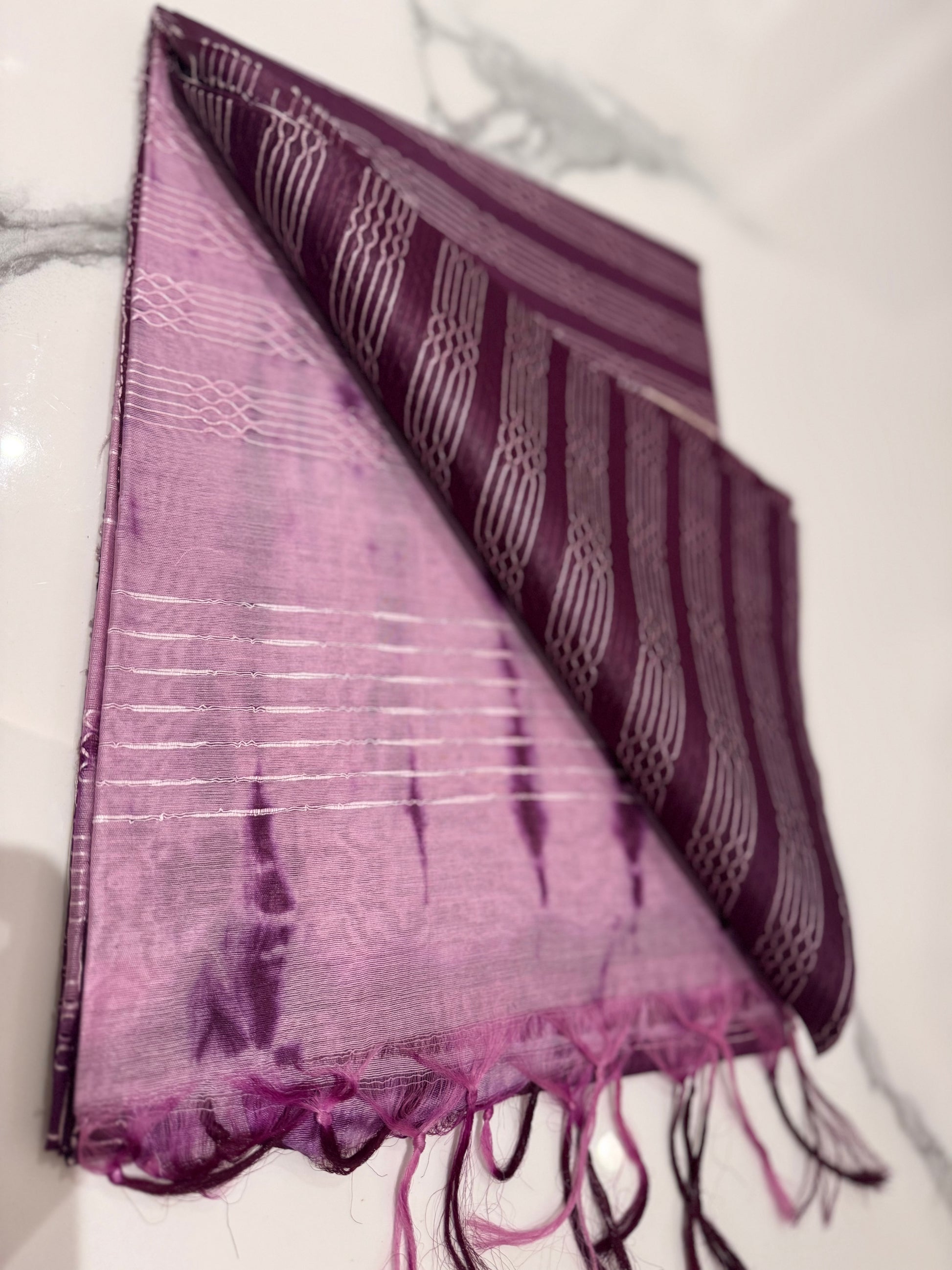 The pallu is adorned with hand-tied tassels in coordinated shades of wine and pink, giving the saree a playful yet refined finish. Lightweight and breathable, this saree is perfect for day-to-evening wear, offering both comfort and timeless charm.