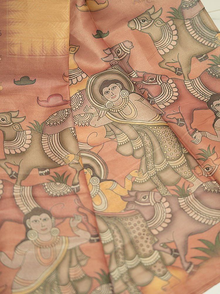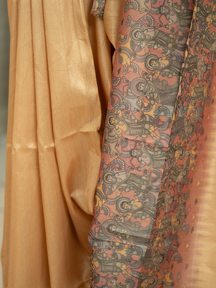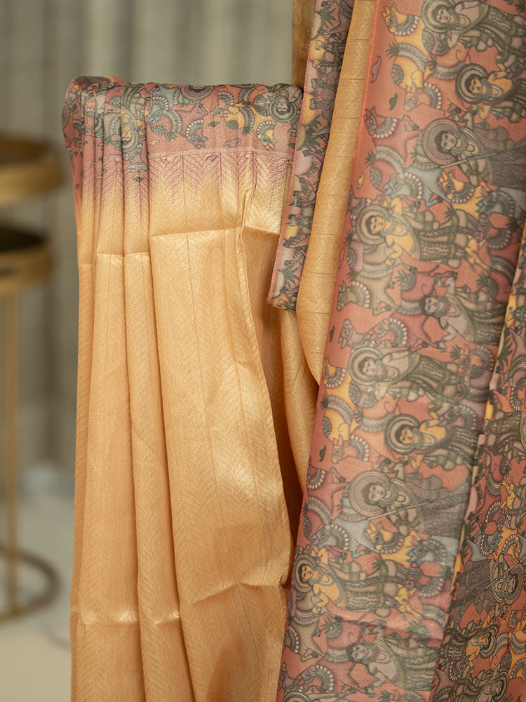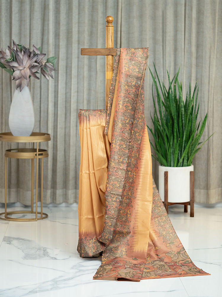 Digital Silk Saree with Amber Body and Kalamkari Work Border