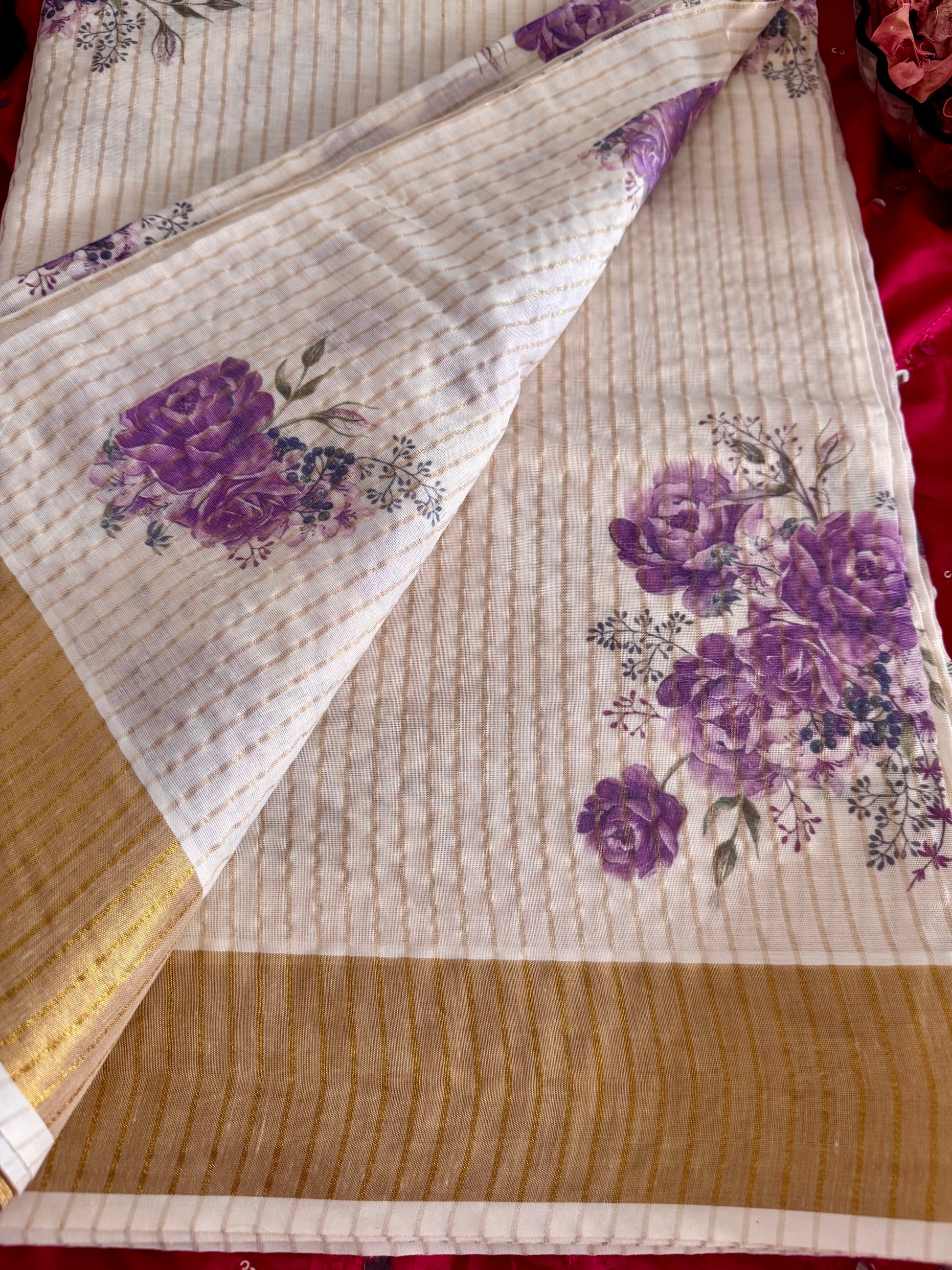 Add a touch of elegance to your wardrobe with this beautiful Cotton Kerala Saree, featuring a soft off-white base enriched with golden zari stripes throughout. The saree is adorned with stunning lavender floral digital prints, creating a soothing and graceful look.
