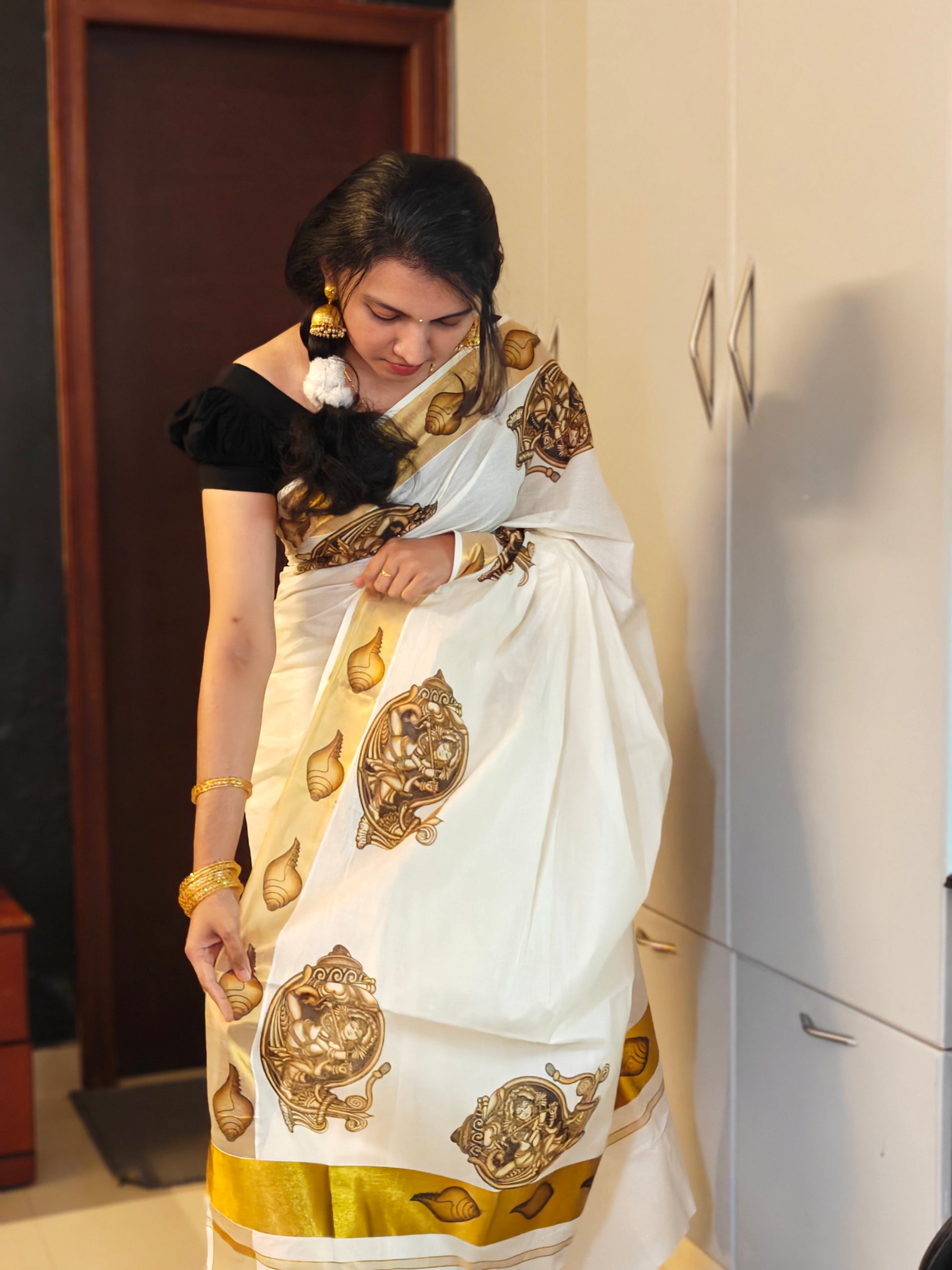 Celebrate tradition with this exquisite Kerala cotton saree, adorned with intricate prints of Lord Krishna and classic conch shell motifs. The soft, breathable cotton drapes gracefully, while the off-white base and golden-toned borders exude timeless charm. Perfect for festive occasions, temple visits, and cultural celebrations, this saree beautifully blends heritage art with everyday comfort.