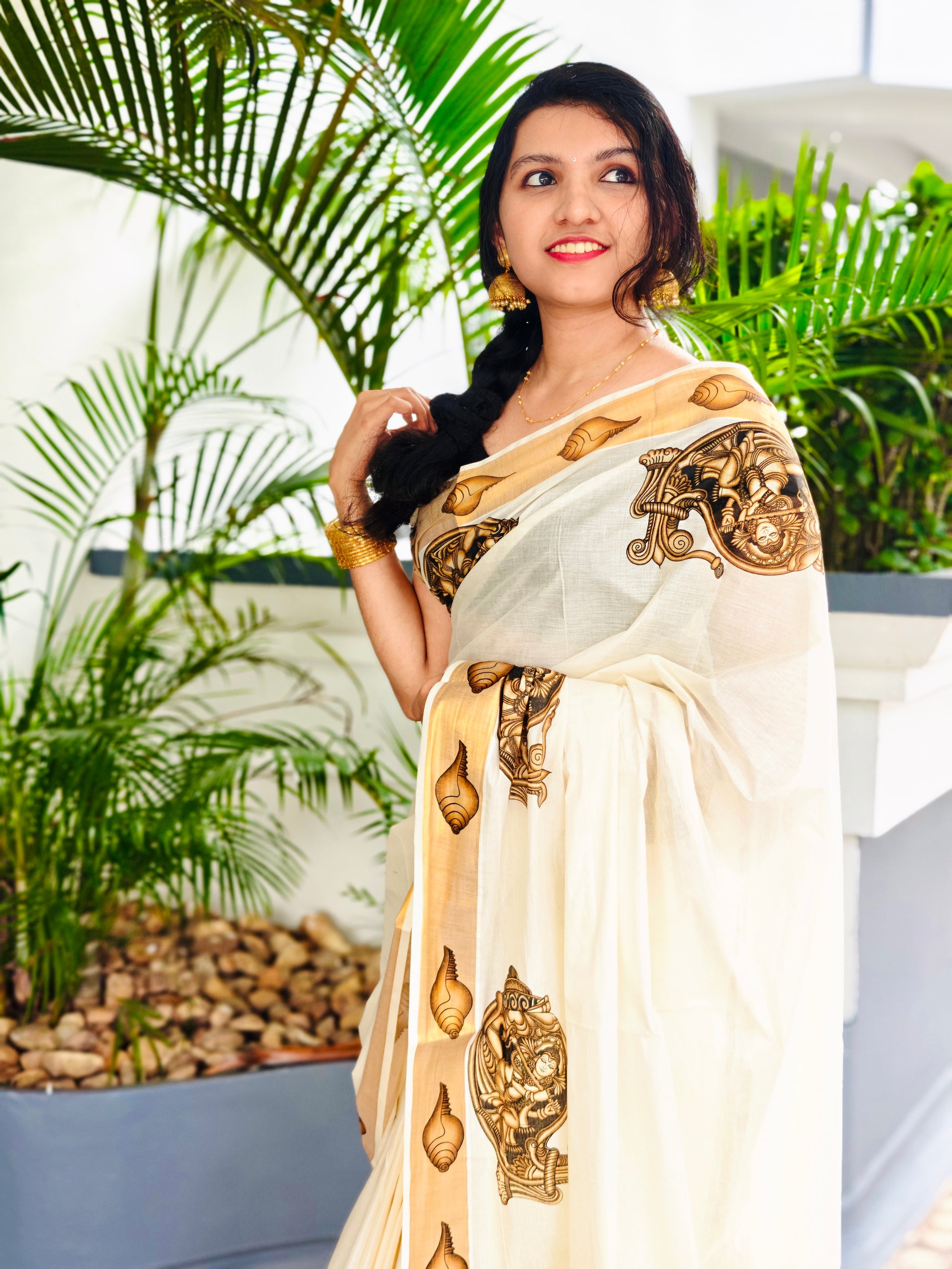 - Design: Krishna and conch shell prints in earthy tones