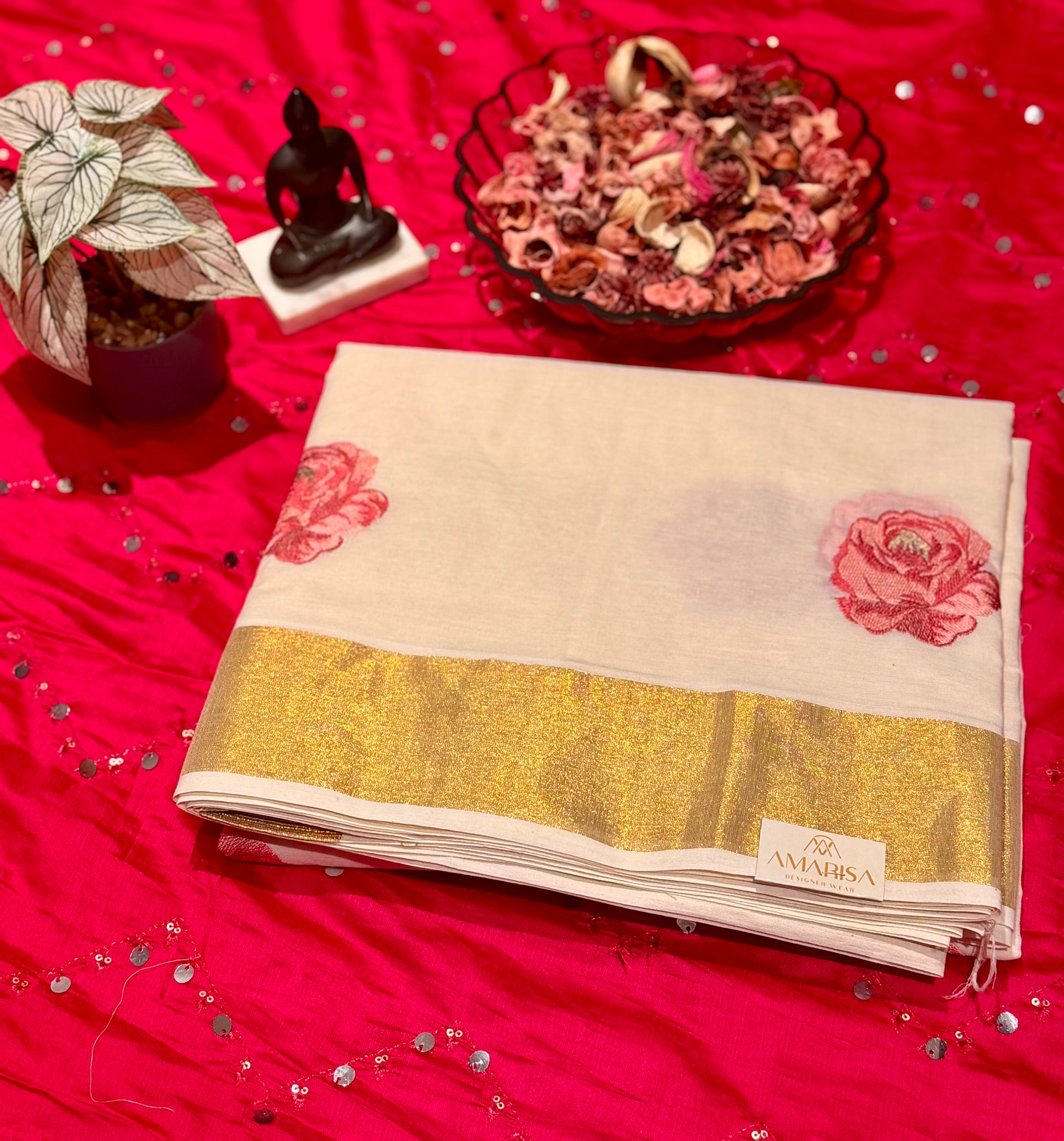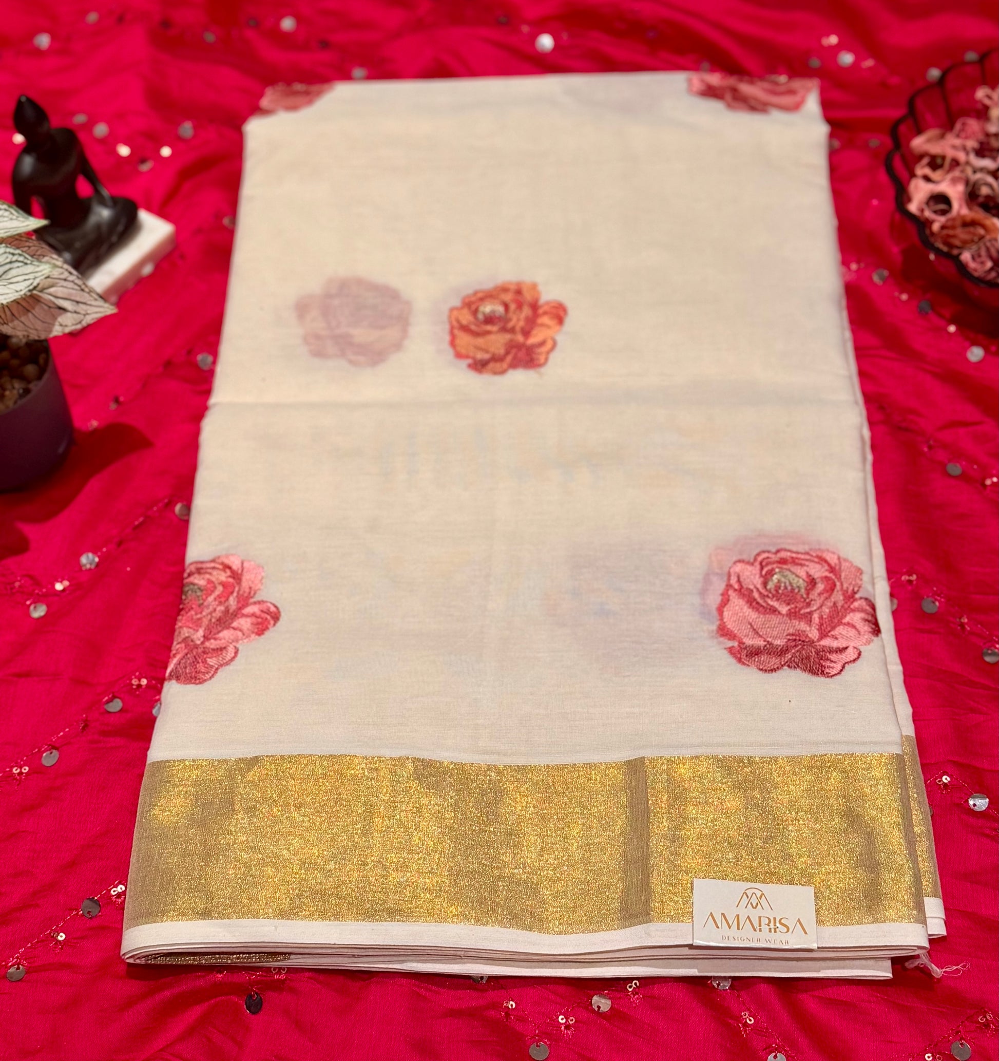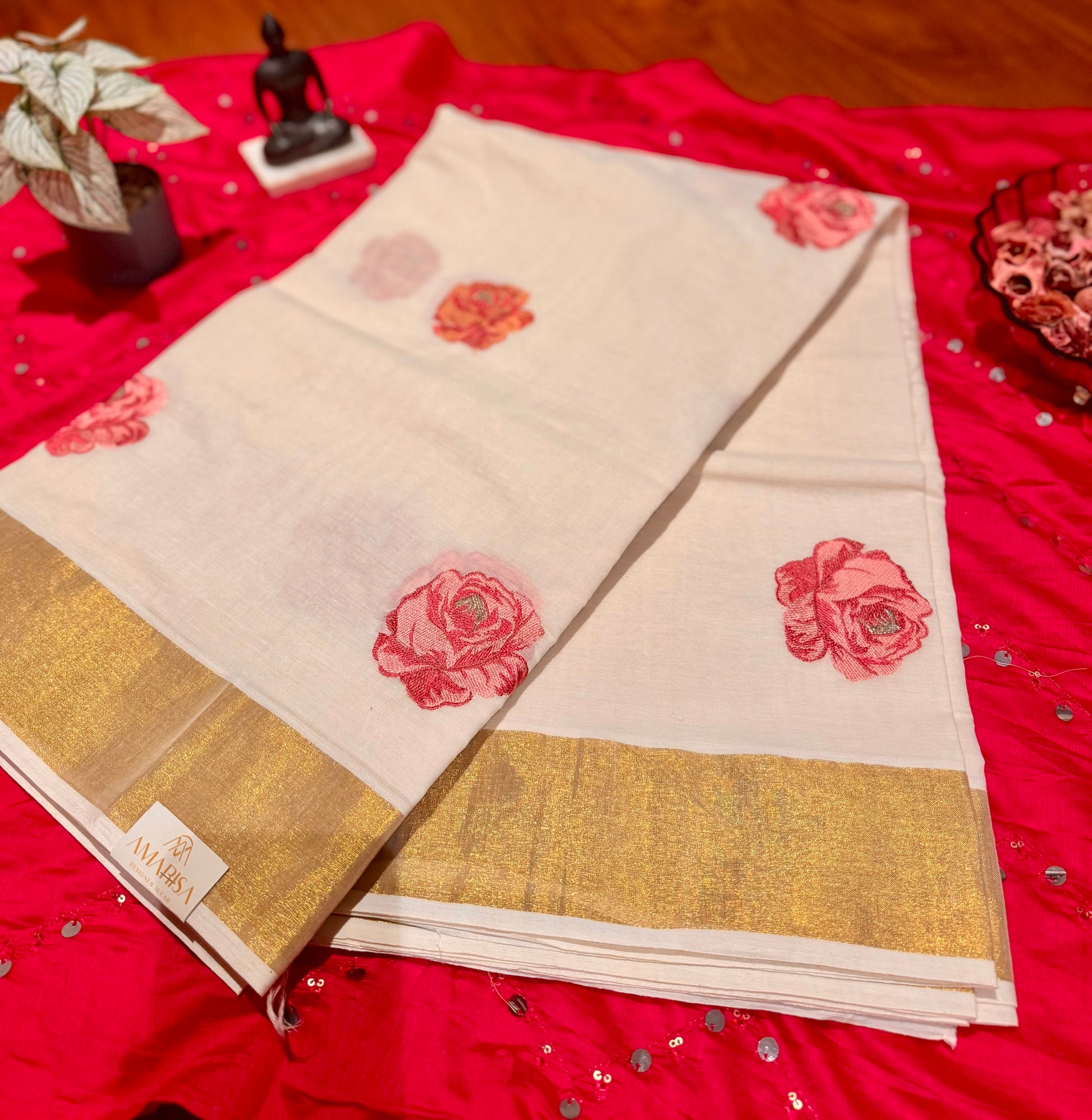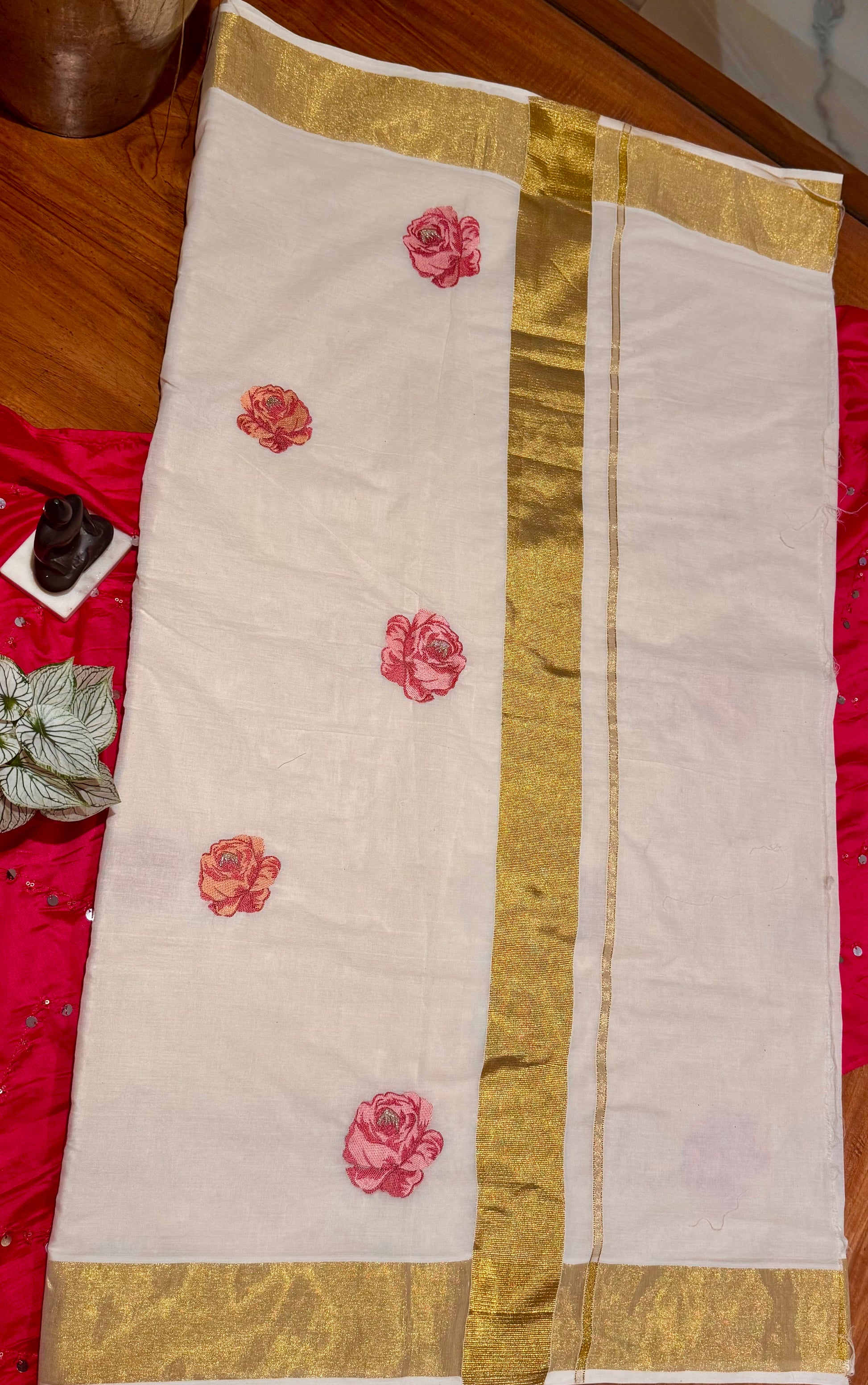 Embrace timeless tradition with a touch of modern charm in this beautiful Kerala tissue cotton saree. Crafted in a classic off-white base, the saree features delicate rose flower embroidery in vibrant shades of pink and red, adding a graceful feminine touch. The broad golden zari border enhances its festive elegance, making it perfect for traditional occasions, temple visits, and cultural celebrations. Lightweight and breathable, this saree is ideal for all-day comfort with effortless style.