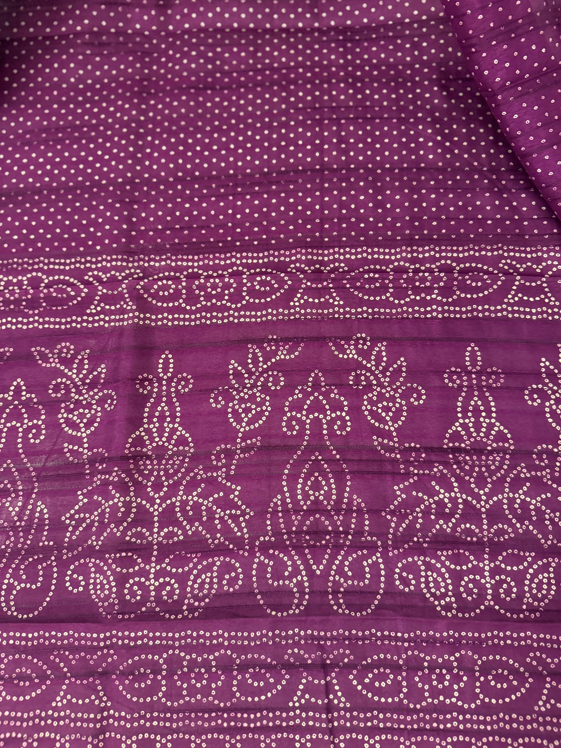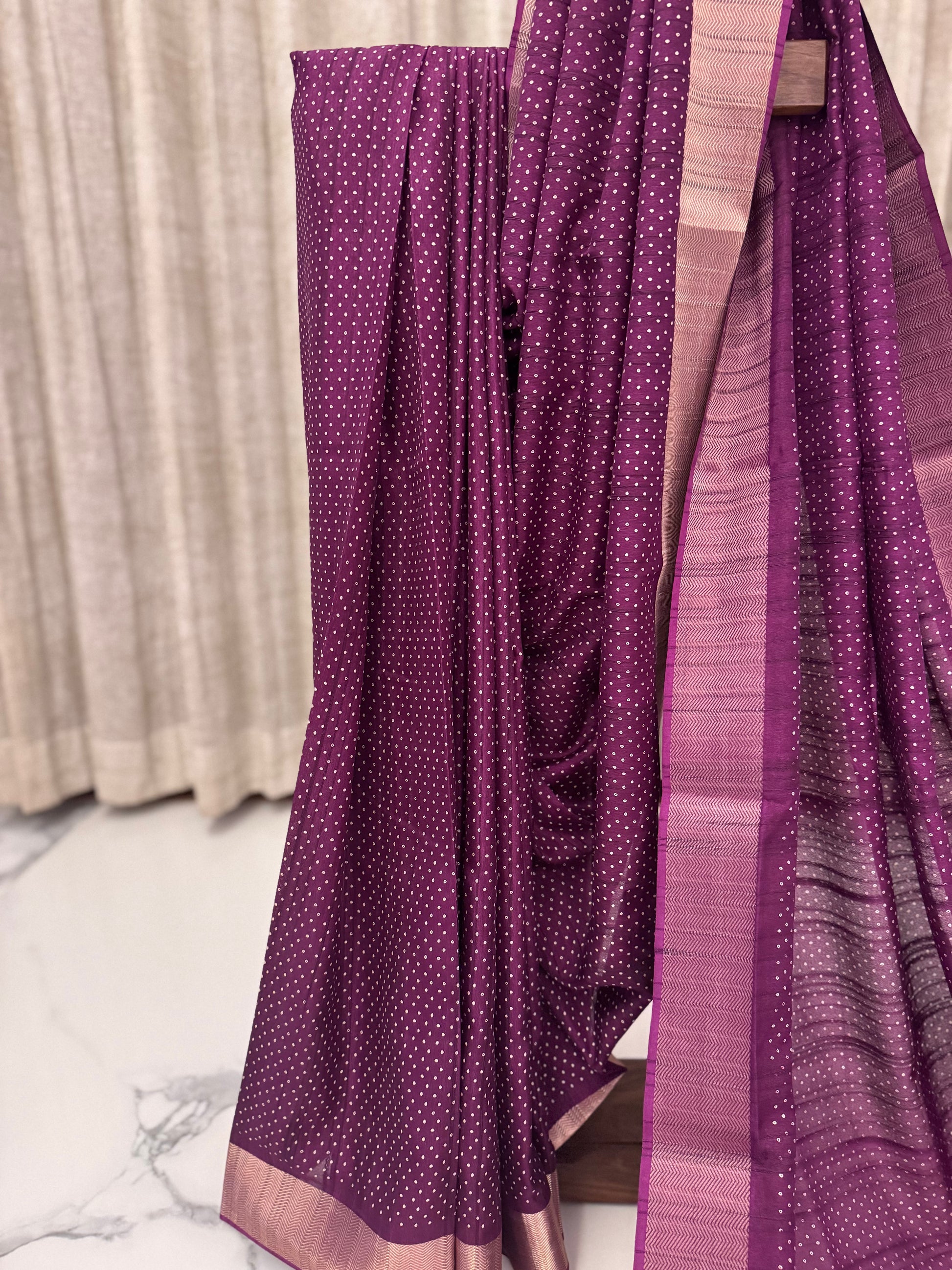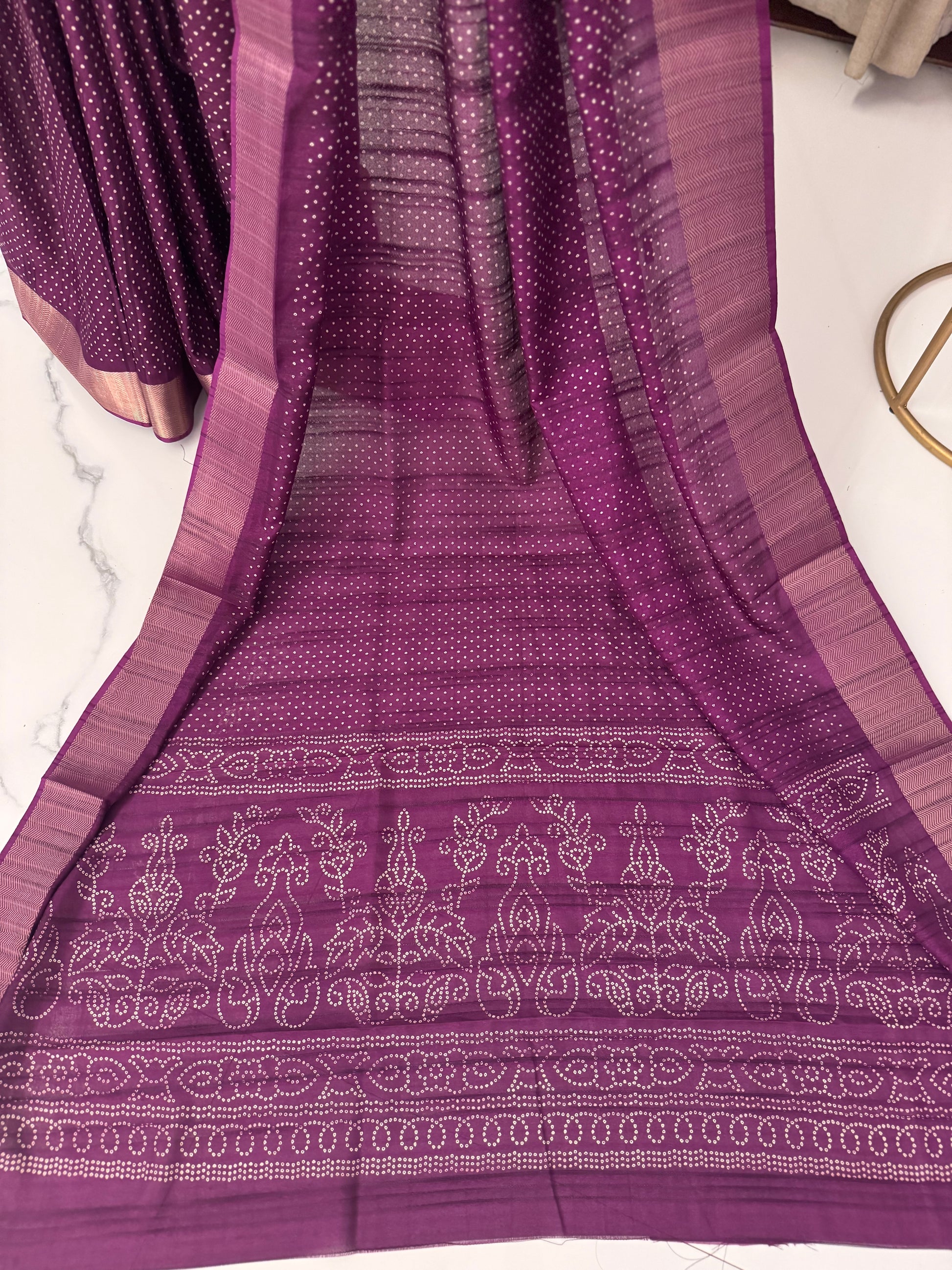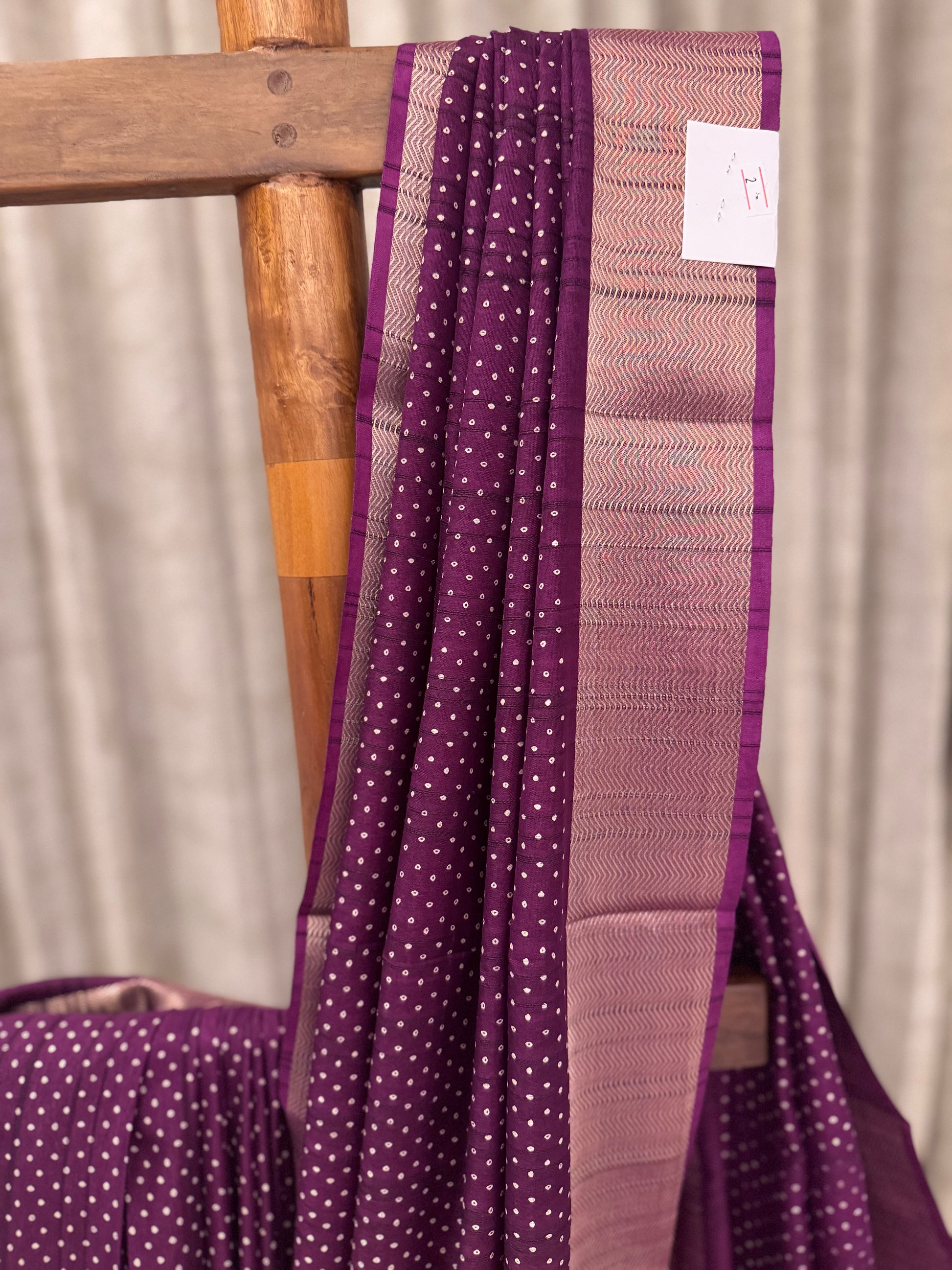 Elevate your ethnic wardrobe with this graceful semi tussar saree in a rich purple hue, adorned with delicate white dots spread evenly across the body. The subtle dotted pattern adds a timeless charm, making it perfect for both casual gatherings and festive occasions.