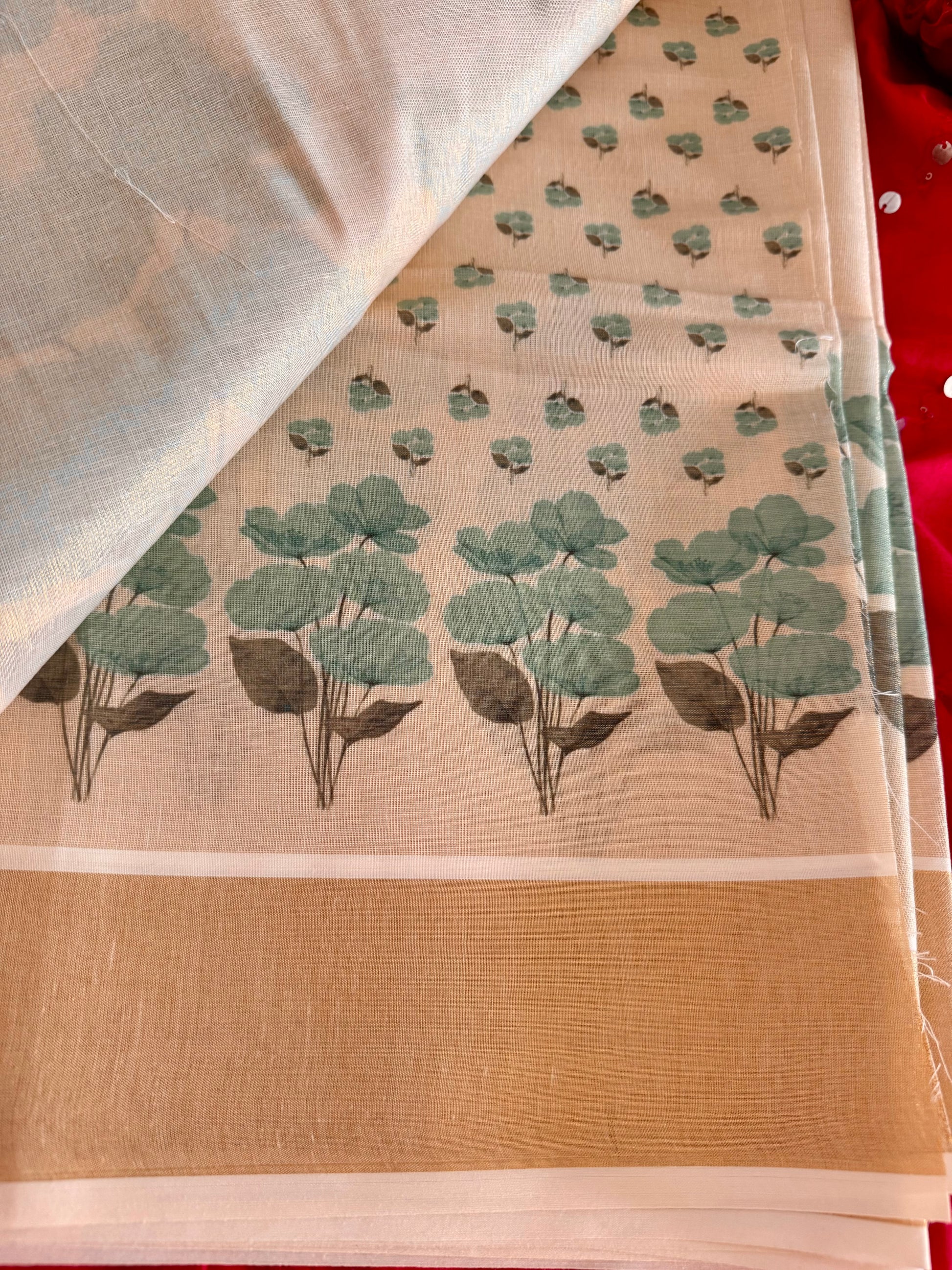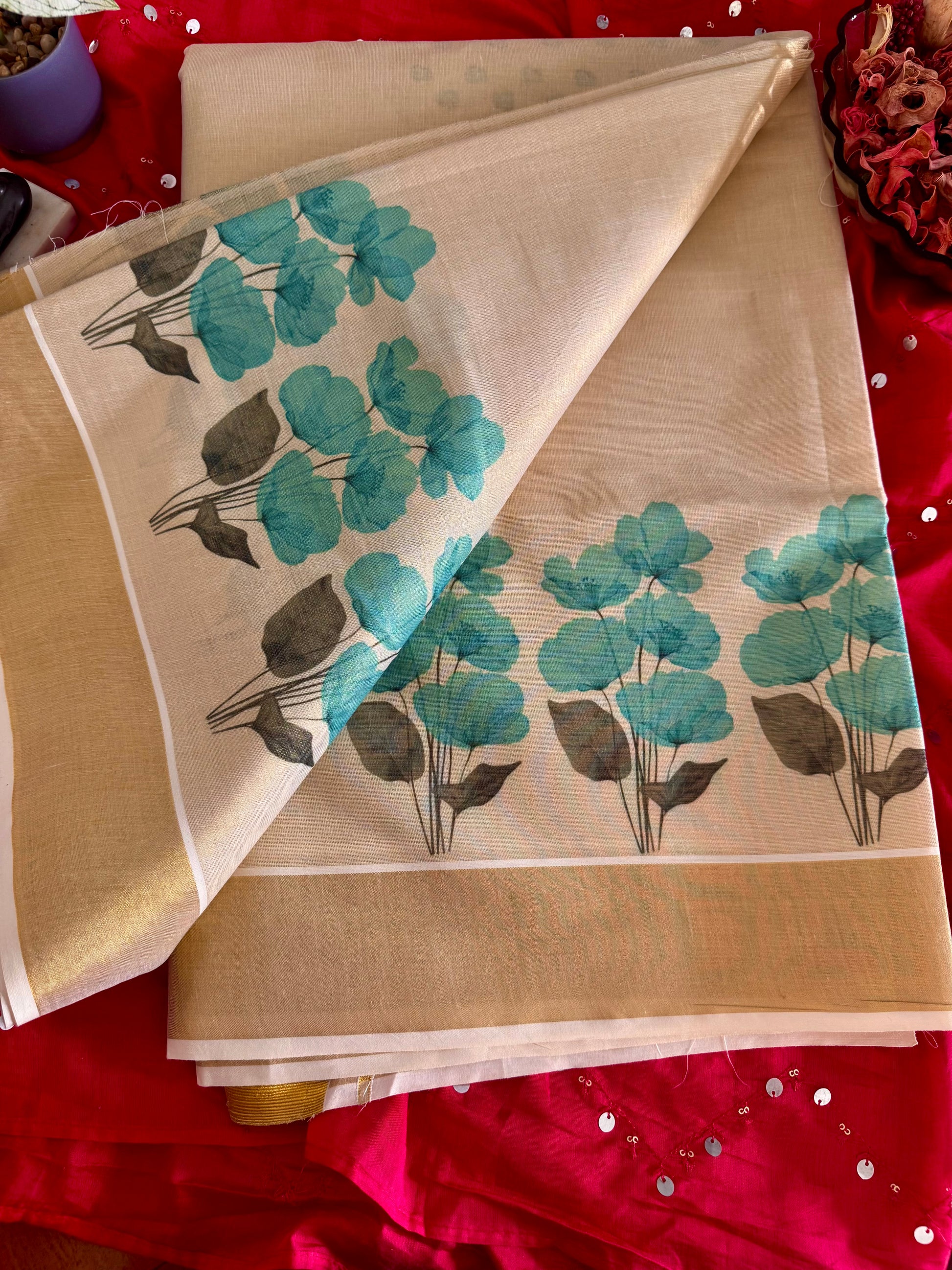 Step into timeless elegance with this exquisite Kerala tissue cotton saree crafted in soft tissue weave. The saree features a serene beige base complemented by subtle sheen, adorned with vertical botanical prints in calming teal blue hues.