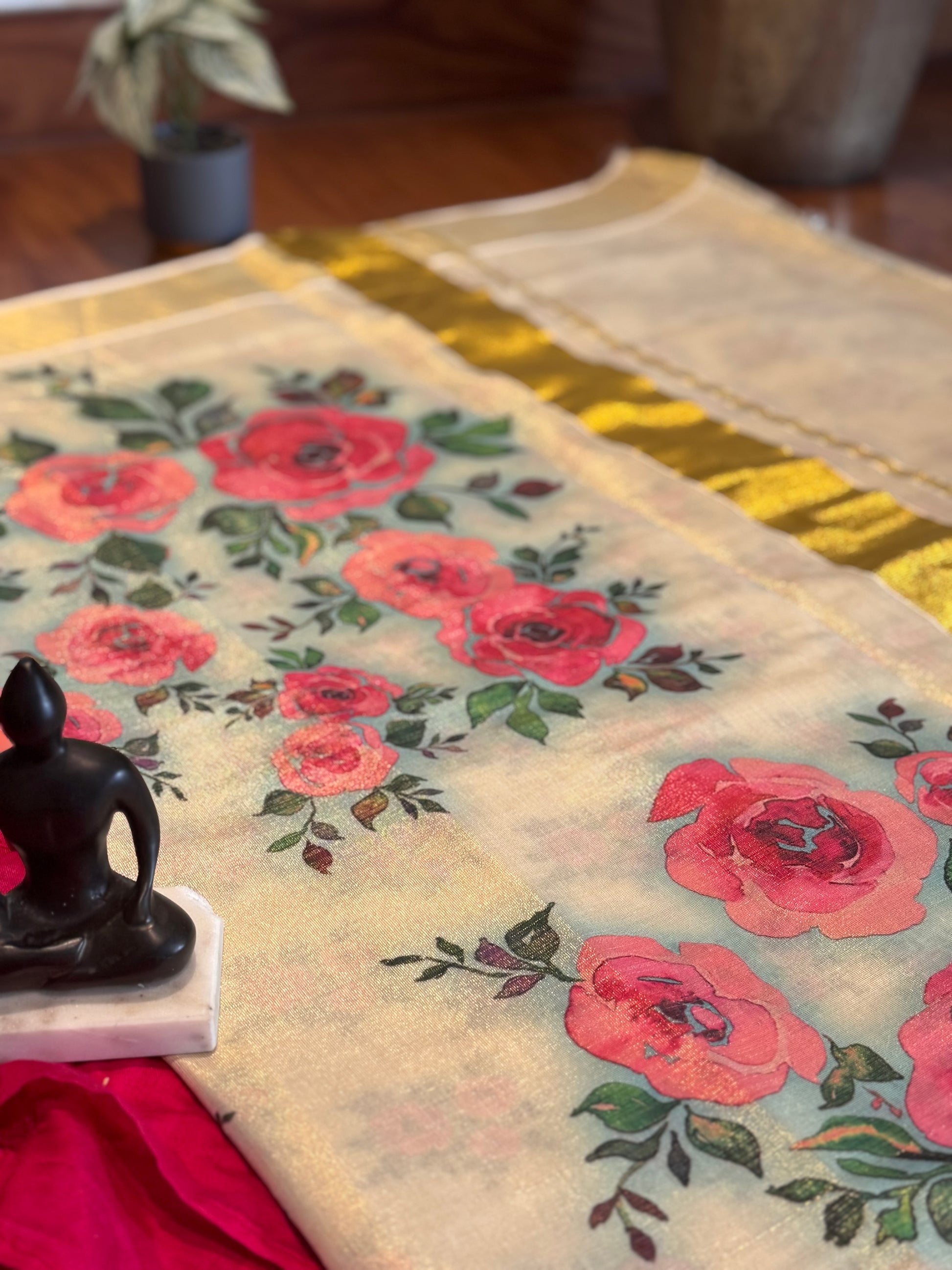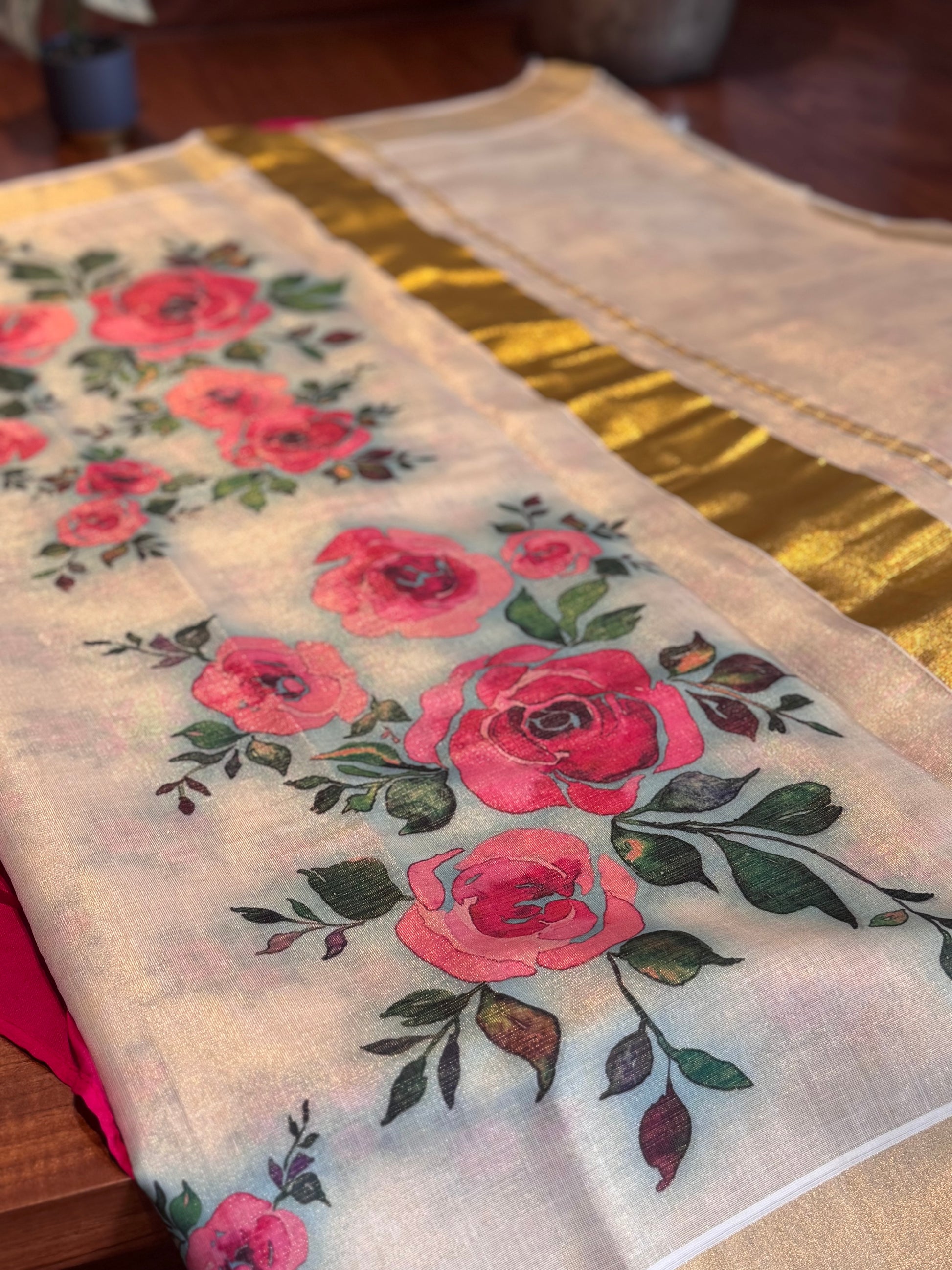 Grace meets glamour in this exquisite Kerala tissue cotton saree, featuring a soft golden sheen and delicate texture. The saree is beautifully adorned with vibrant hand-painted-style floral motifs in rich shades of pink, creating a stunning contrast against the subtle shimmer of the body.