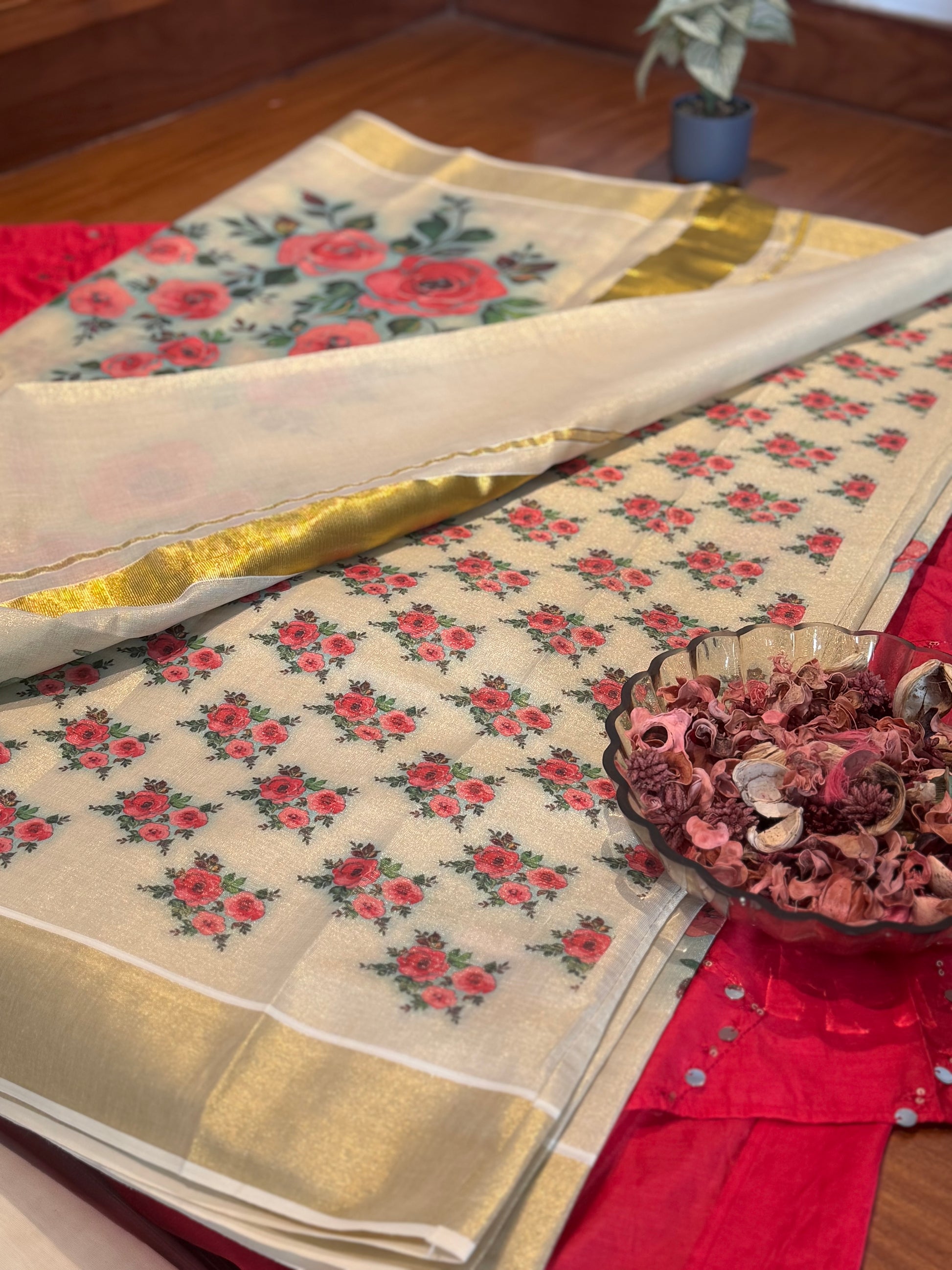 Elegant Tissue Kerala Cotton Saree with Floral Prints