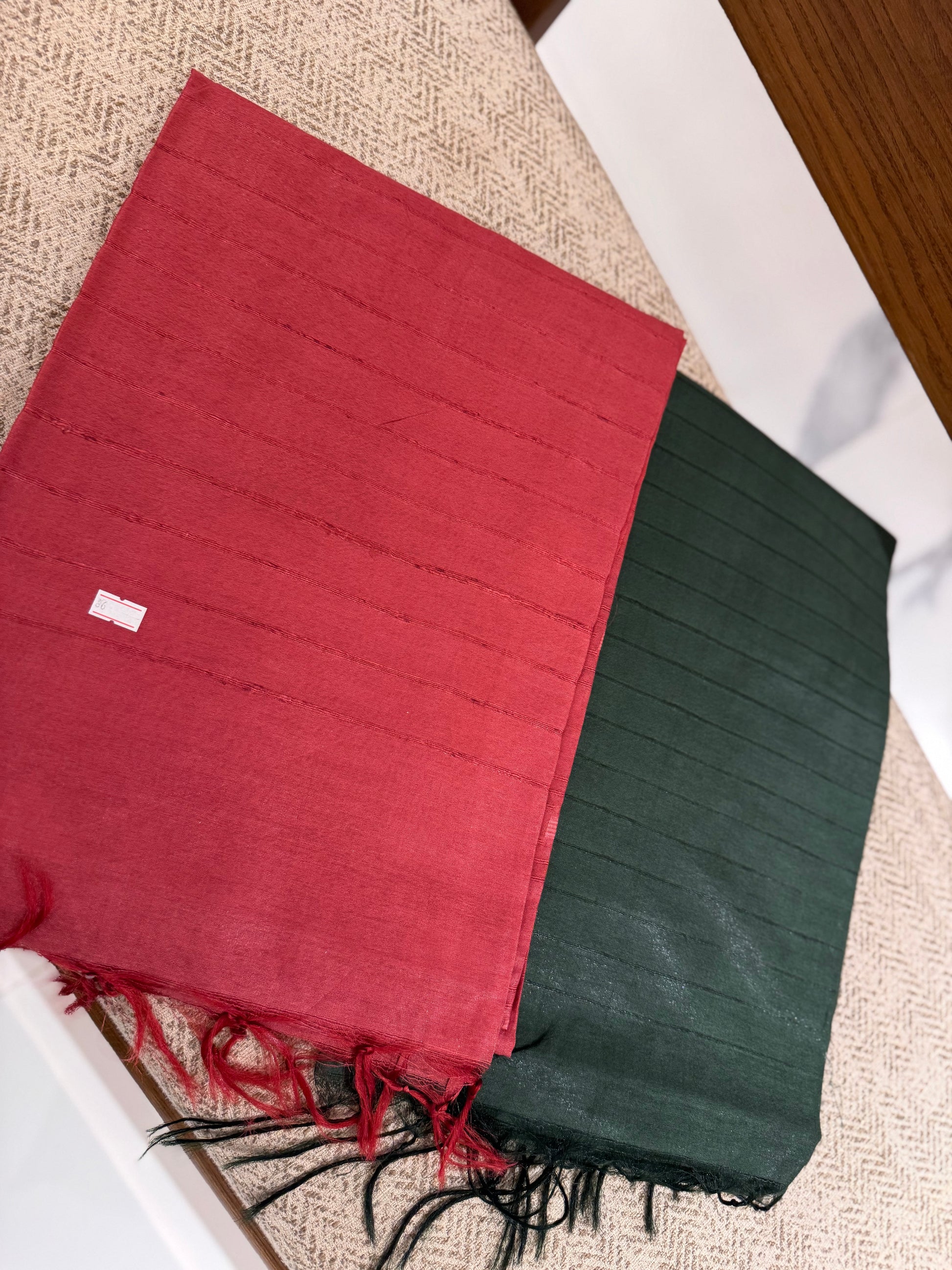 Discover timeless elegance with our fancy cotton sarees, crafted for effortless style and comfort. Featuring subtle horizontal textures, these sarees come in hues of red and bottle green, perfect for both casual gatherings and festive occasions.