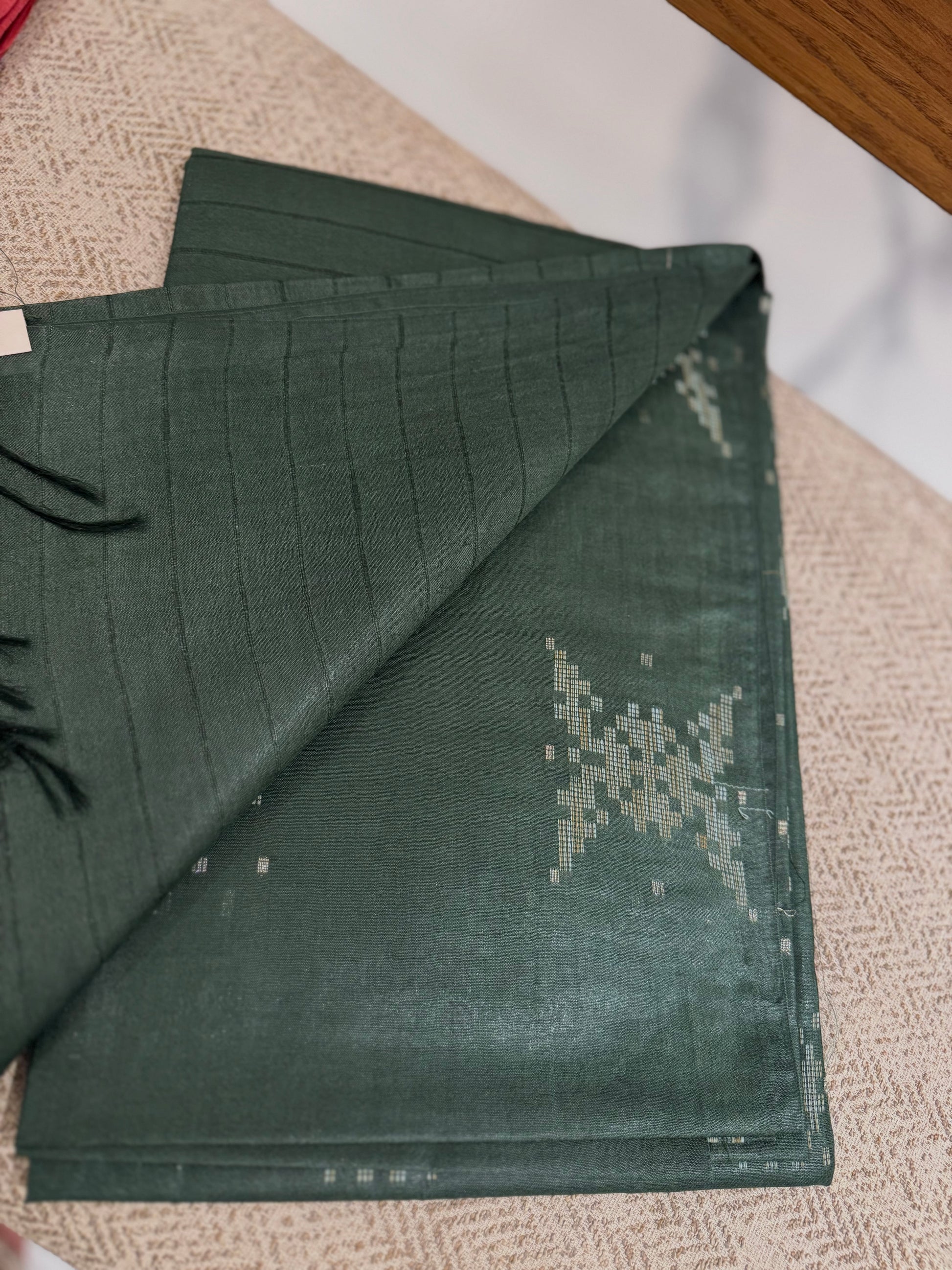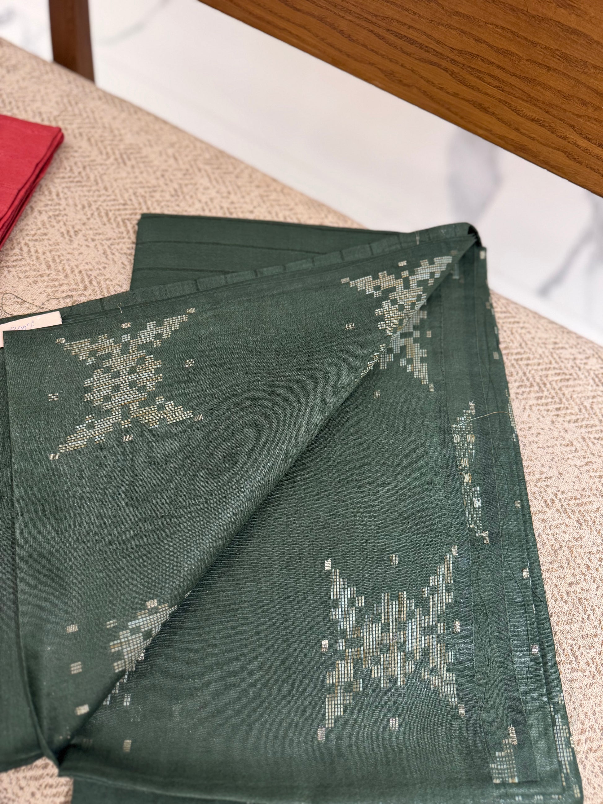 The green saree showcases delicate geometric motifs, adding a refined touch of tradition. Light, breathable, and gracefully draped, these sarees are ideal for all-day wear with a sophisticated charm.
