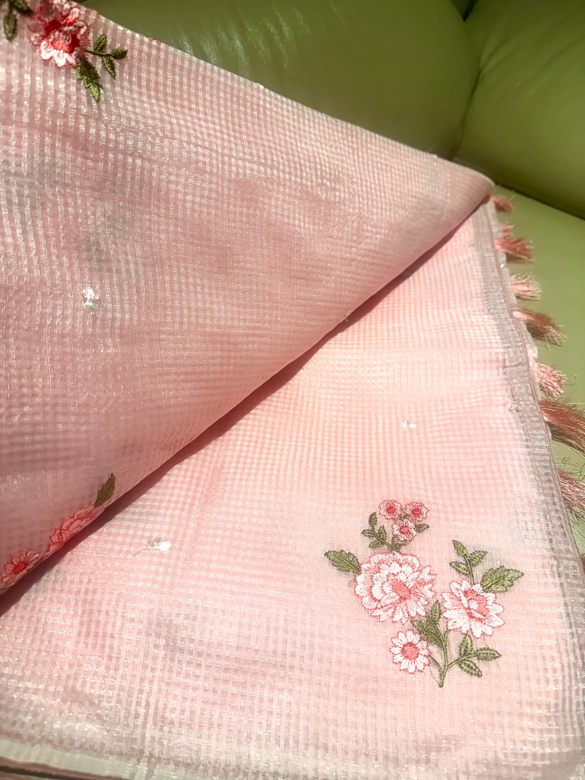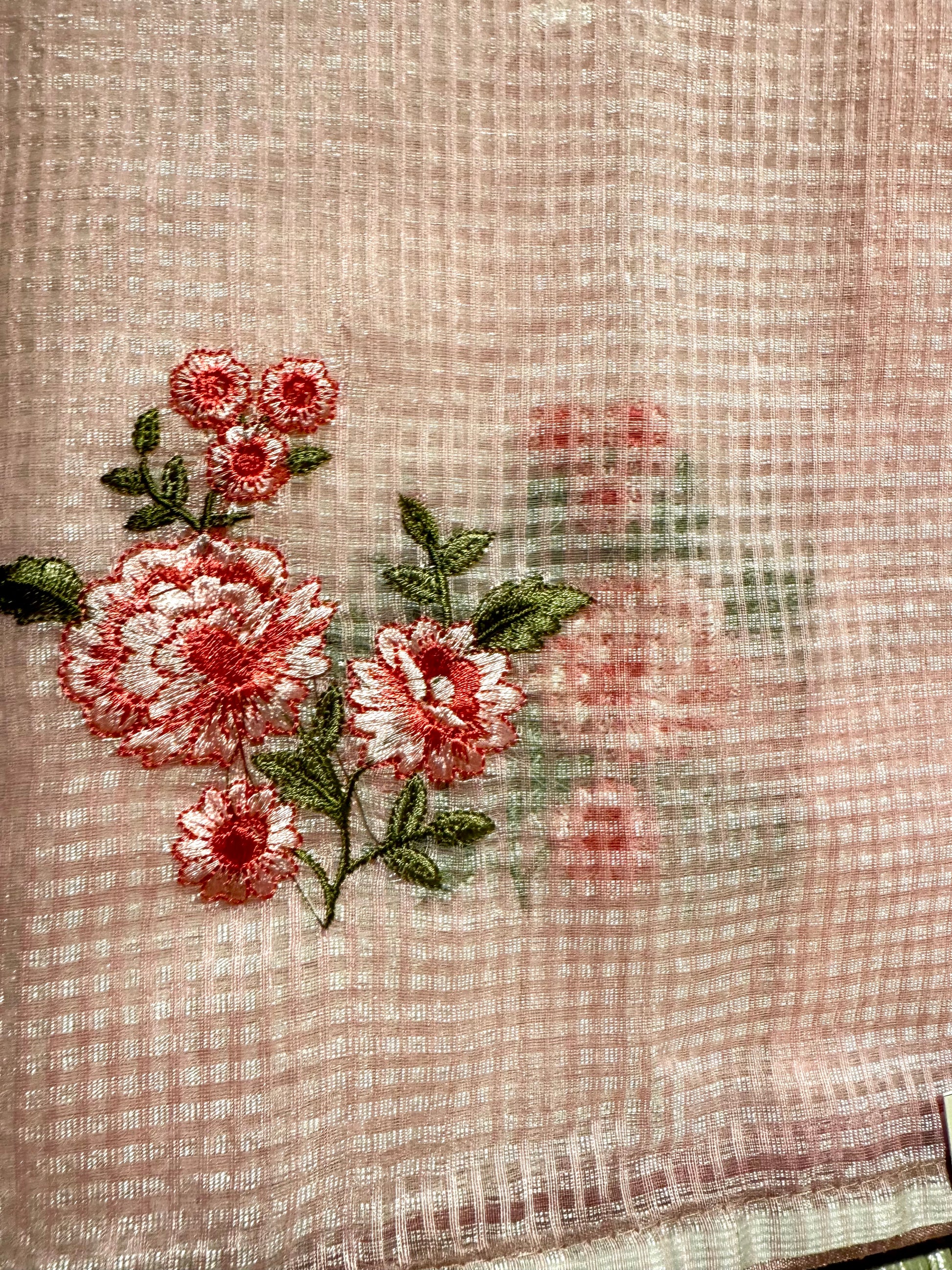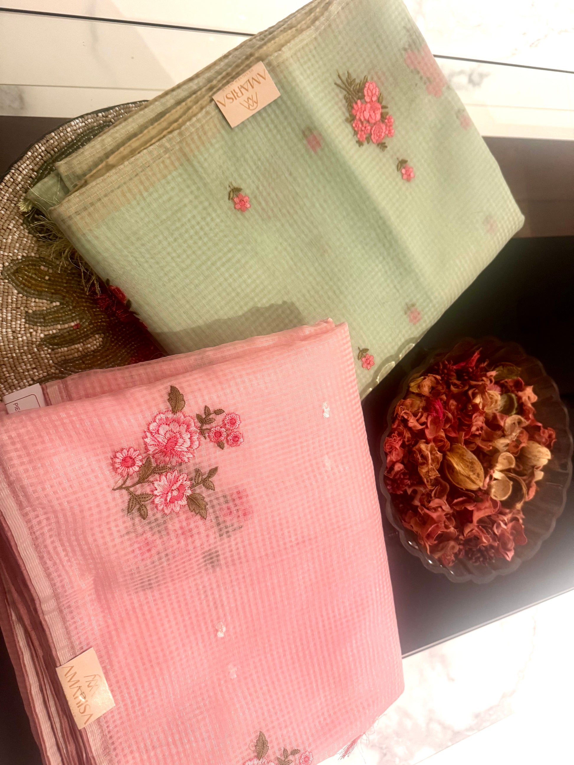 Elevate your elegance with these lightweight Fancy Kota sarees in two charming shades — soft pink and pista green. Crafted with a delicate self-checks texture and adorned with fine floral thread embroidery, these sarees bring together grace, freshness and everyday sophistication.