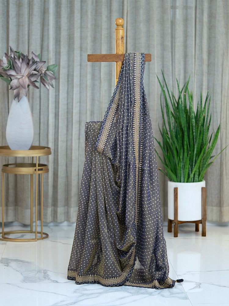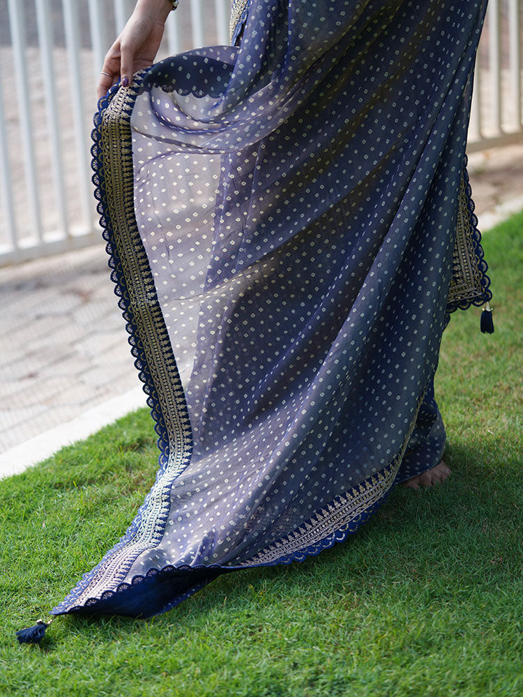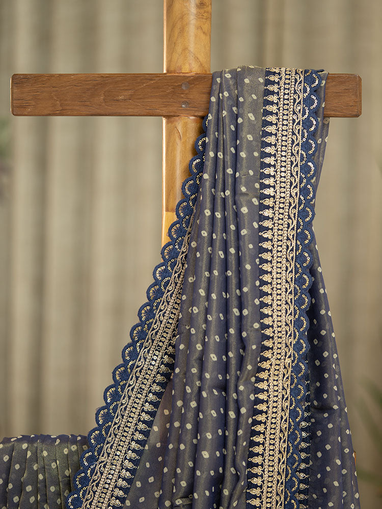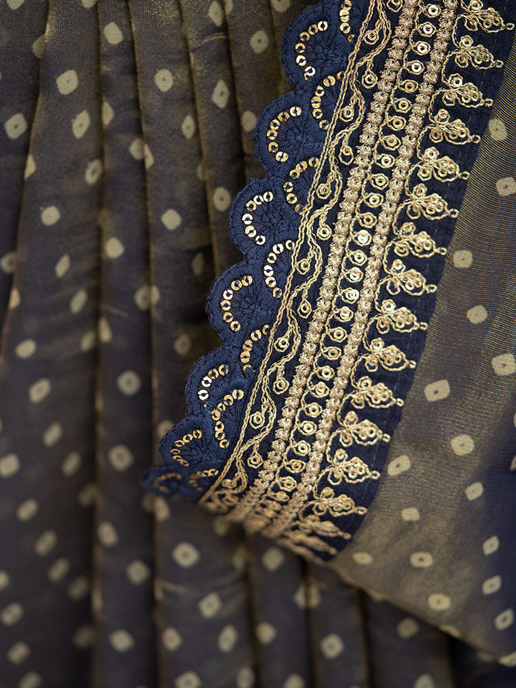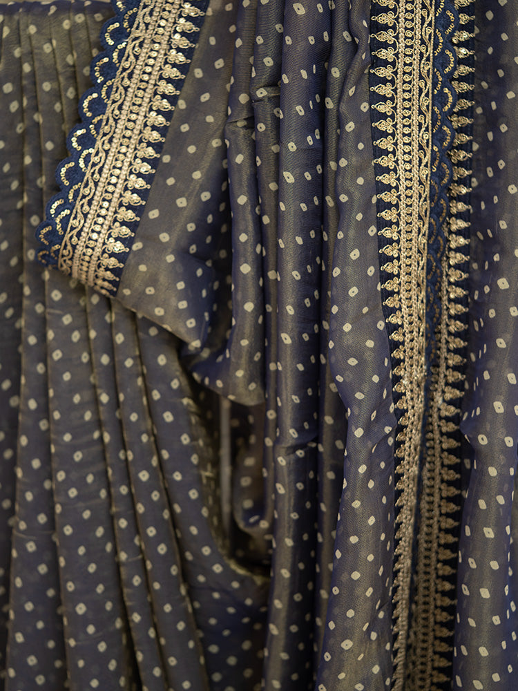 Georgette Tissue Saree in Navy Blue with Bandhini Work and Scalp Border