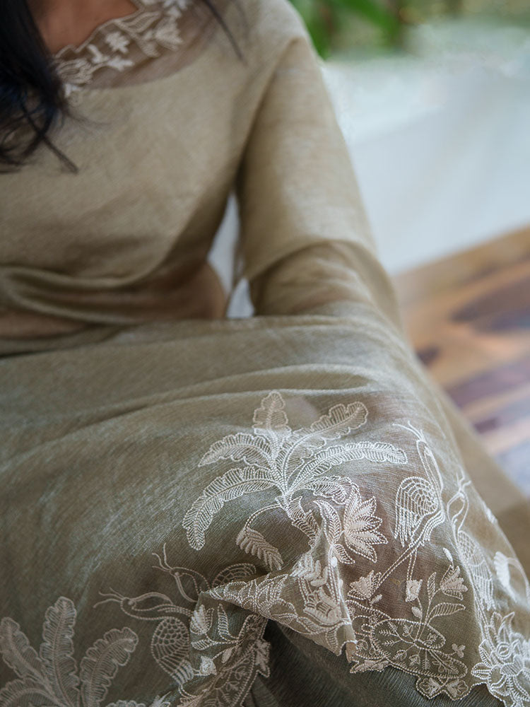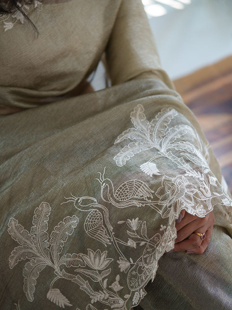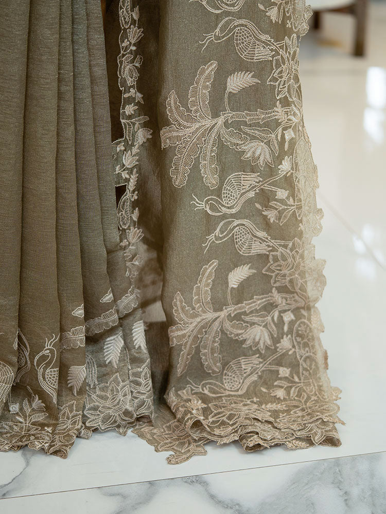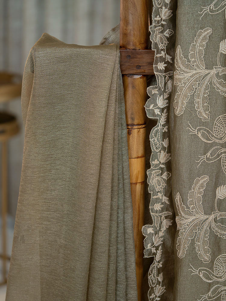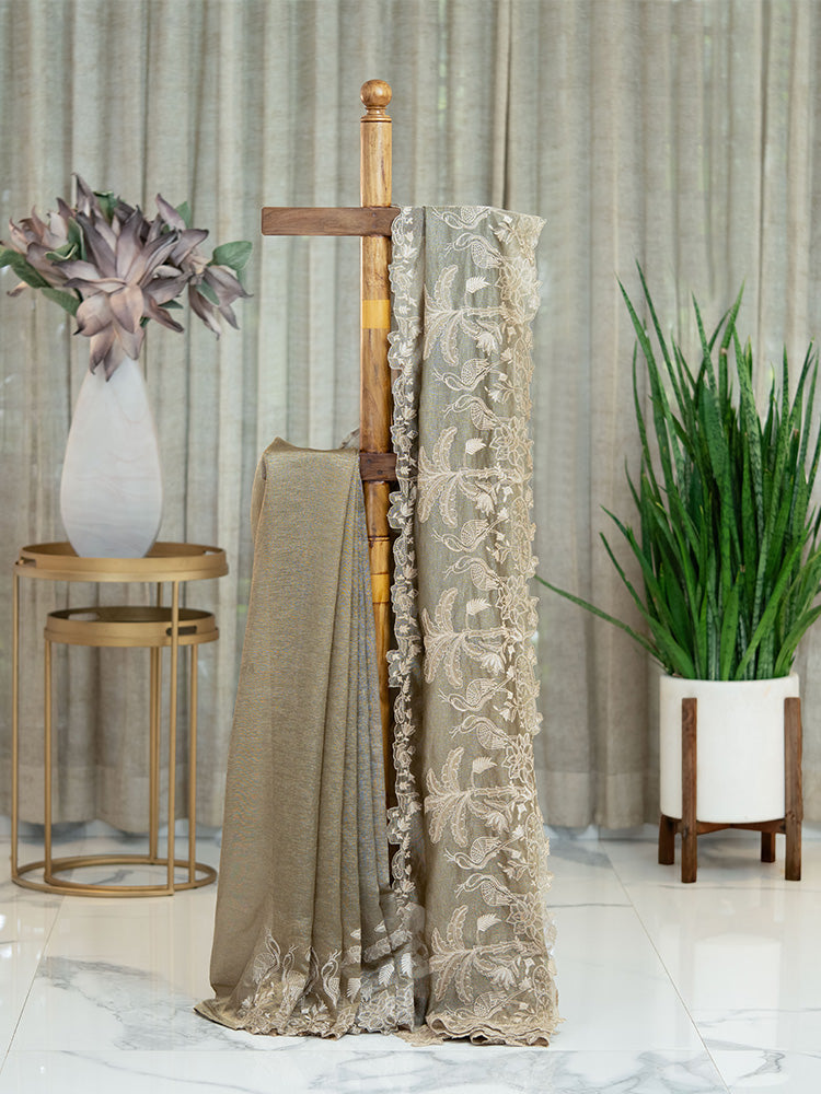 Golden Crushed Tissue Saree with Off-White Thread Work