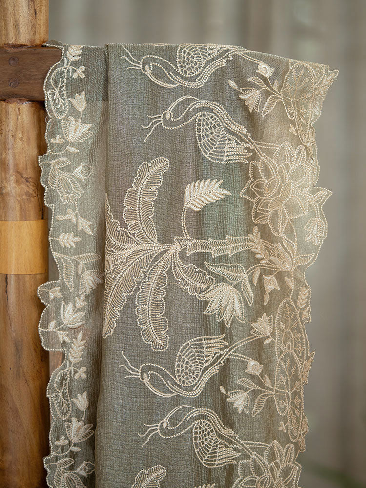 Embrace timeless elegance with our Golden Crushed Tissue Saree, featuring off-white thread work on the border and rich thread embroidery on the pallu. This saree is perfect for weddings, festive occasions, and grand celebrations, exuding sophistication and style.