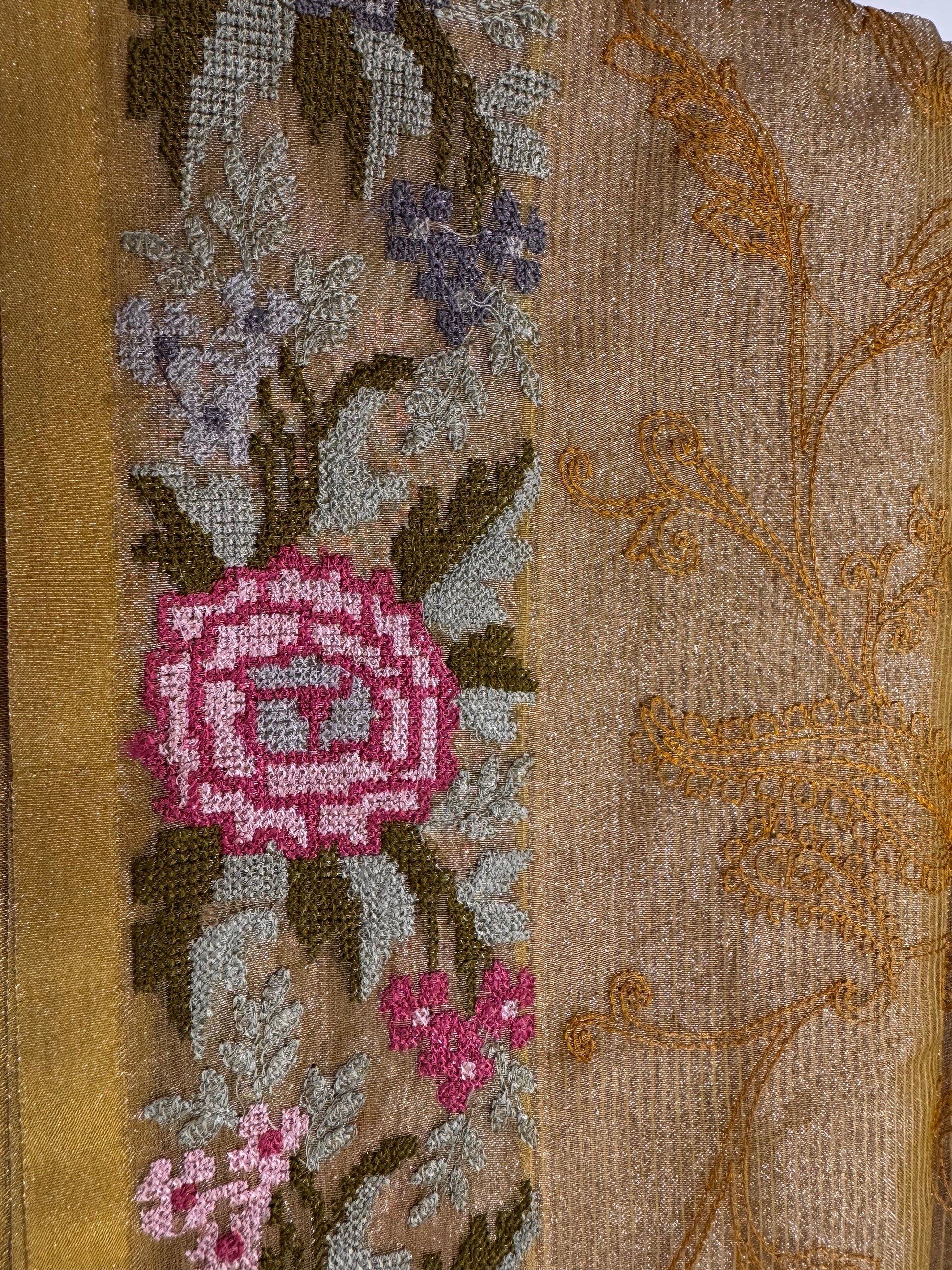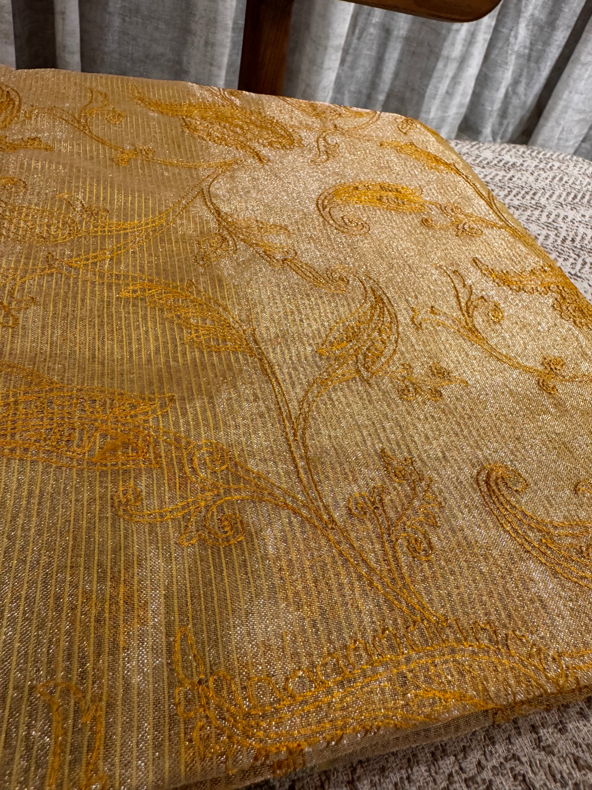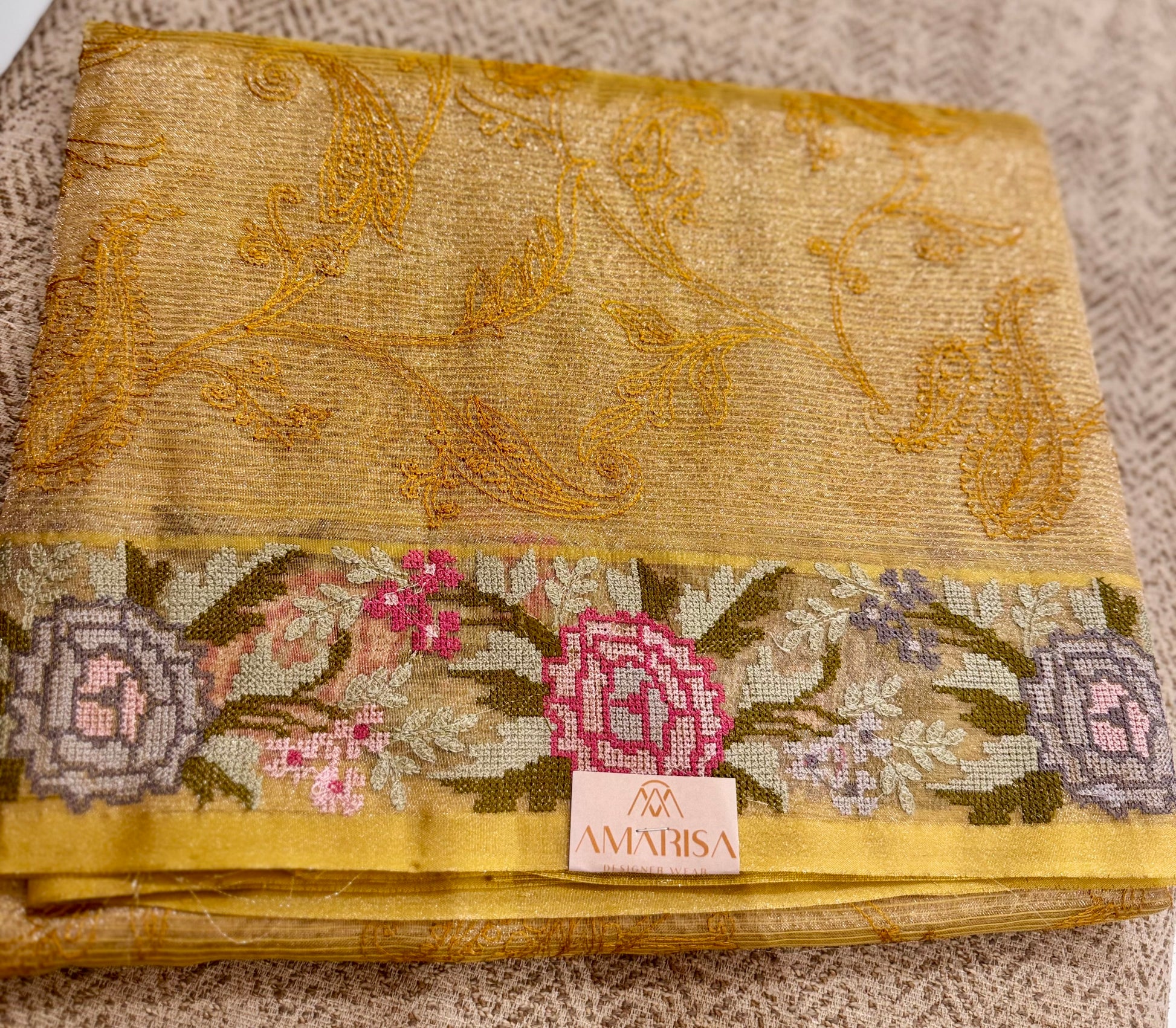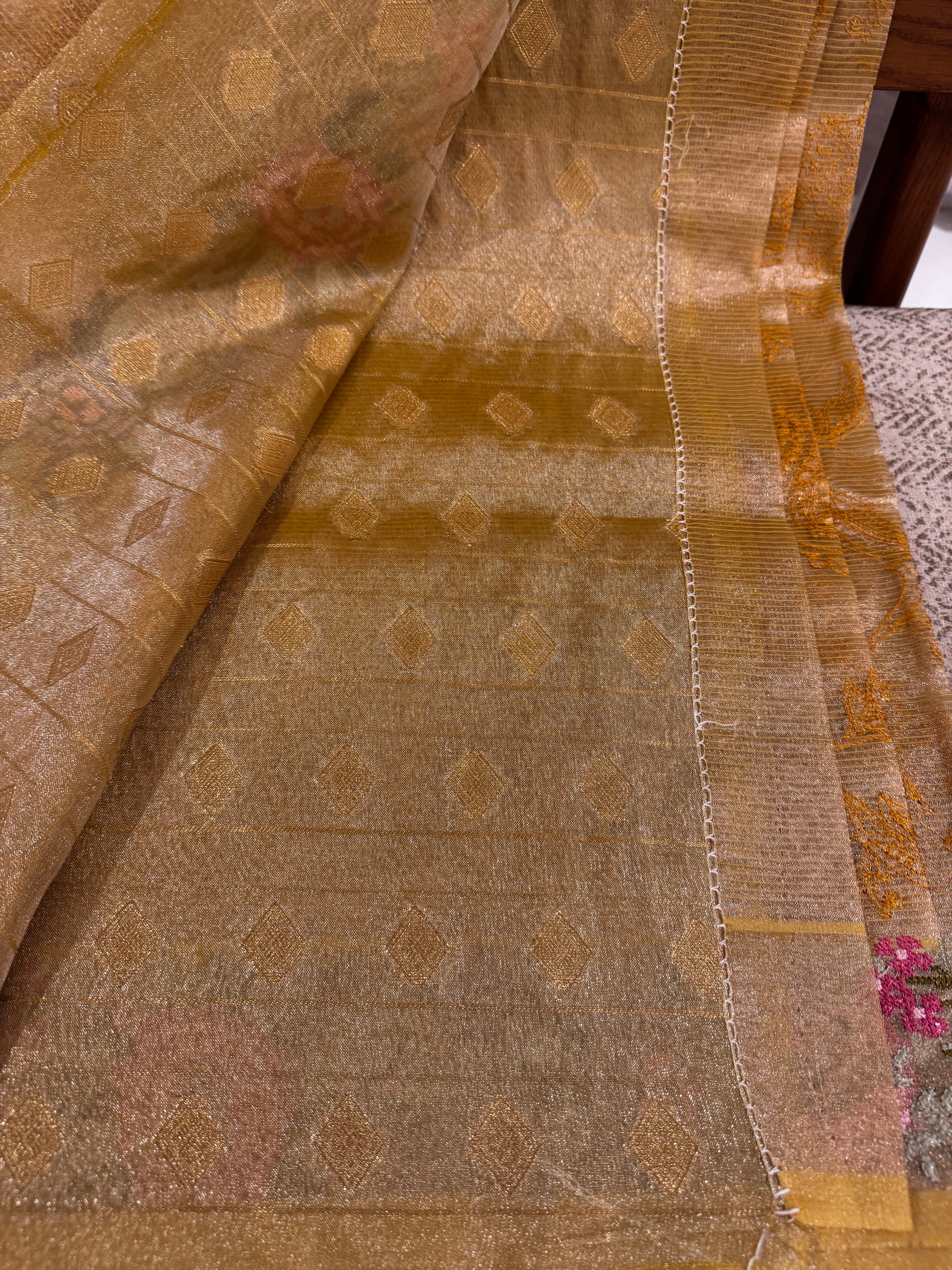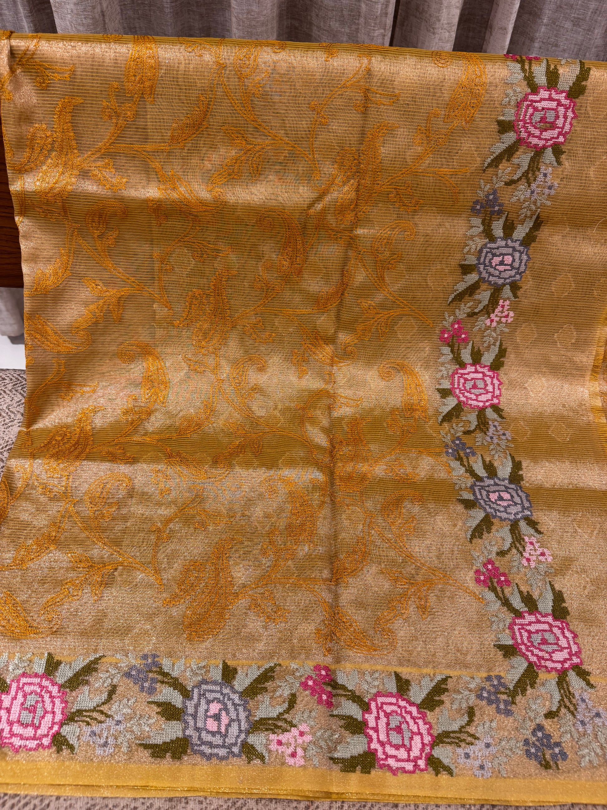 A timeless blend of shimmer, grace, and lightweight comfort. This exquisite Kota tissue saree comes in a rich golden hue, beautifully complemented with an elegant floral woven border. Perfect for weddings, festive celebrations, and grand occasions, this saree radiates refined luxury from every angle.