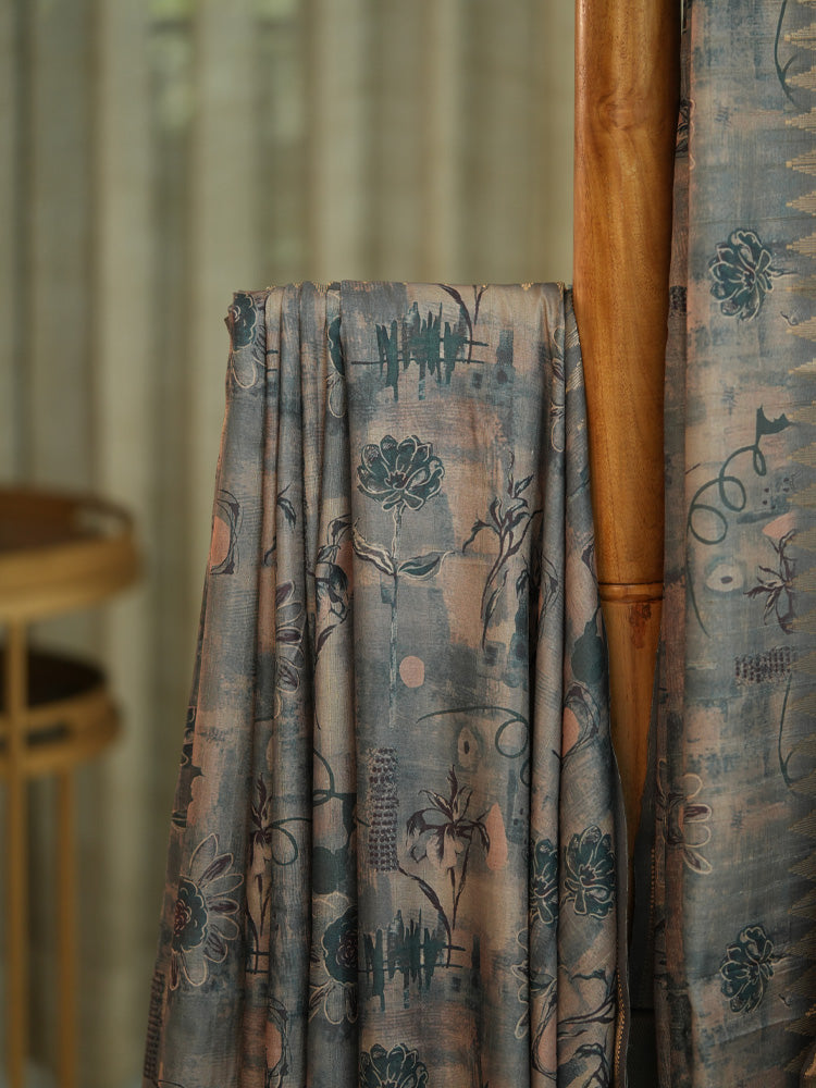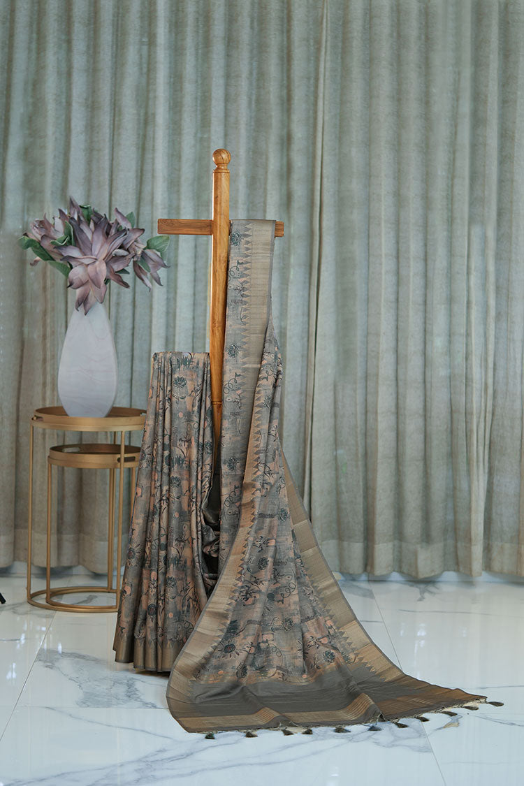 Grey Moonga Silk Saree with Floral Print and Temple Border