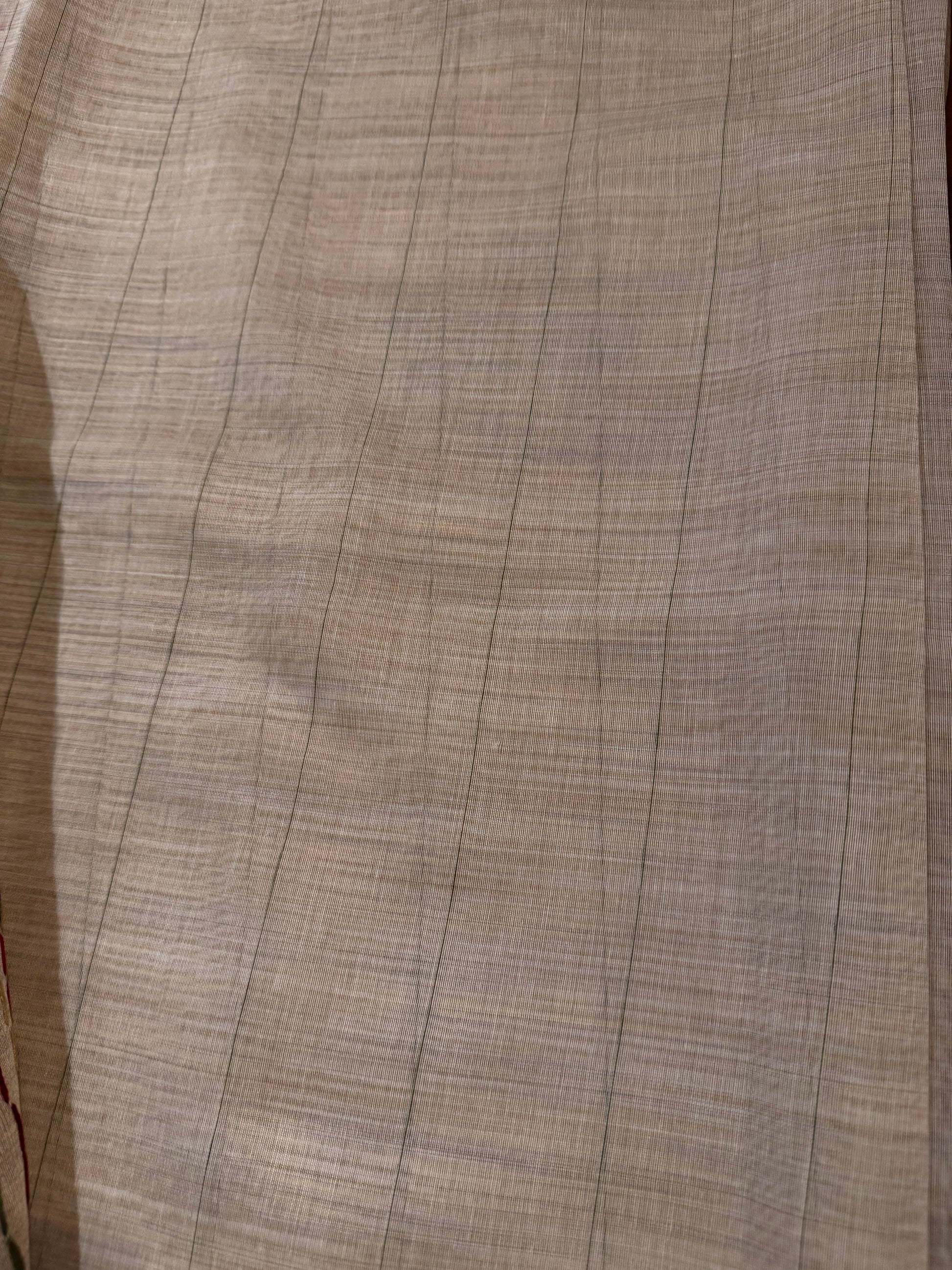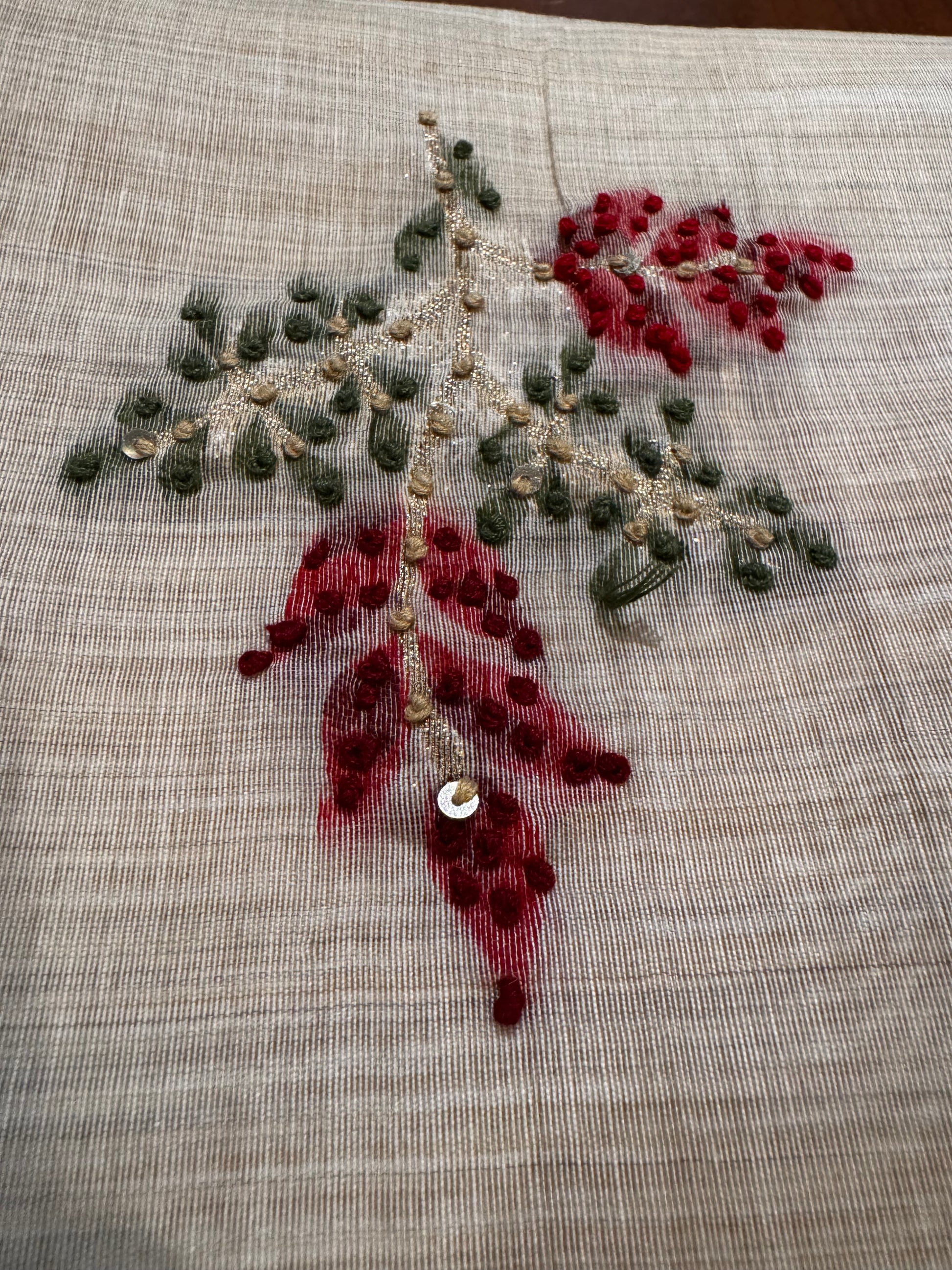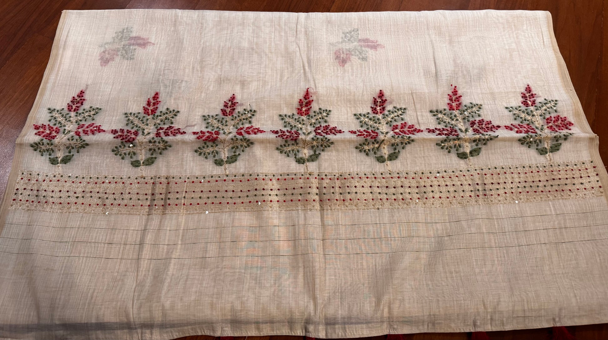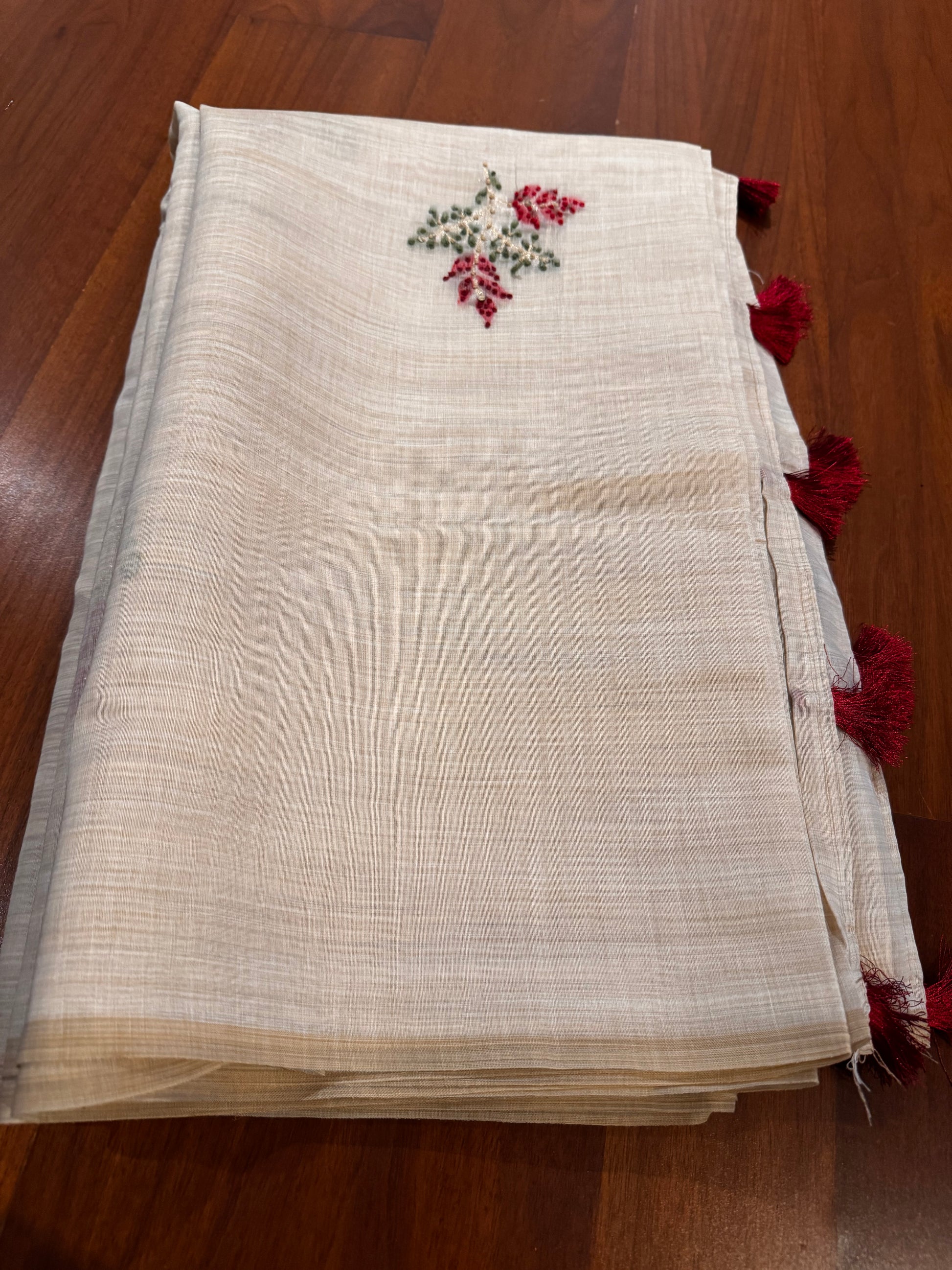 A soft, airy cotton saree in a subtle ivory-beige shade, highlighted with delicate floral threadwork in maroon, sage green and antique gold. The pallu carries a row of intricate embroidered motifs along with a dotted zari panel and tiny sequins that add a gentle festive sparkle. Deep maroon tassels at the pallu edge complete the look with a pretty contrast.