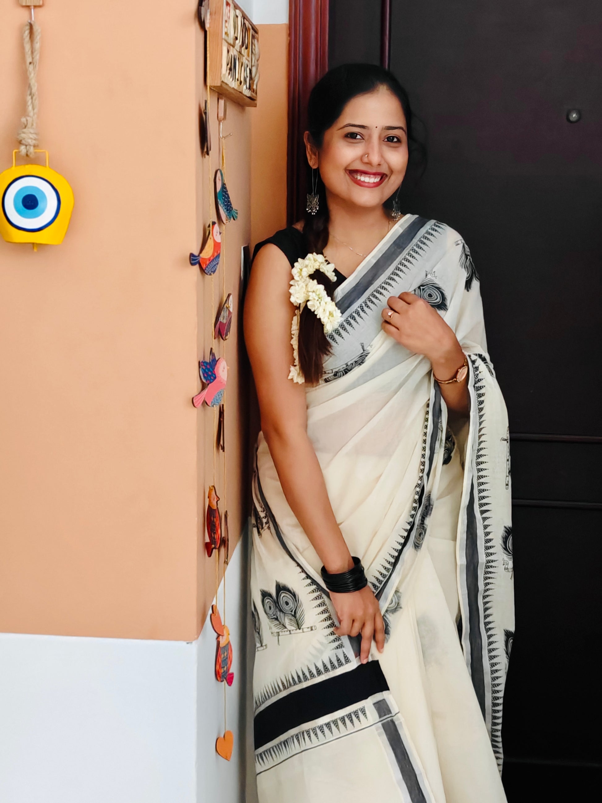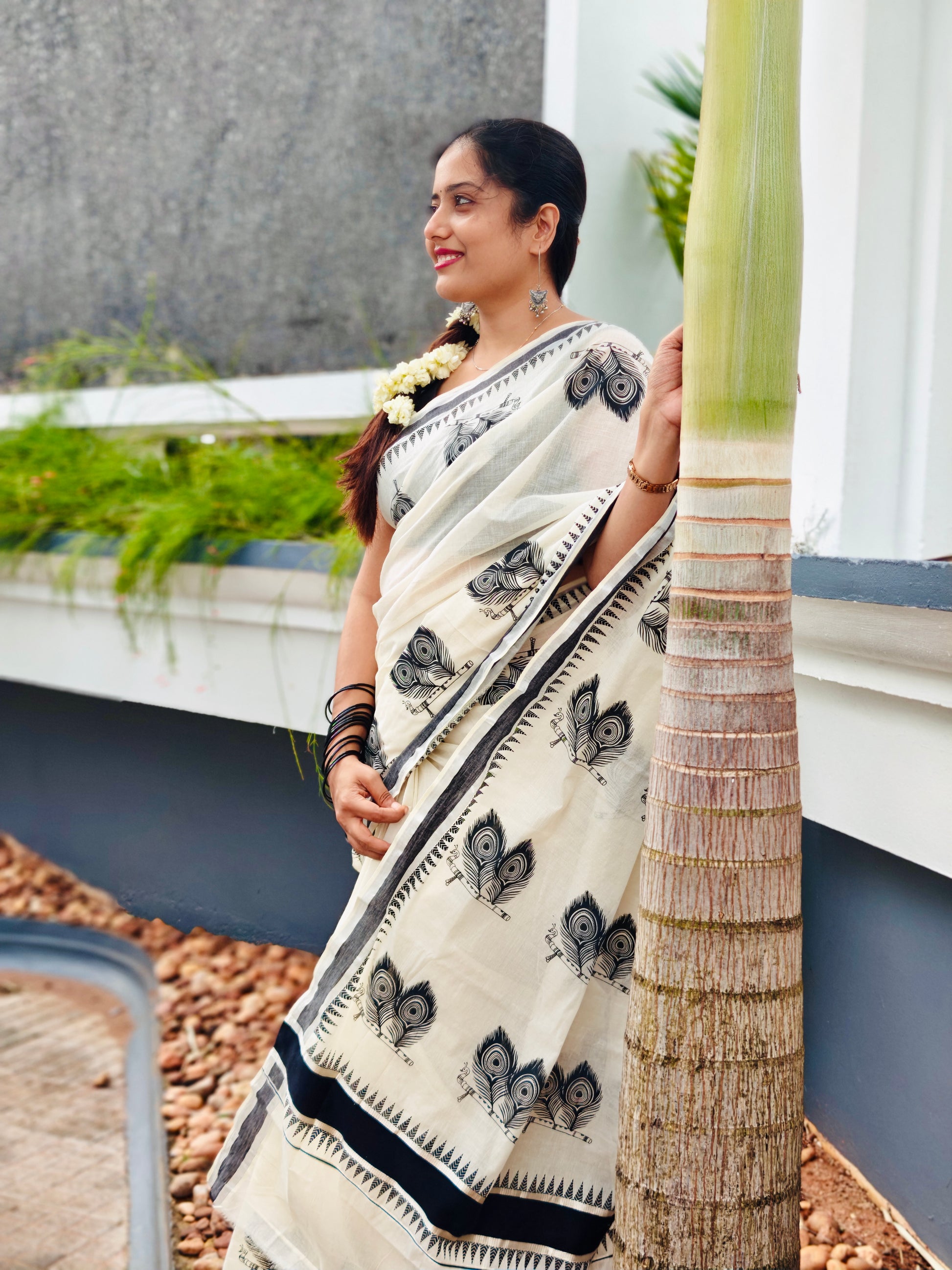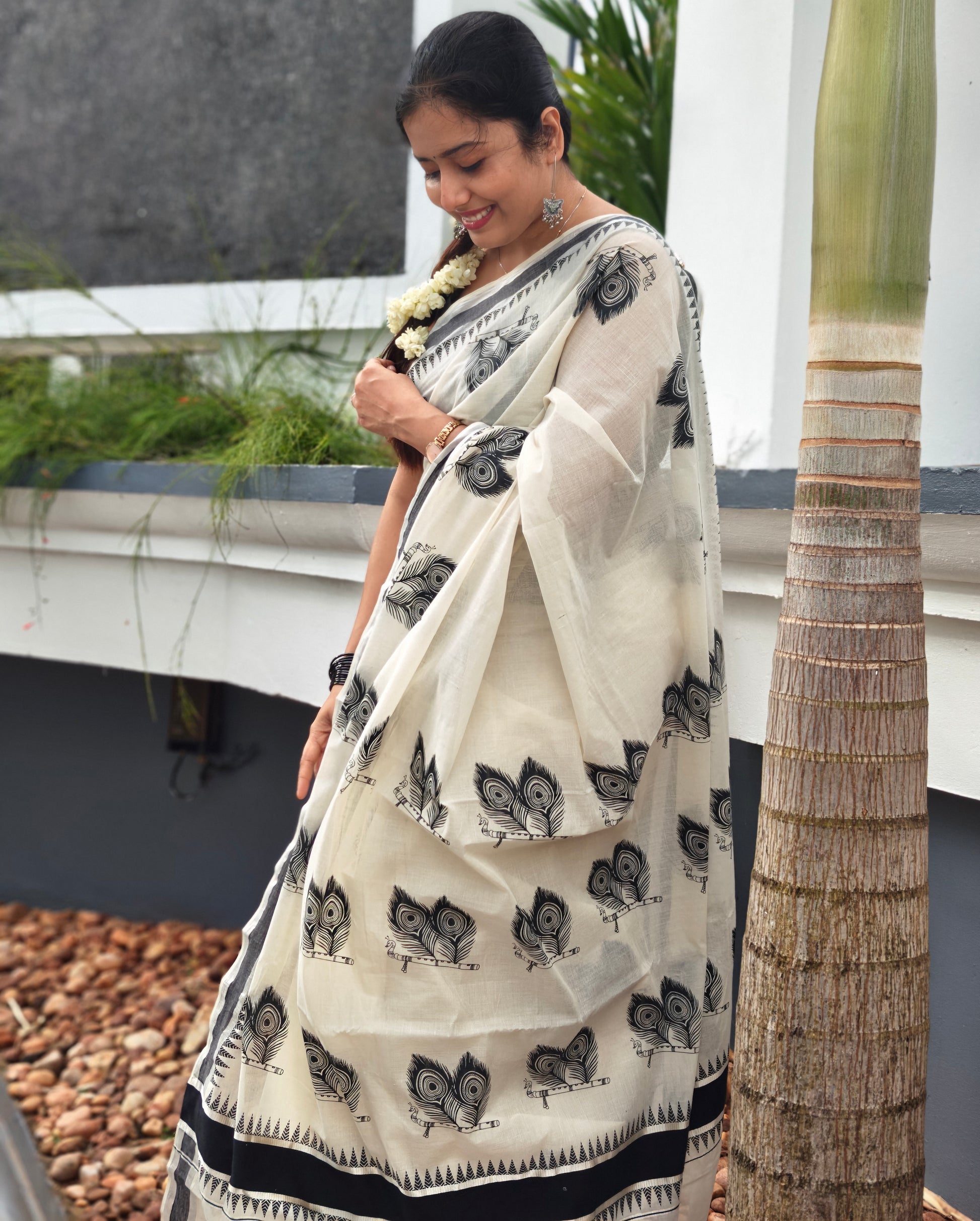 Embrace timeless elegance with this classic Kerala cotton saree, featuring intricate black peacock feather motifs beautifully accented with subtle silver detailing. The soft, breathable cotton fabric offers unmatched comfort, while the contrast black border with fine patterns adds a refined touch. Perfect for festive occasions, temple visits, and traditional gatherings, this saree blends cultural charm with everyday grace.