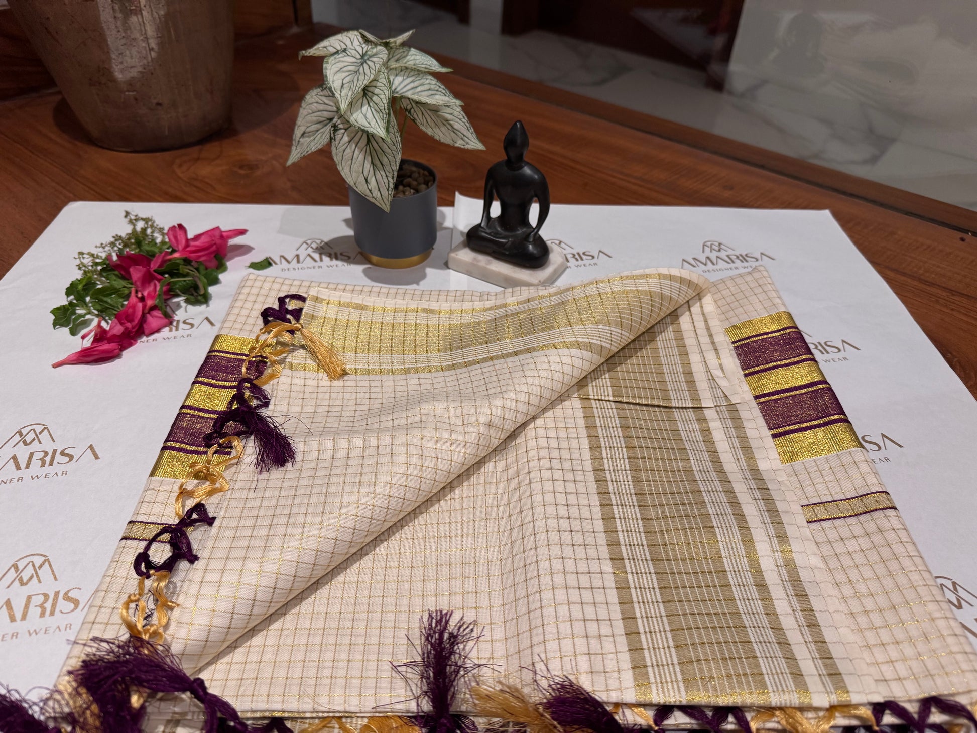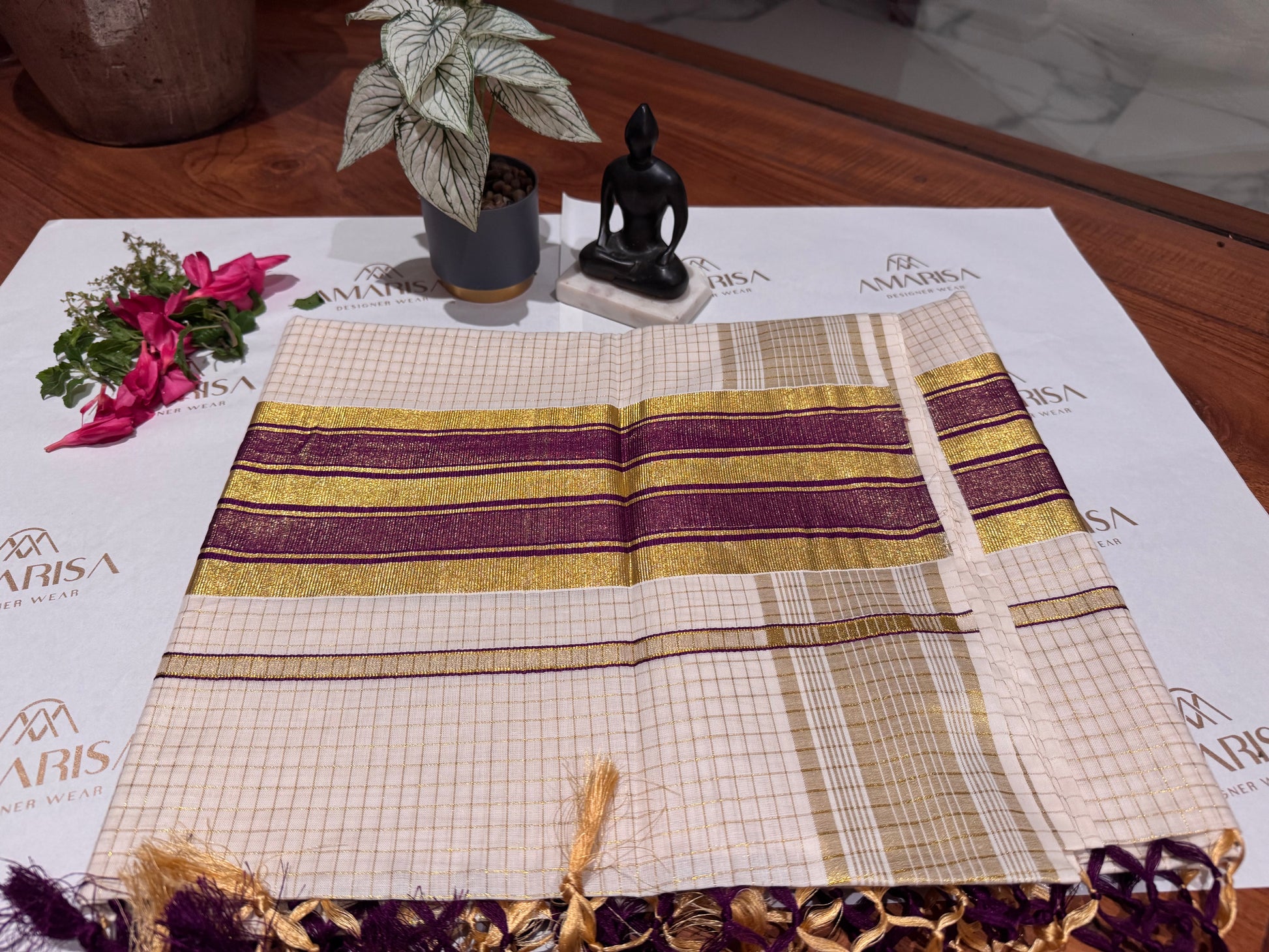 Step into timeless elegance with this exquisite Kerala cotton saree, featuring a graceful off-white base enhanced with delicate check patterns. The rich pallu showcases bold maroon and gold zari stripes, adding a regal contrast to the subtle body. Finished with beautifully knotted tassels in maroon and gold, this saree is perfect for festive occasions, traditional functions, or elegant gifting.