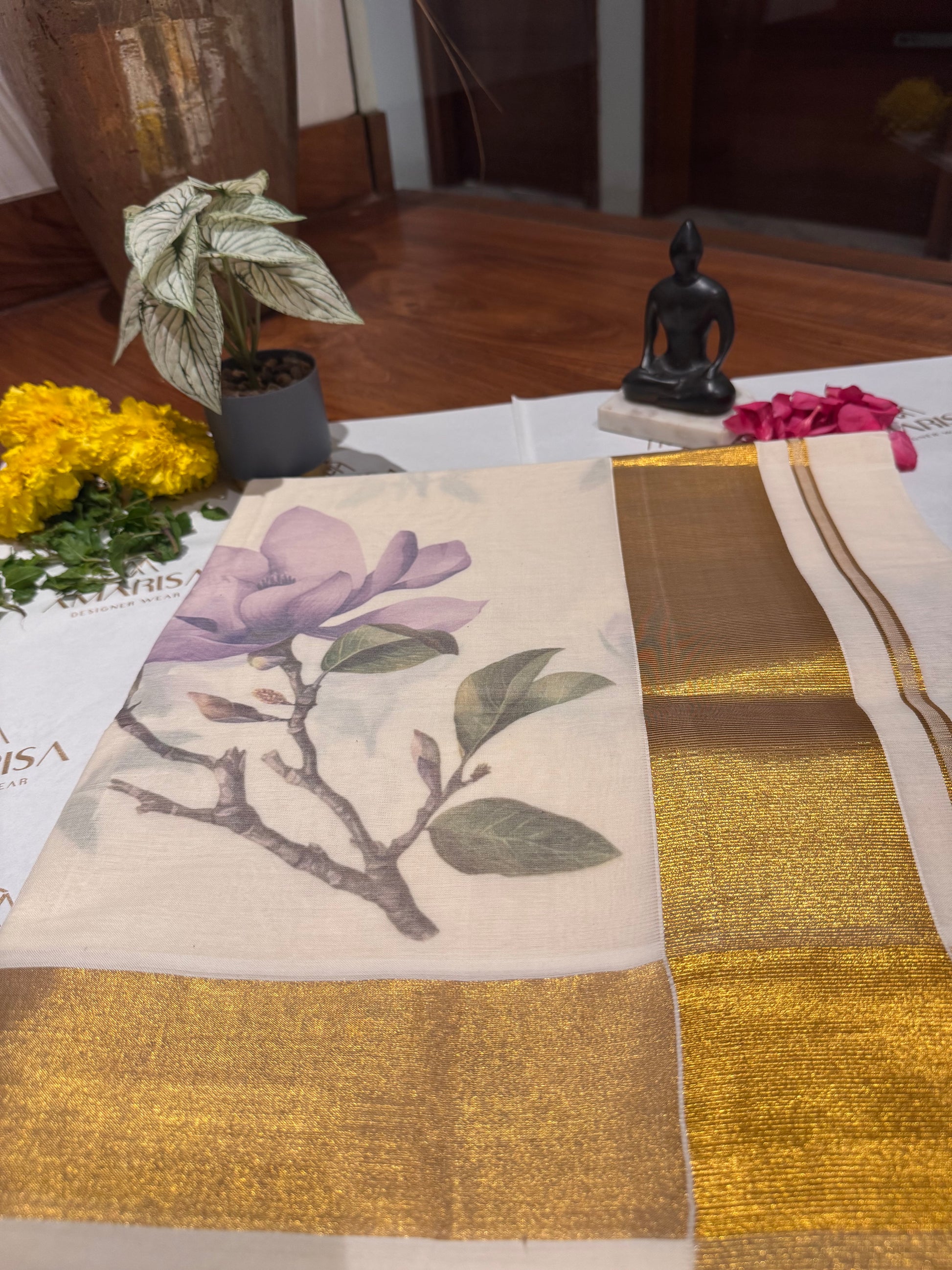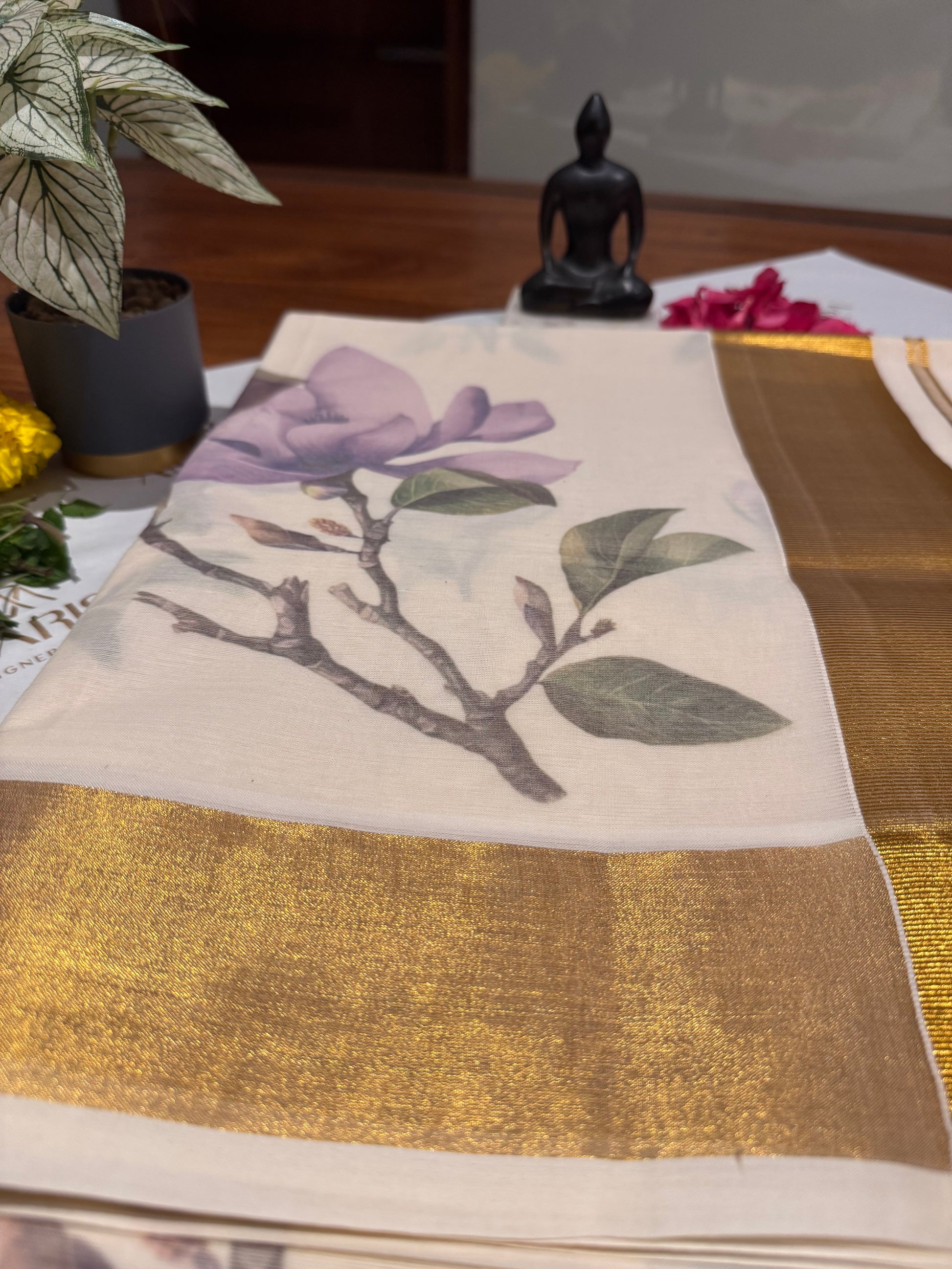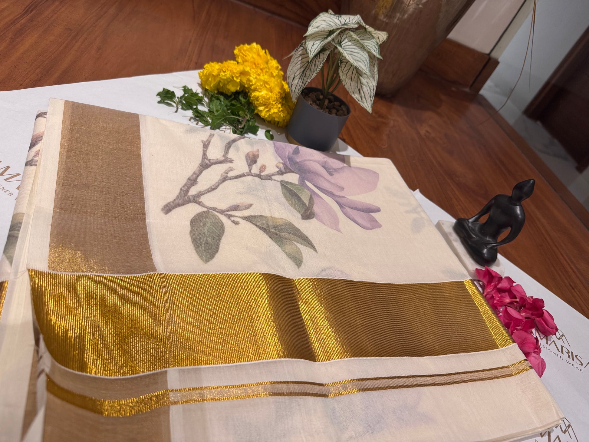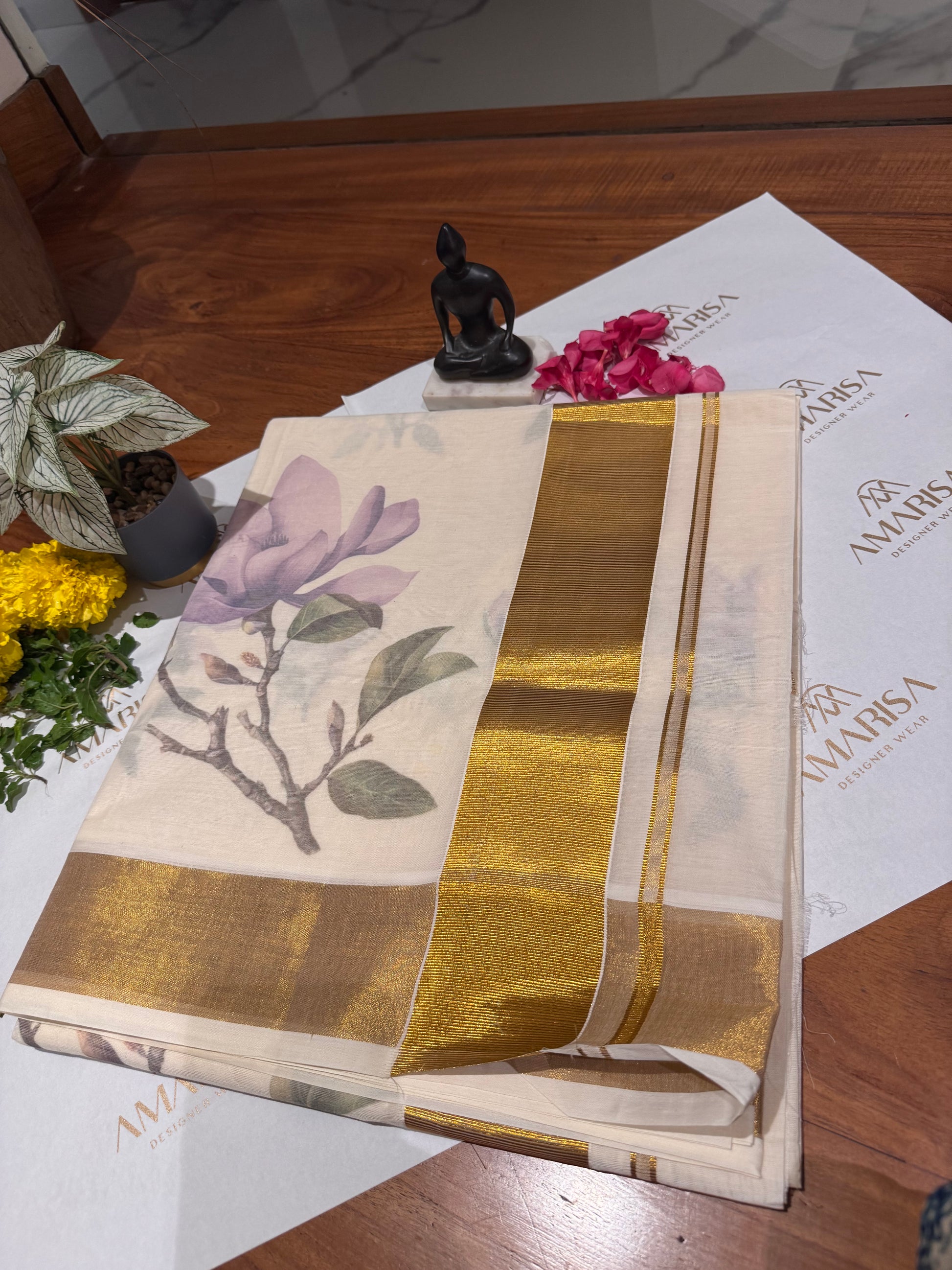 Step into timeless elegance with this exquisite Kerala cotton saree . The saree features a serene off white base adorned with light Lavender shade floral prints .