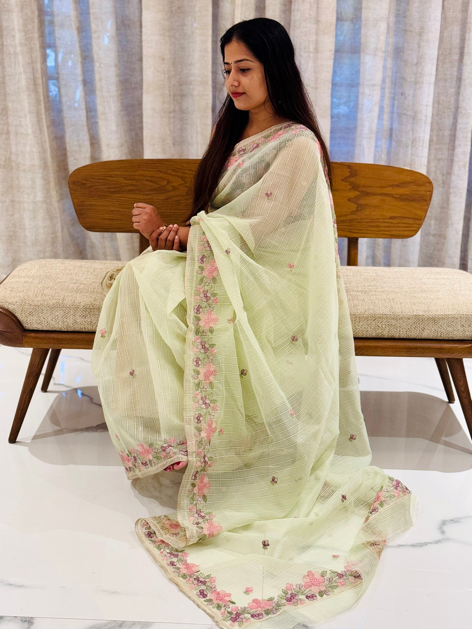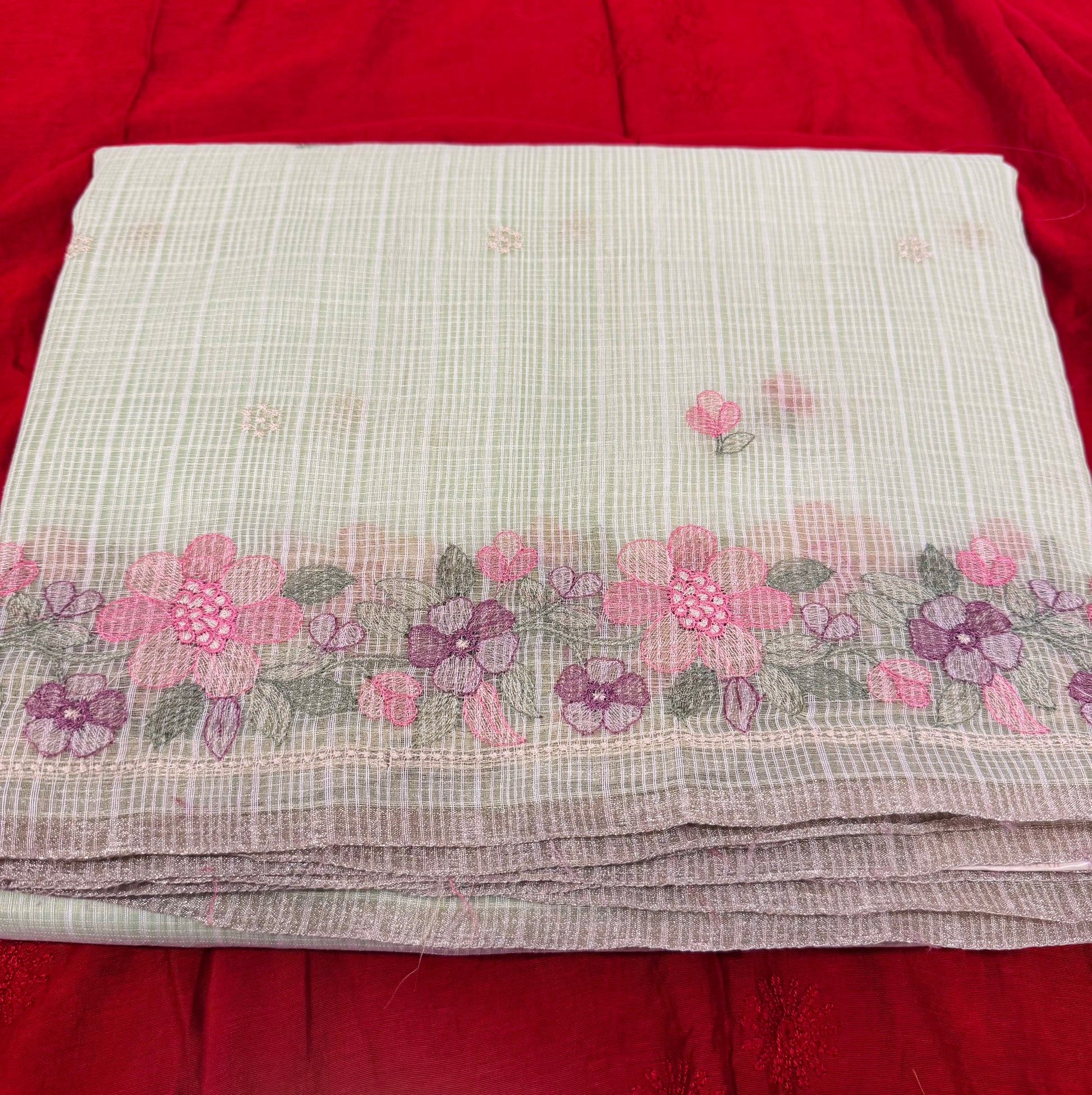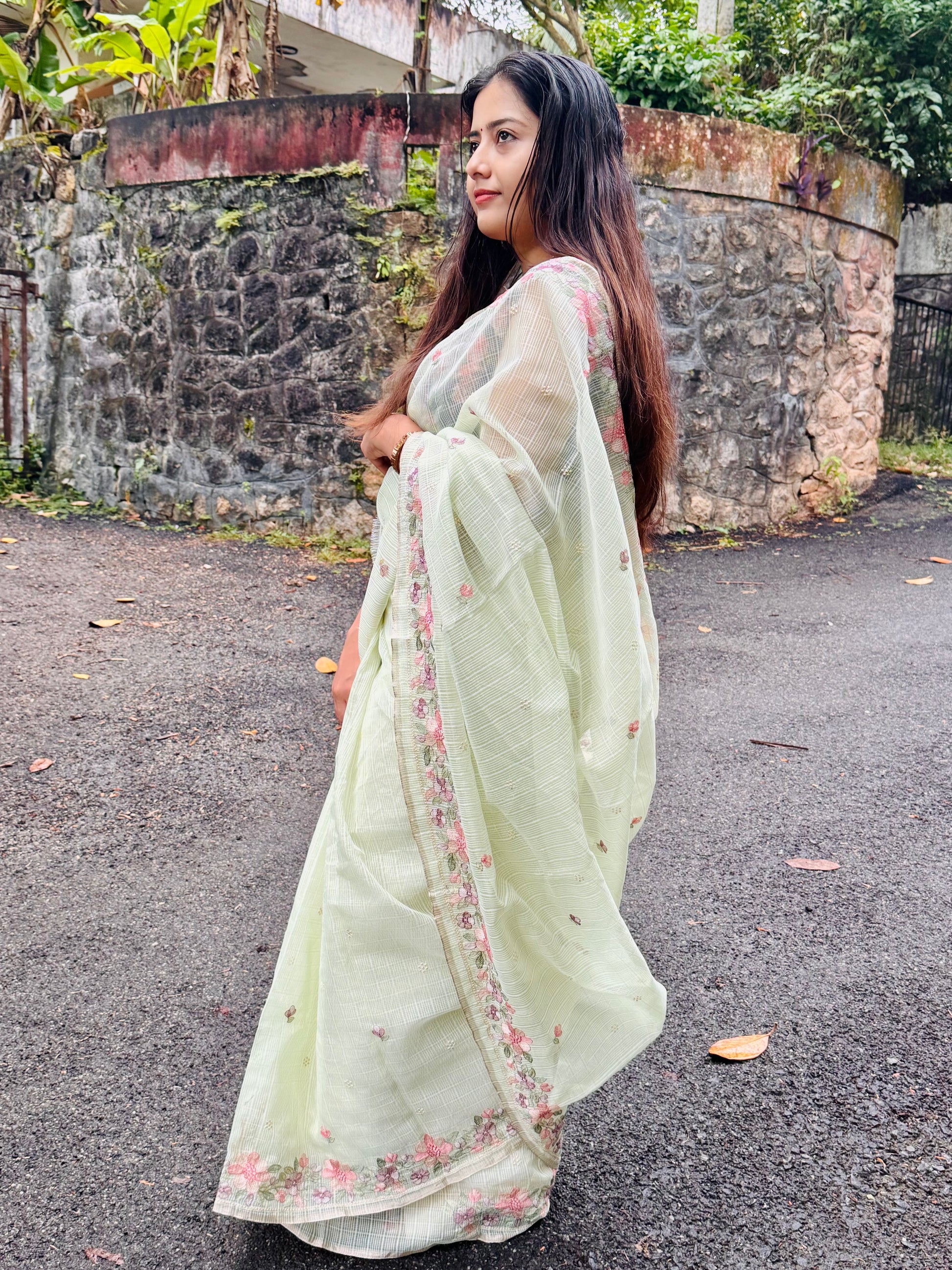 Radiate grace and charm in this pastel green Kota saree, crafted from lightweight, airy fabric for effortless draping. The saree is adorned with delicate floral embroidery in shades of pink and purple, beautifully scattered across the body and enriched along the border for a romantic, feminine touch. Perfect for summer celebrations, festive gatherings, or daytime events, this saree blends elegance with comfort, making it a timeless addition to your ethnic collection.