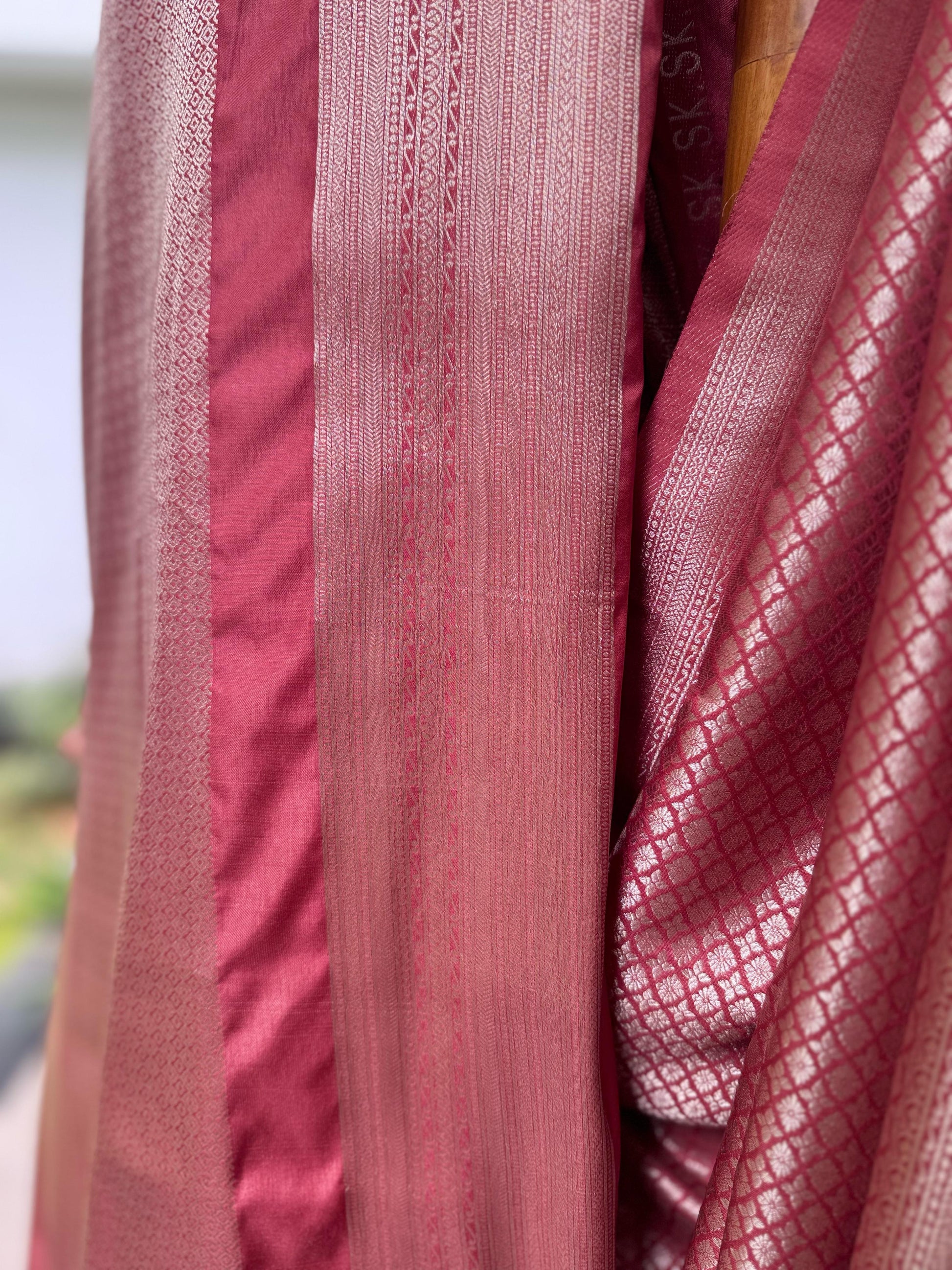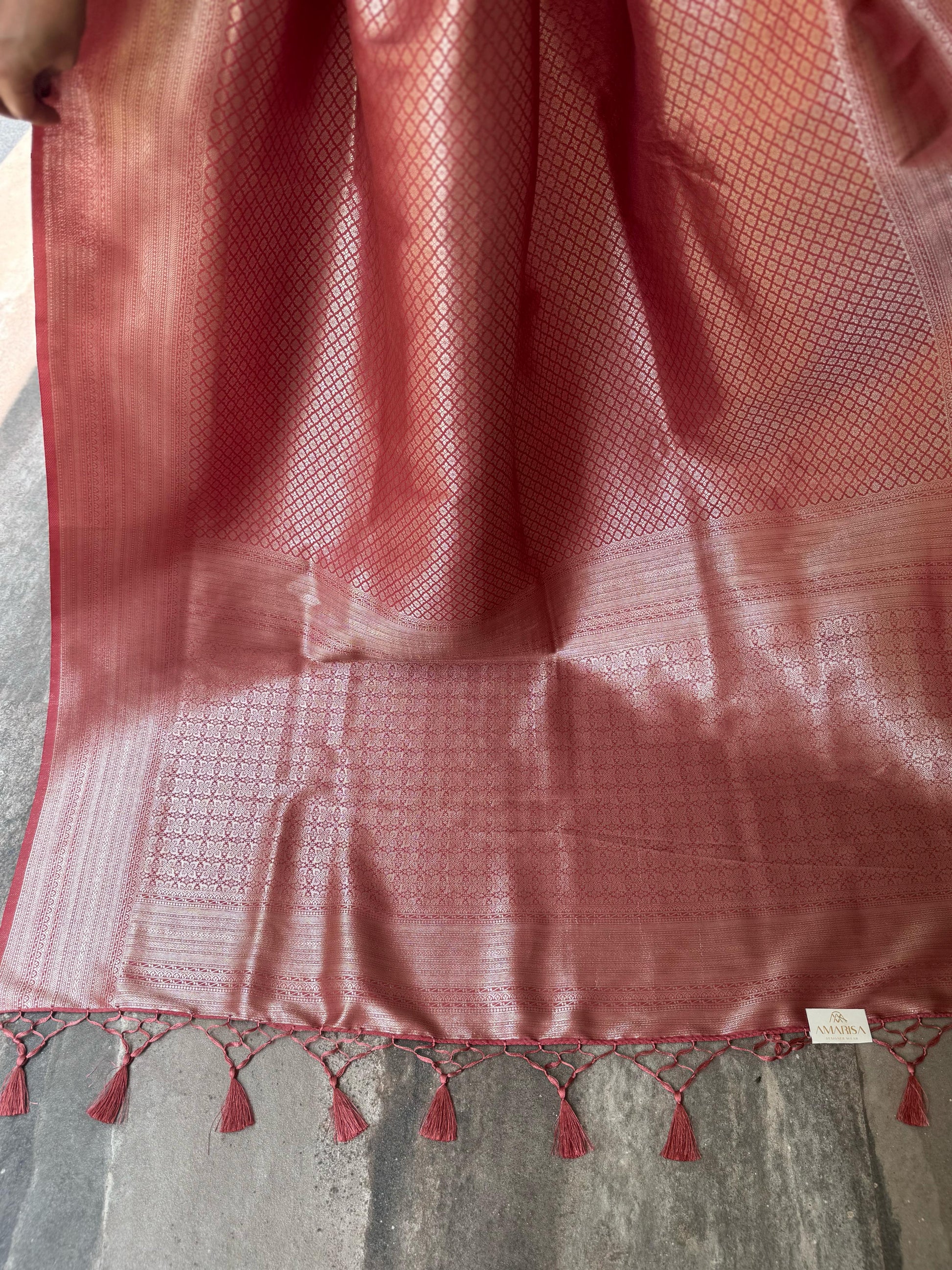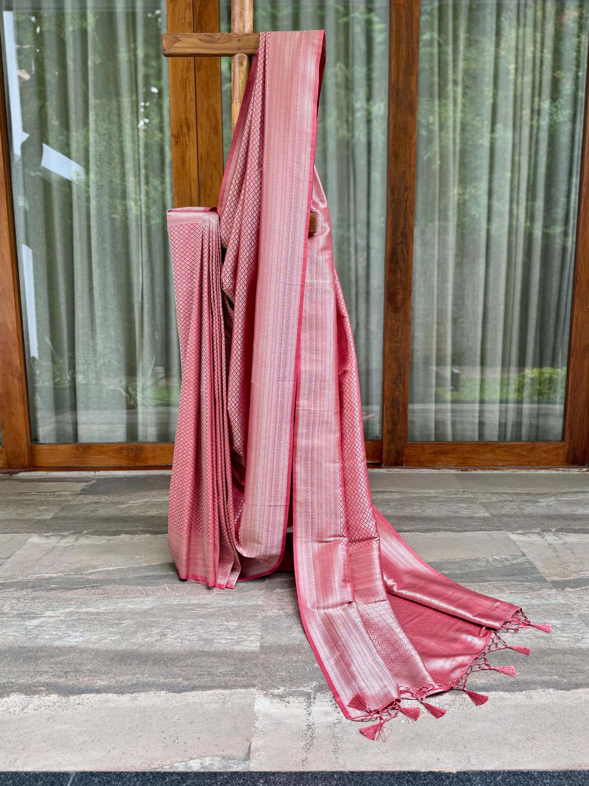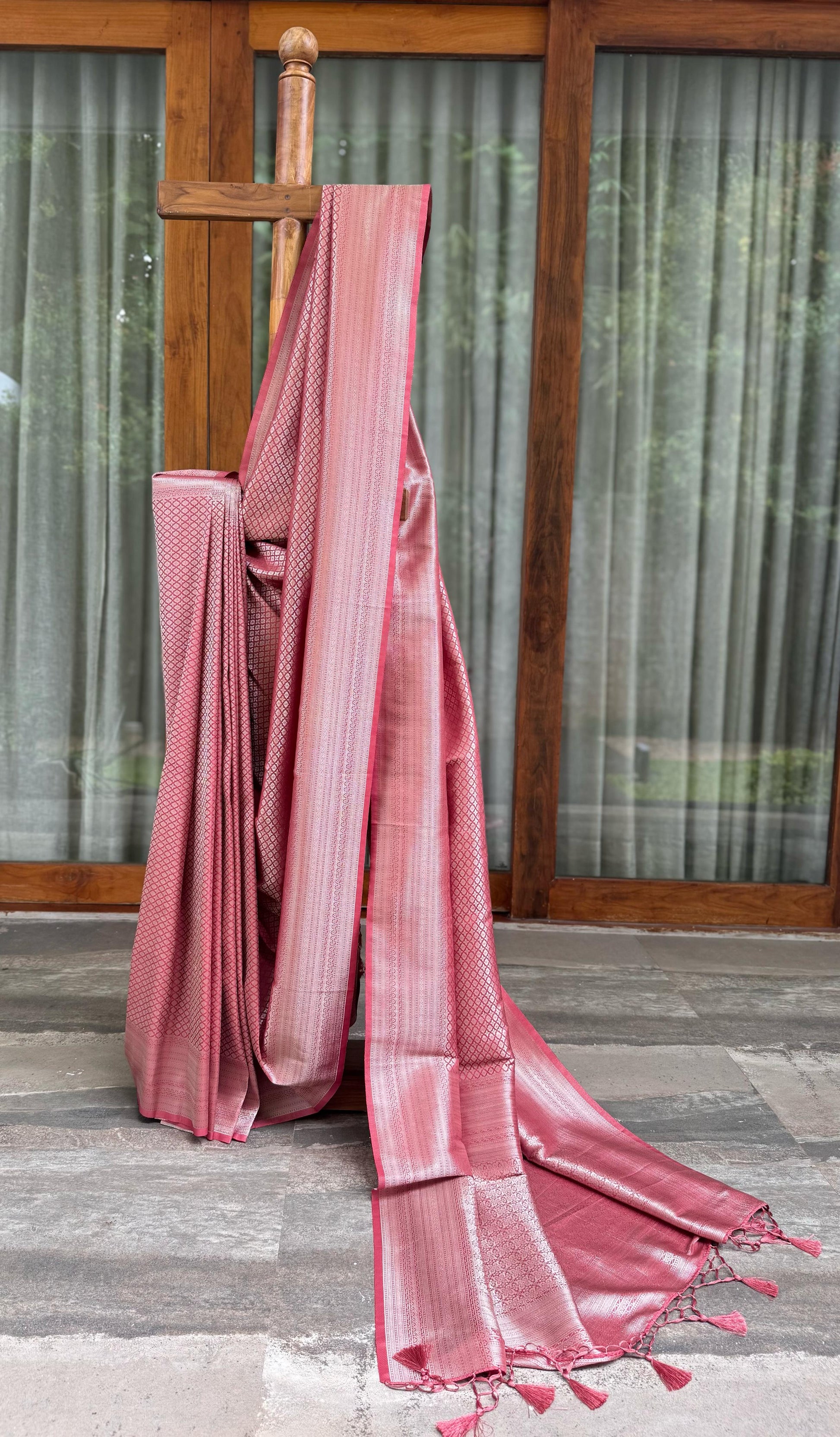 Grace meets grandeur in this breathtaking Kubera silk saree in a soft, elegant pastel red shade. Crafted from premium Kubera silk, the saree offers a rich, smooth texture with a lustrous finish that drapes gracefully, making it ideal for festive and formal occasions alike.