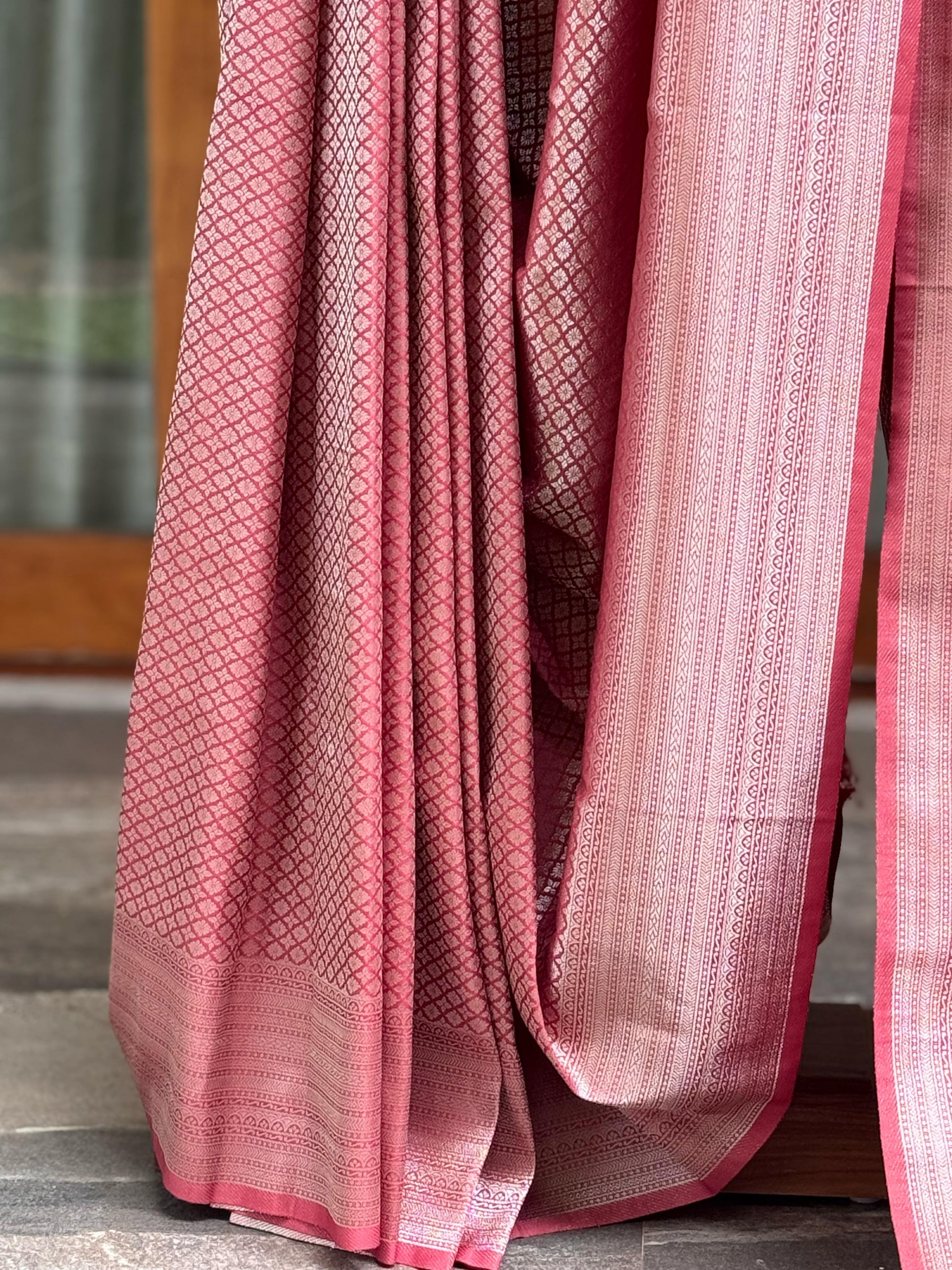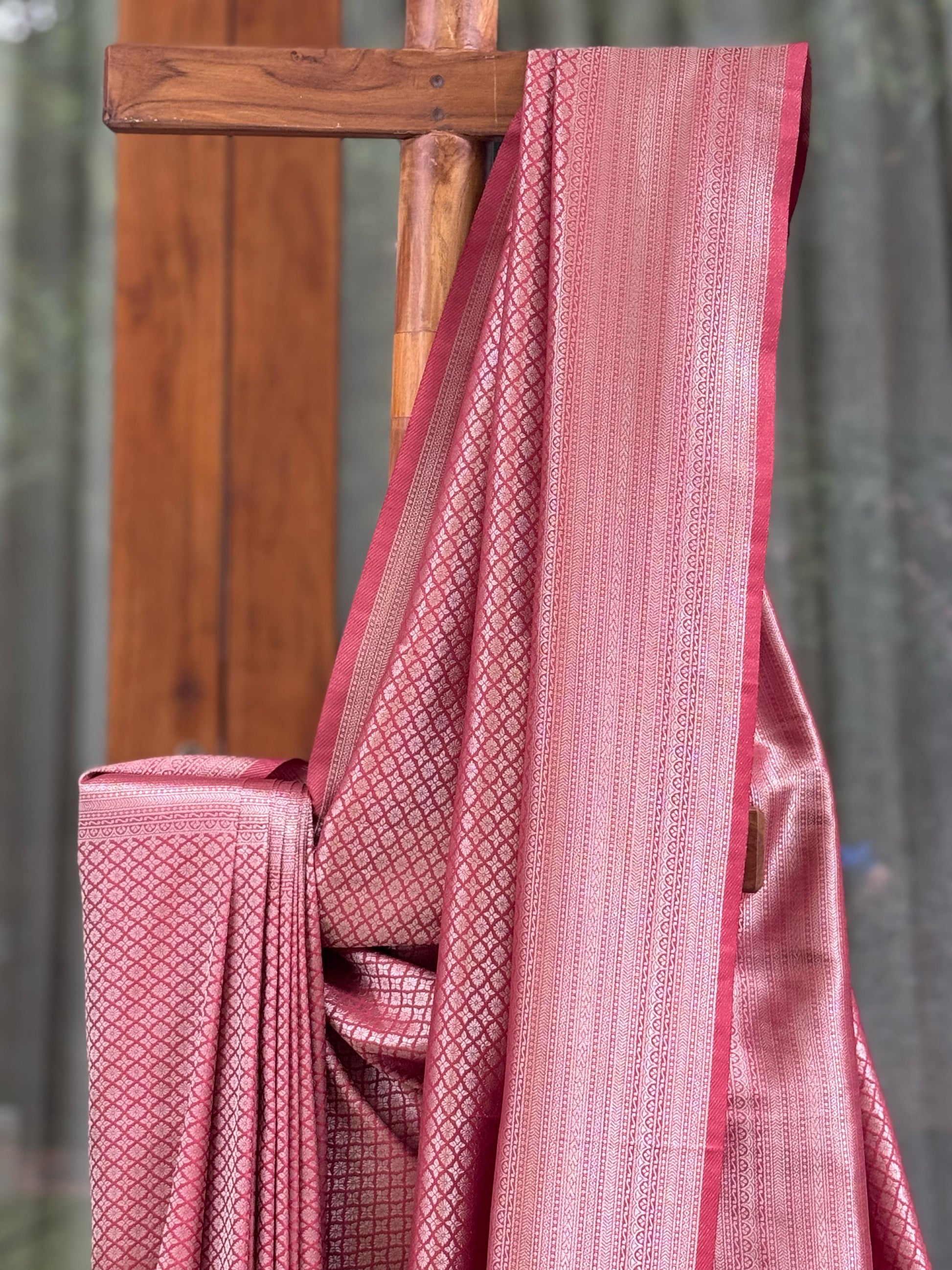 Complementing the saree is a matching pastel red blouse piece, also featuring brocade work, ensuring a cohesive and graceful finish. The blouse's elegant texture adds to the overall regal aesthetic, while allowing space for custom tailoring and styling.
