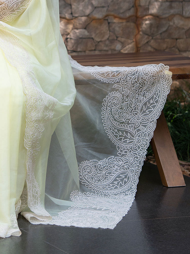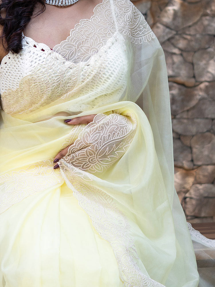 Lemon Yellow Organza Saree with Cream Thread Work