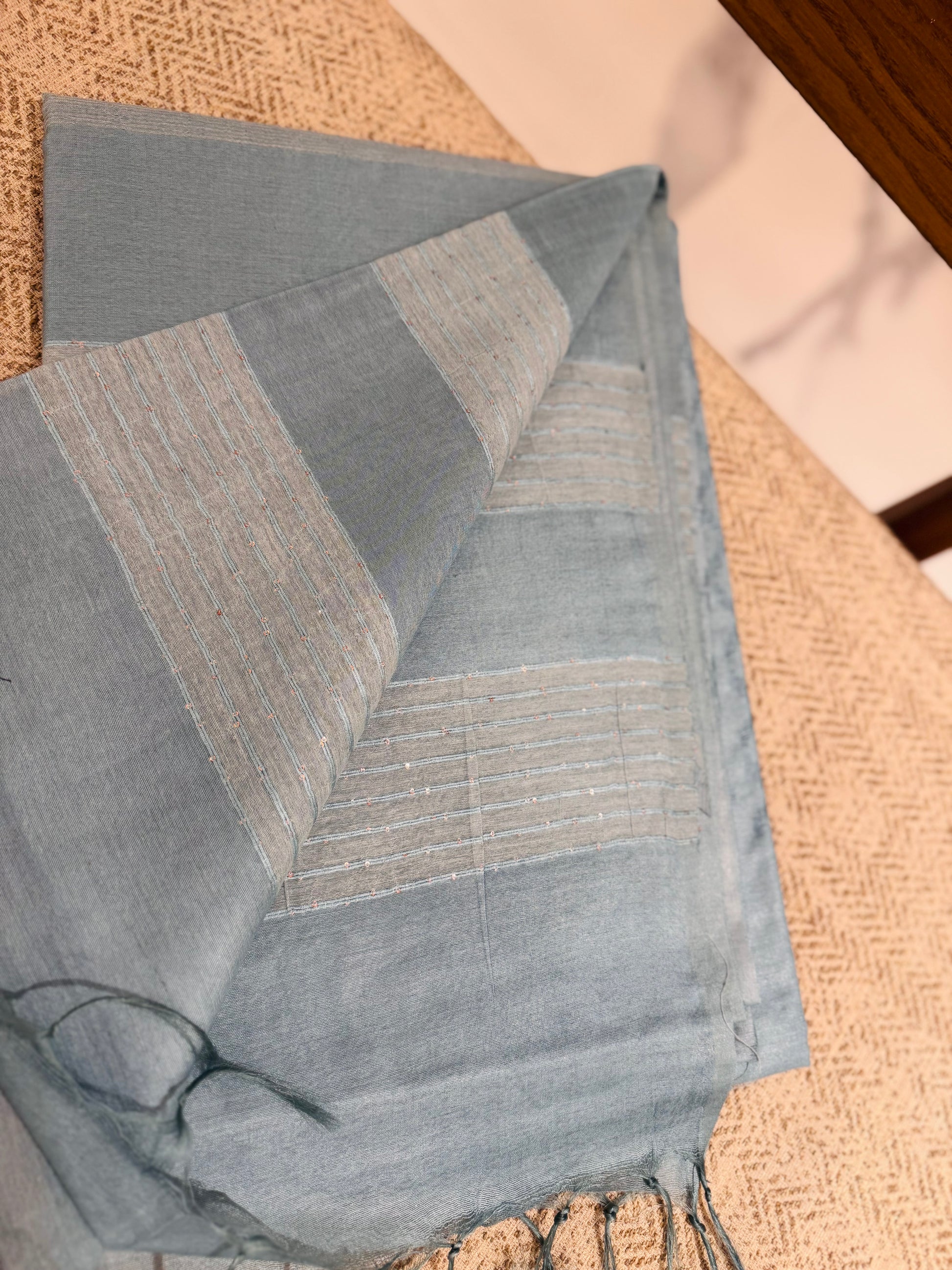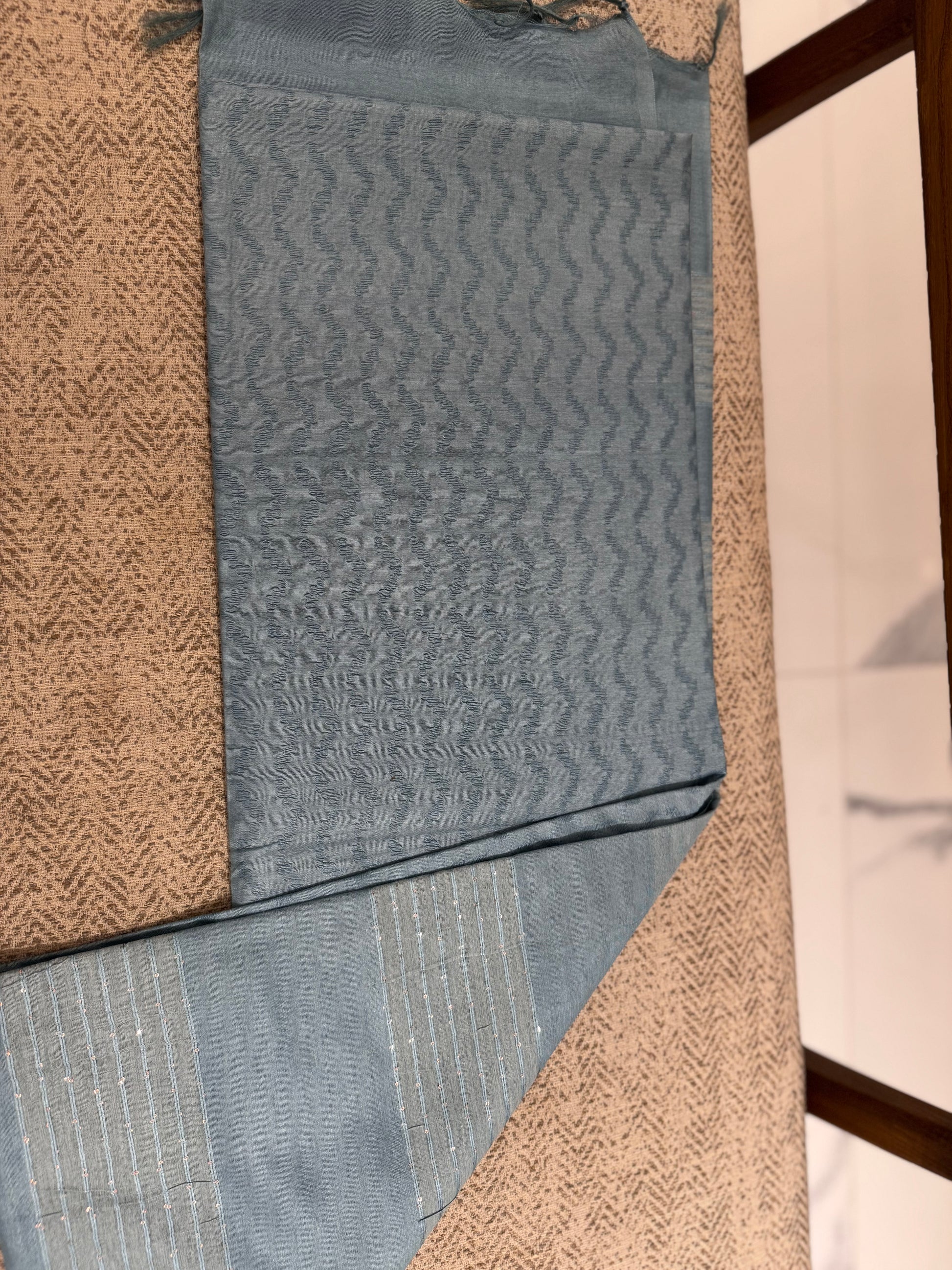 Elevate your everyday elegance with this stunning light blue fancy cotton saree, featuring intricate zig-zag thread weaving across the body. Lightweight and breathable, it blends traditional charm with a contemporary twist, perfect for casual outings, festive moments, or office wear.