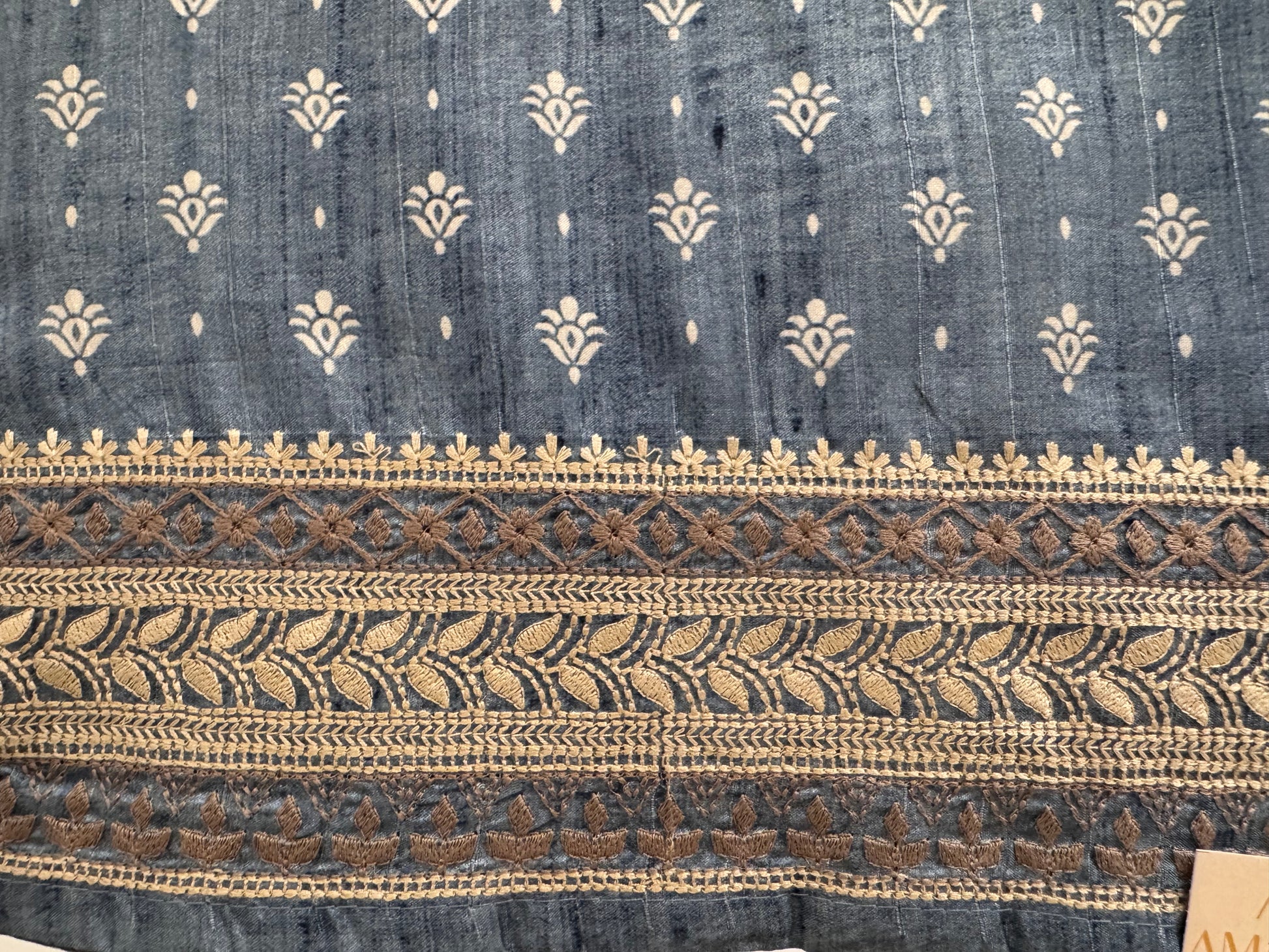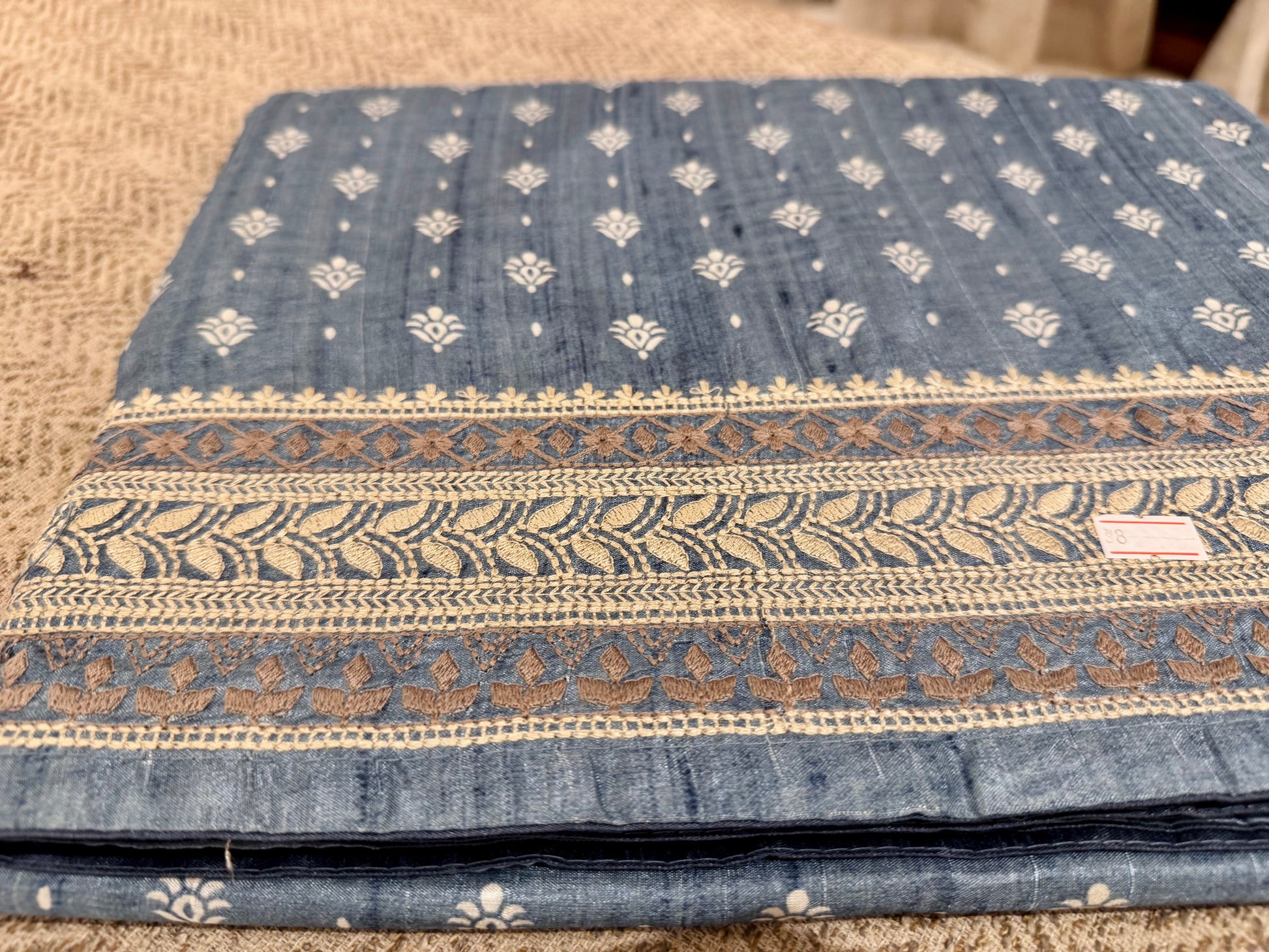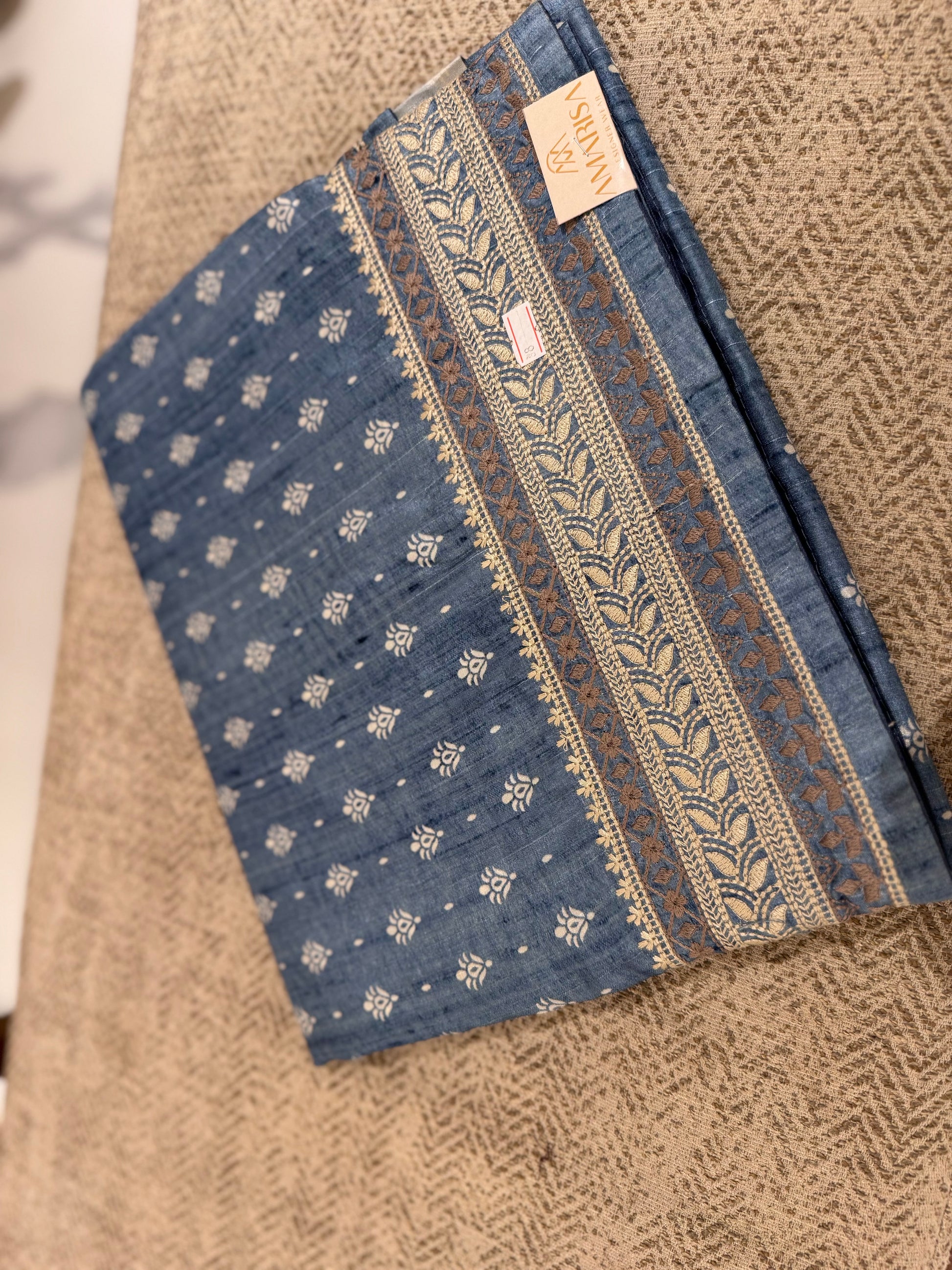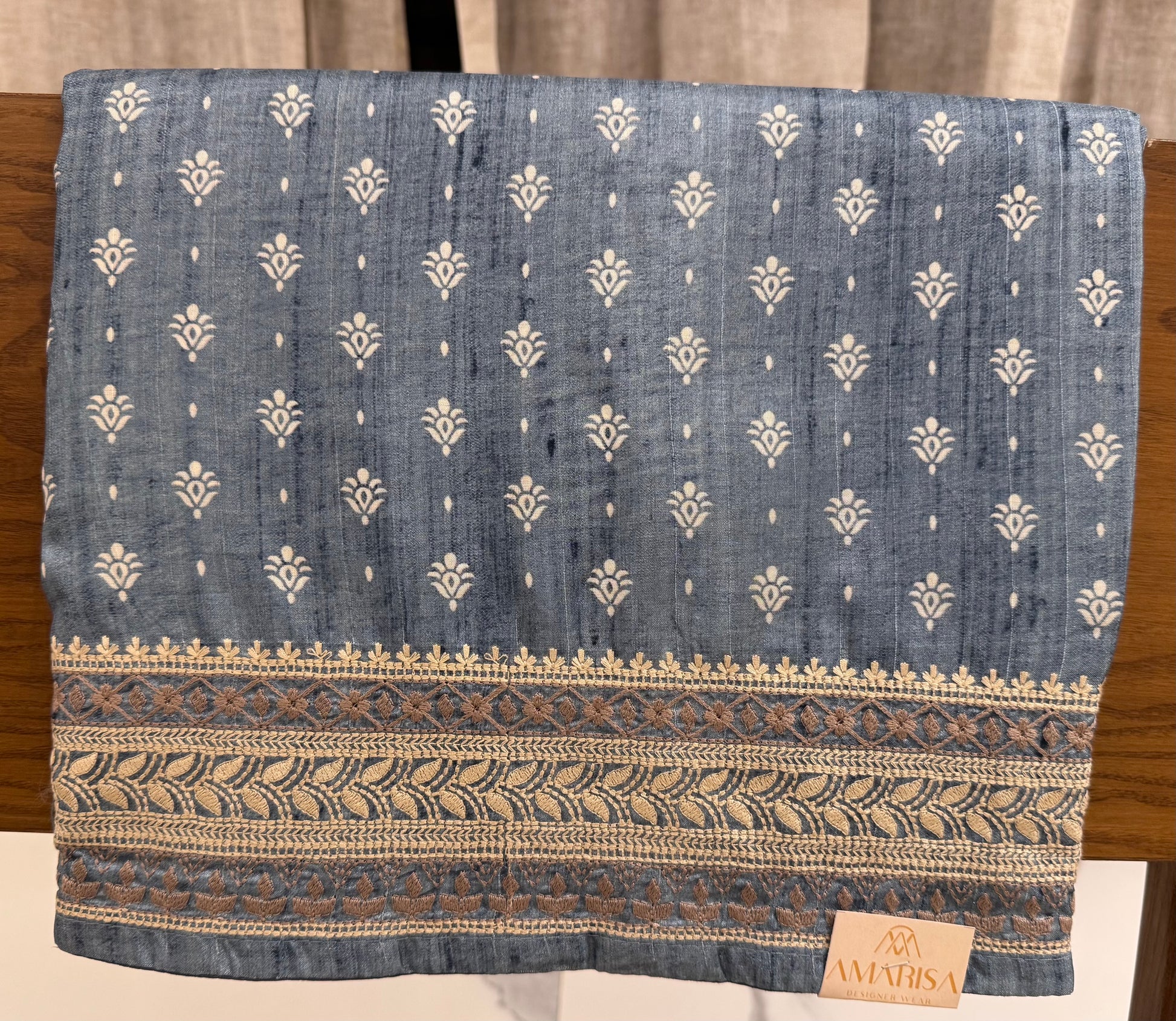 Delicately crafted in soothing light blue semitussar, this saree is an ode to understated elegance. The body is adorned with small white buti-style motifs arranged in a neat, vertical pattern, adding a subtle charm. The highlight is the intricately embroidered border, featuring detailed white and beige threadwork in floral and geometric patterns that beautifully complement the body.