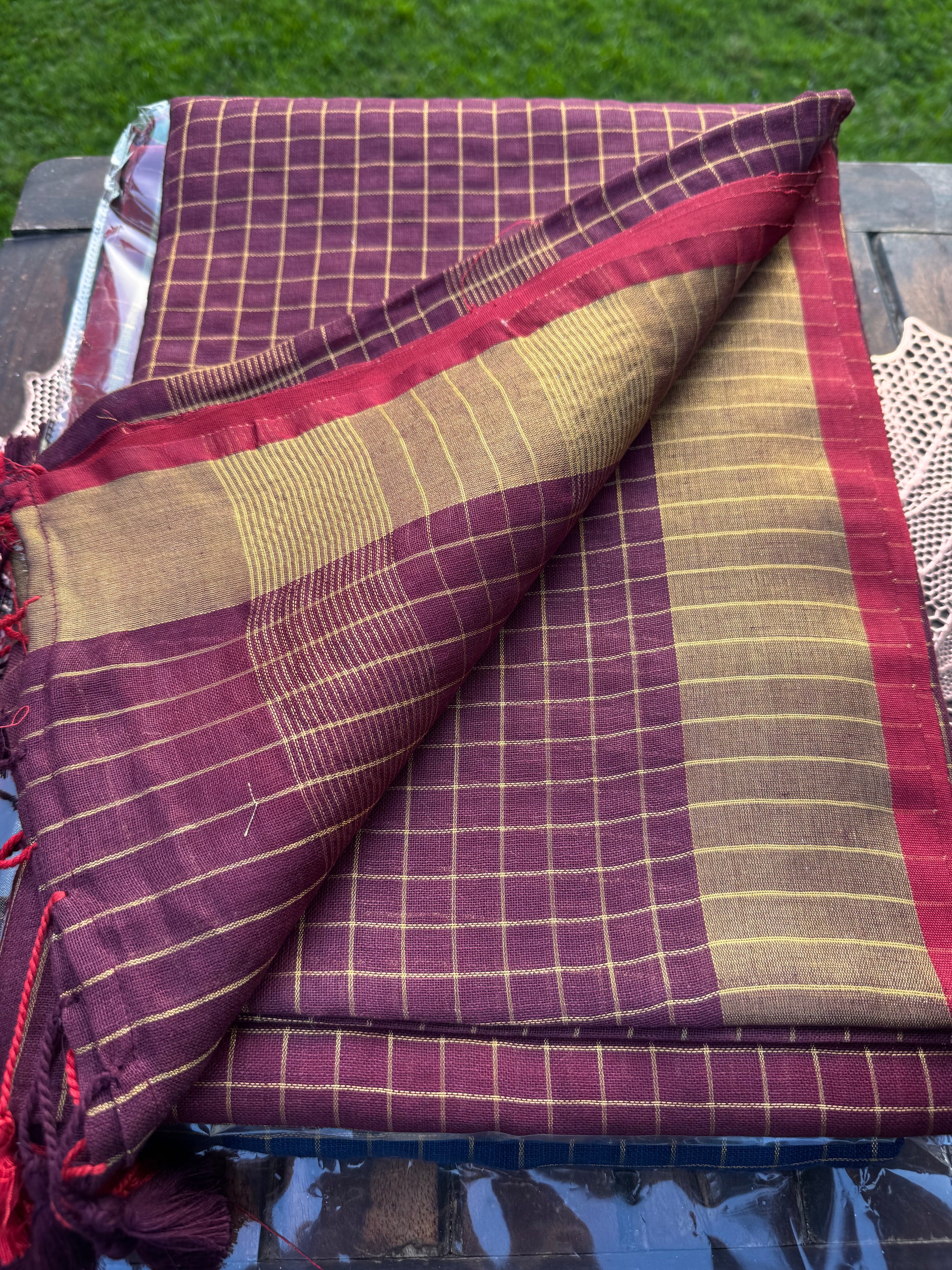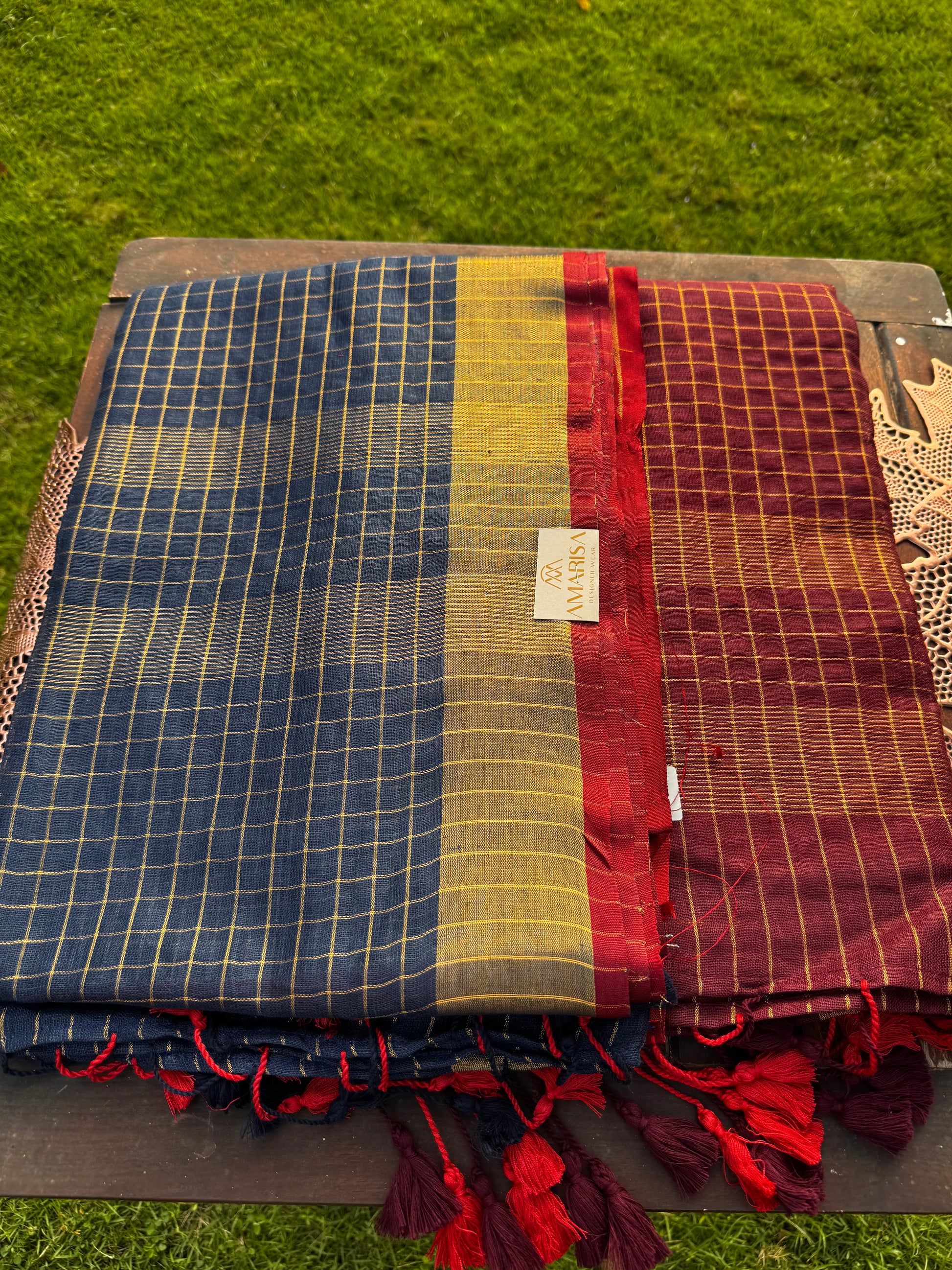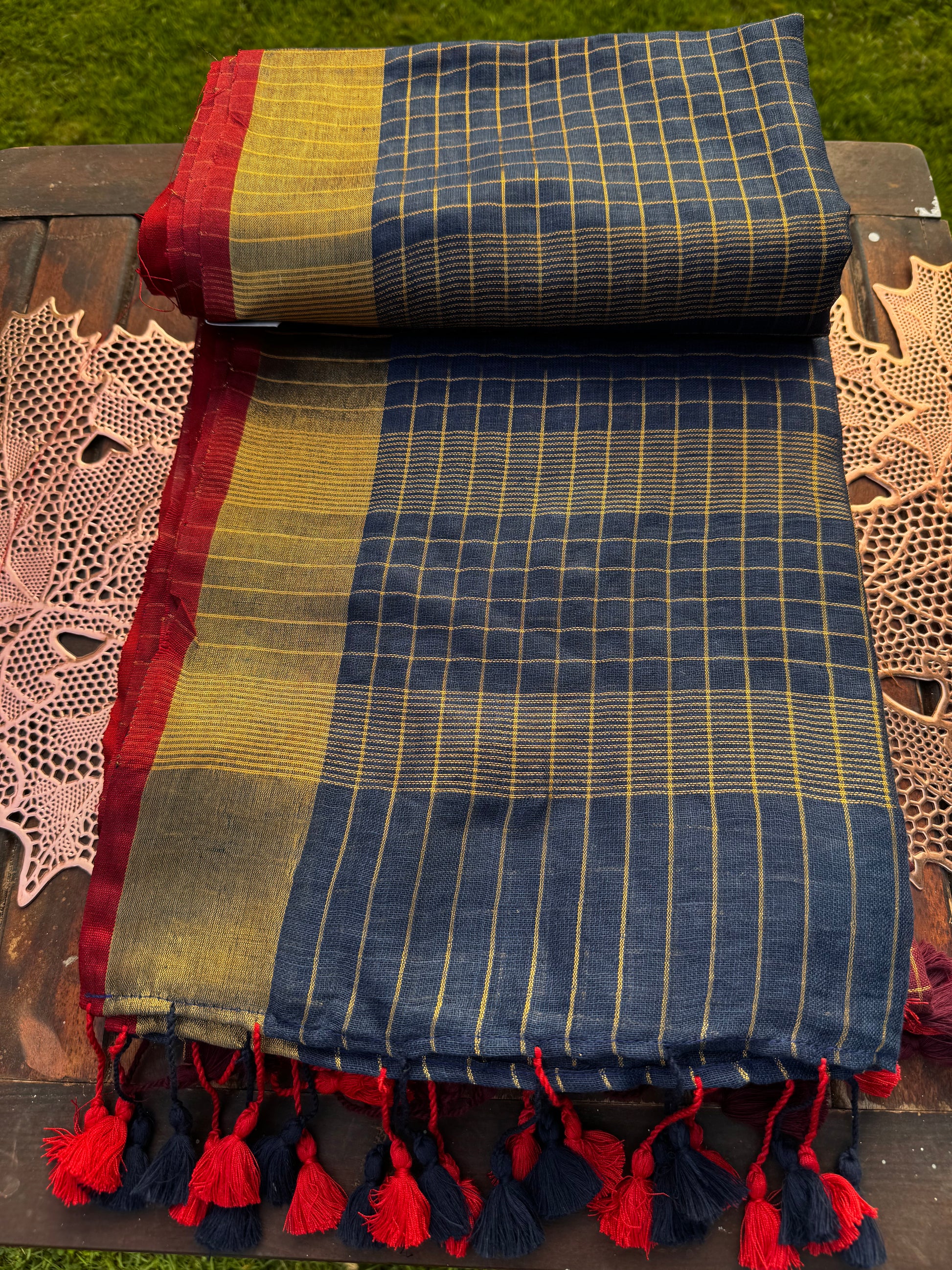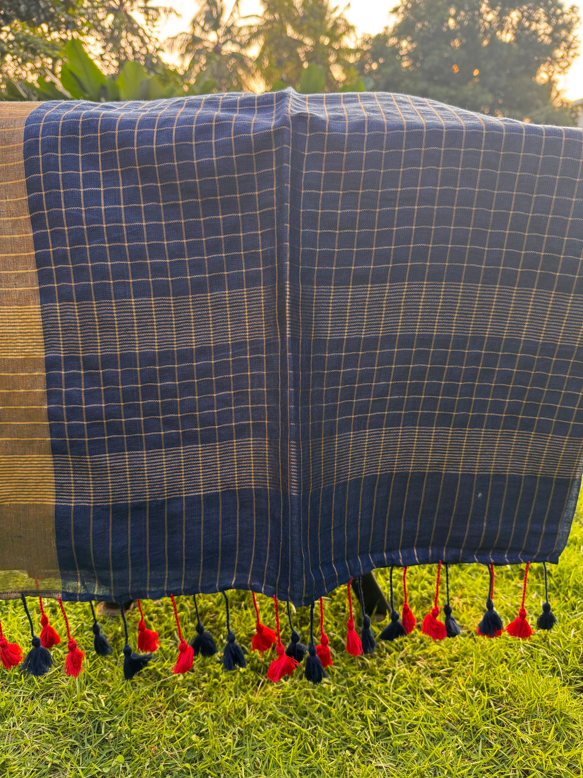 A beautifully woven linen saree featuring classic checks, rich dual-tone borders, and playful tassels. Lightweight, breathable, and effortlessly elegant — this saree brings together traditional charm with a modern, minimal aesthetic.