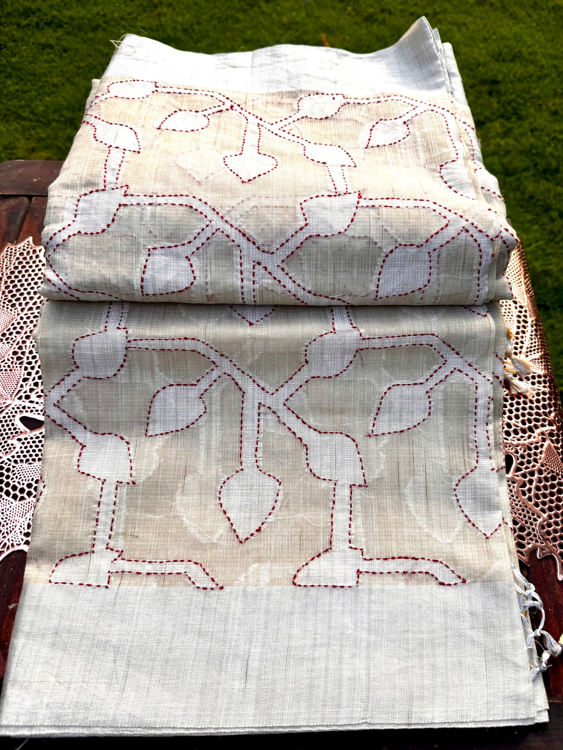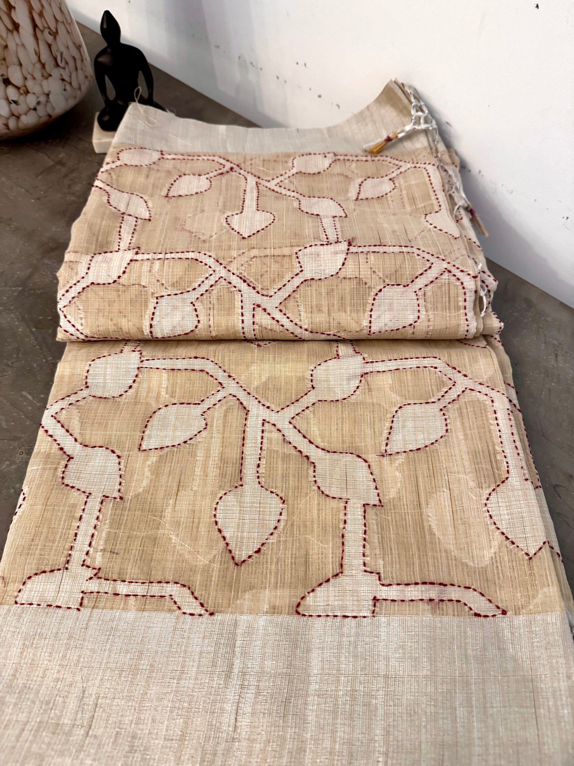 A beautifully airy Linen Kota saree featuring delicate outline thread work in leafy motifs. Soft, lightweight, and effortlessly graceful — this saree is perfect for those who love minimal, breathable drapes with a handcrafted touch.