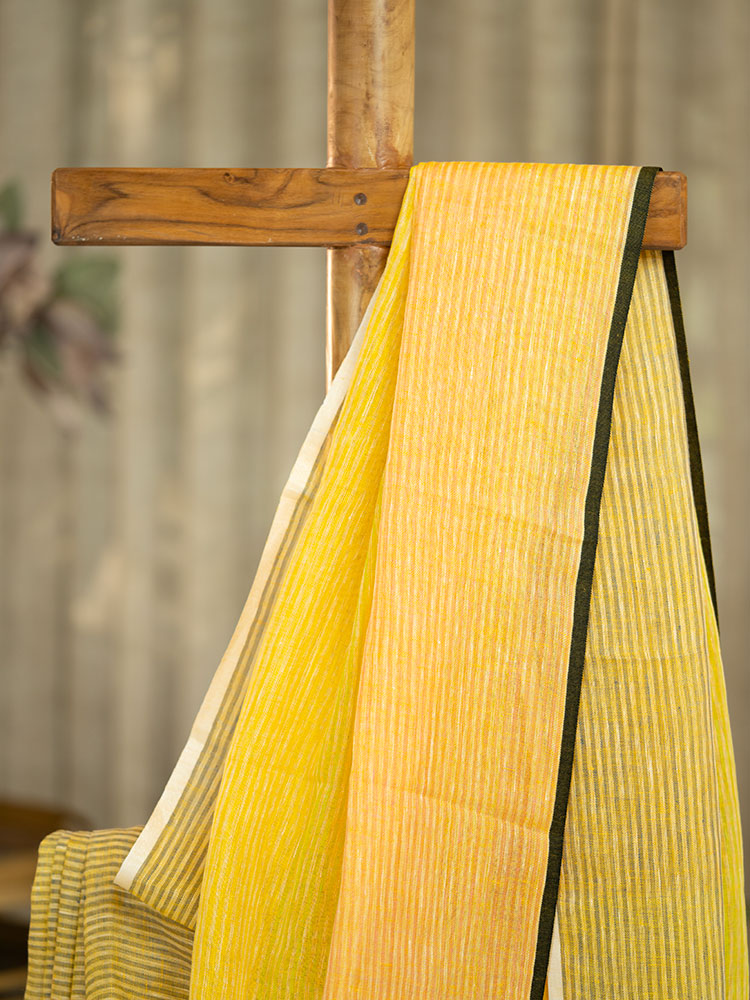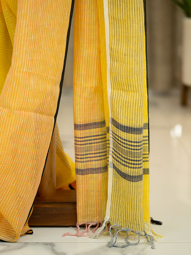 Make a bold statement with our Linen Saree in Multi-Color Combination, featuring shades of yellow, orange, and black for a striking look. Perfect for casual outings, festive celebrations, and cultural events, this saree combines contemporary style with timeless appeal.