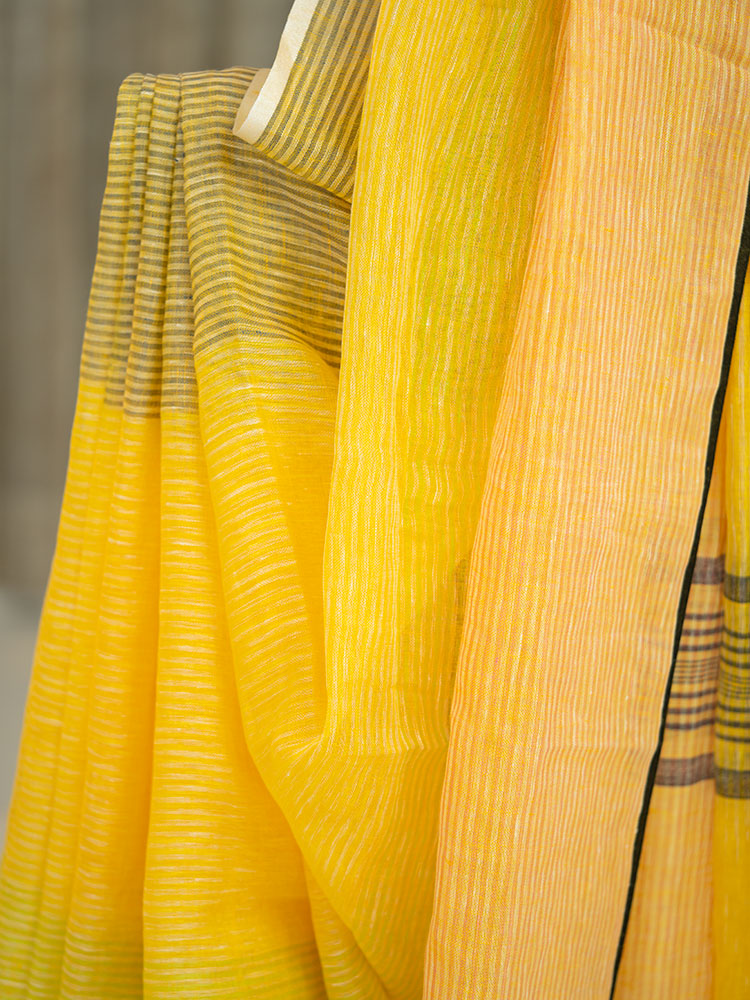 Order Now to Add Vibrance to Your Wardrobe! Upgrade your ethnic collection with the Linen Saree in Multi-Color Combination - Yellow, Orange, and Black Shades. Shop today and celebrate colorful elegance!
