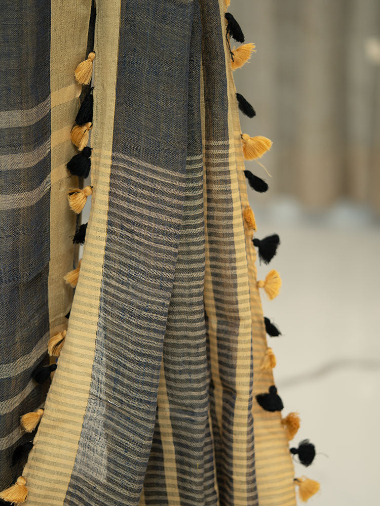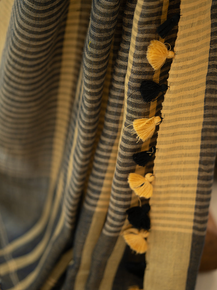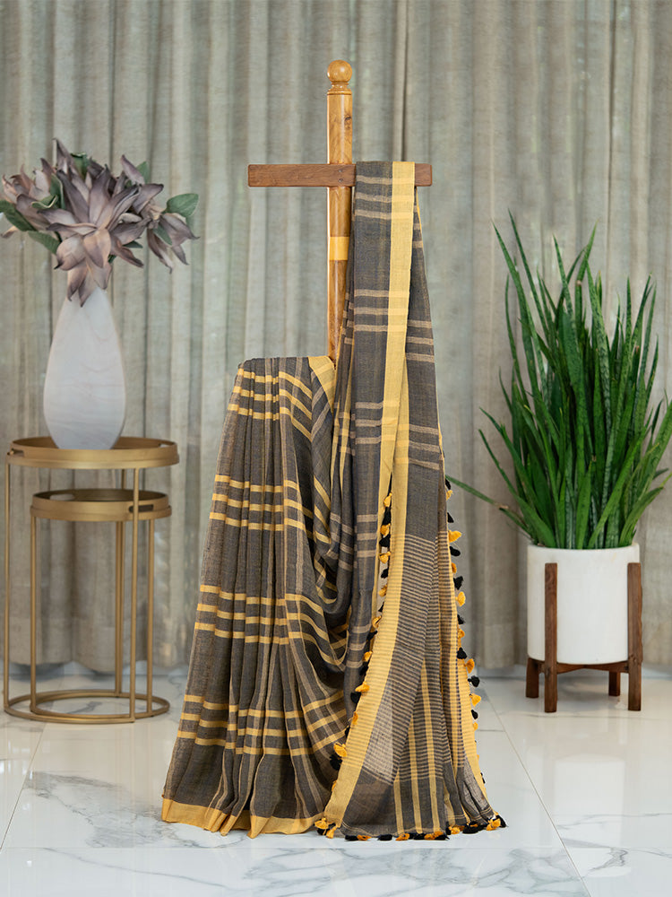 Linen Saree in Yellow and Black with Asymmetrical Checks