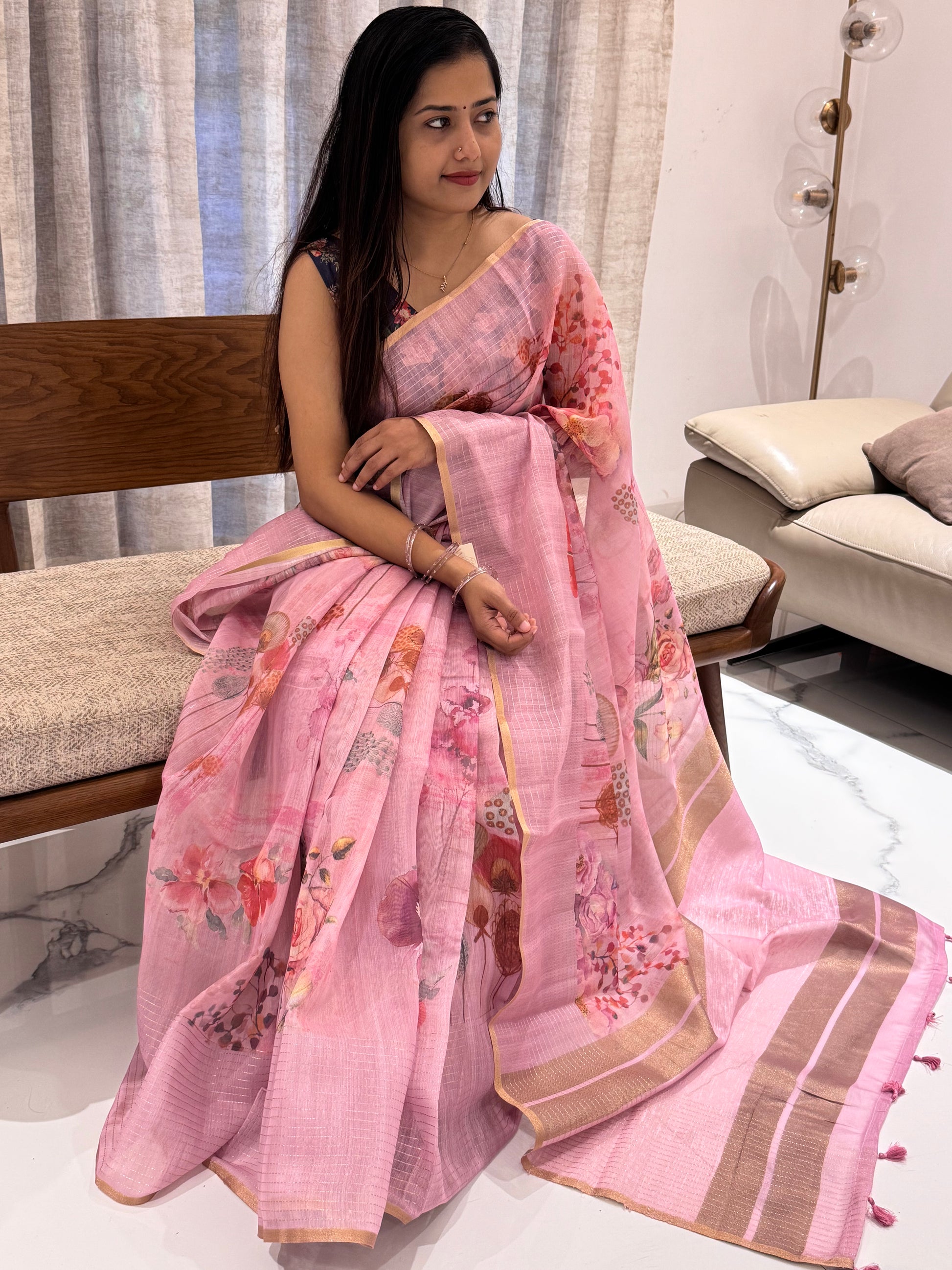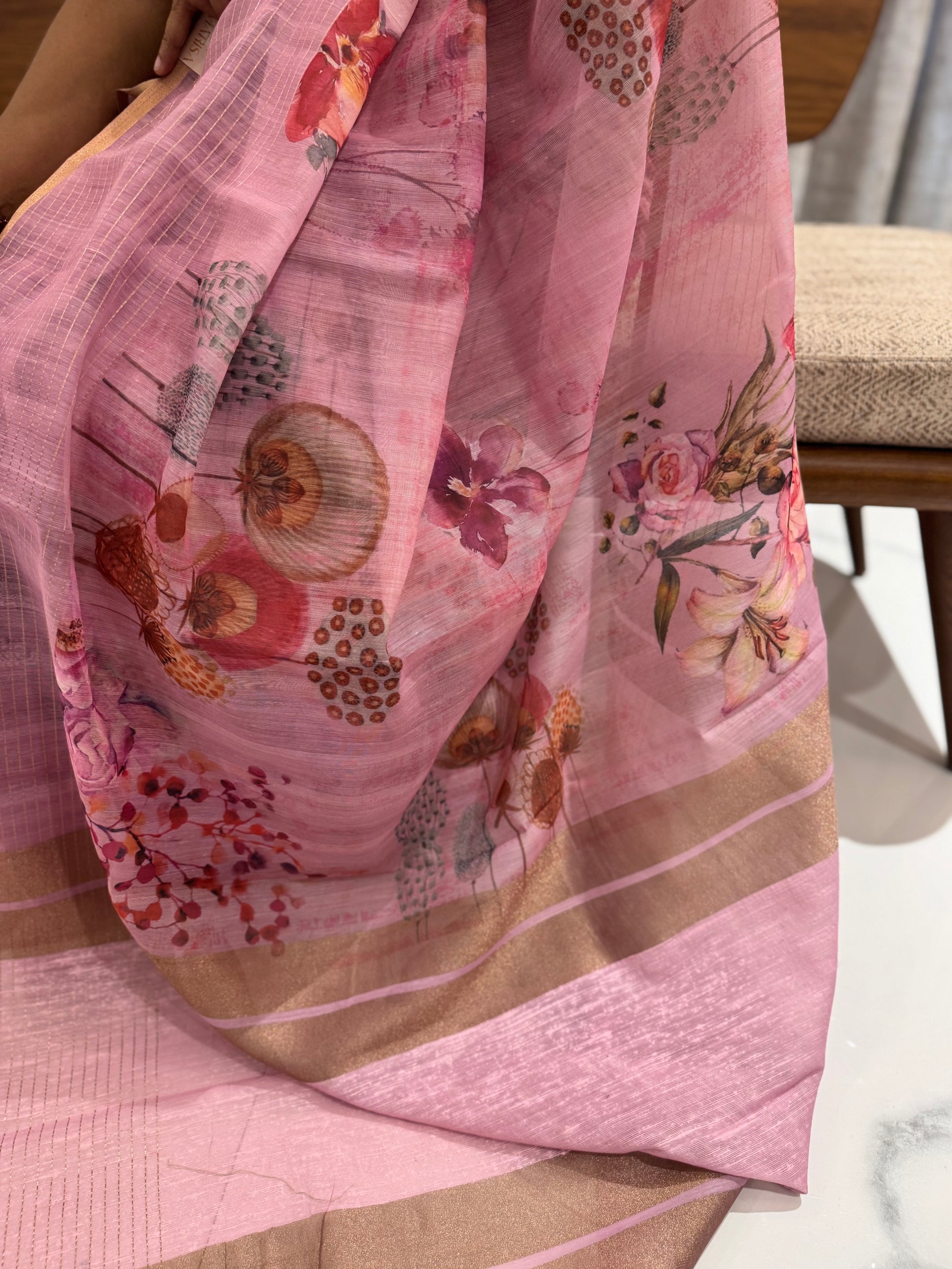 Soft, breathable, and effortlessly graceful — this linen silk saree in shade of  pink captures the charm of delicate florals with every drape. The subtle sheen of silk blends beautifully with the airy texture of linen, making it ideal for both festive gatherings and casual elegance.