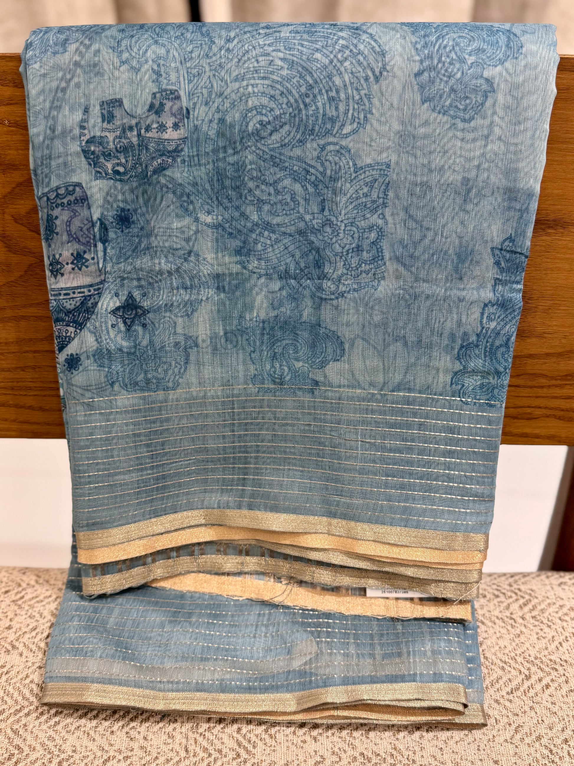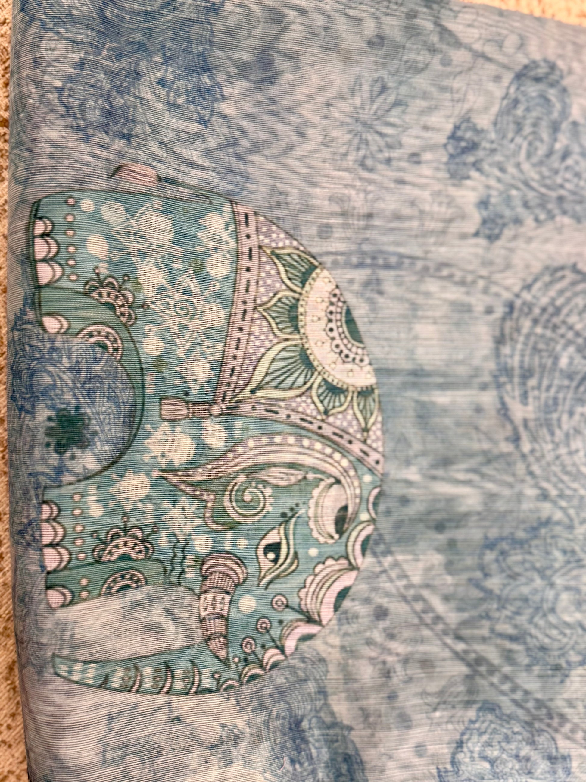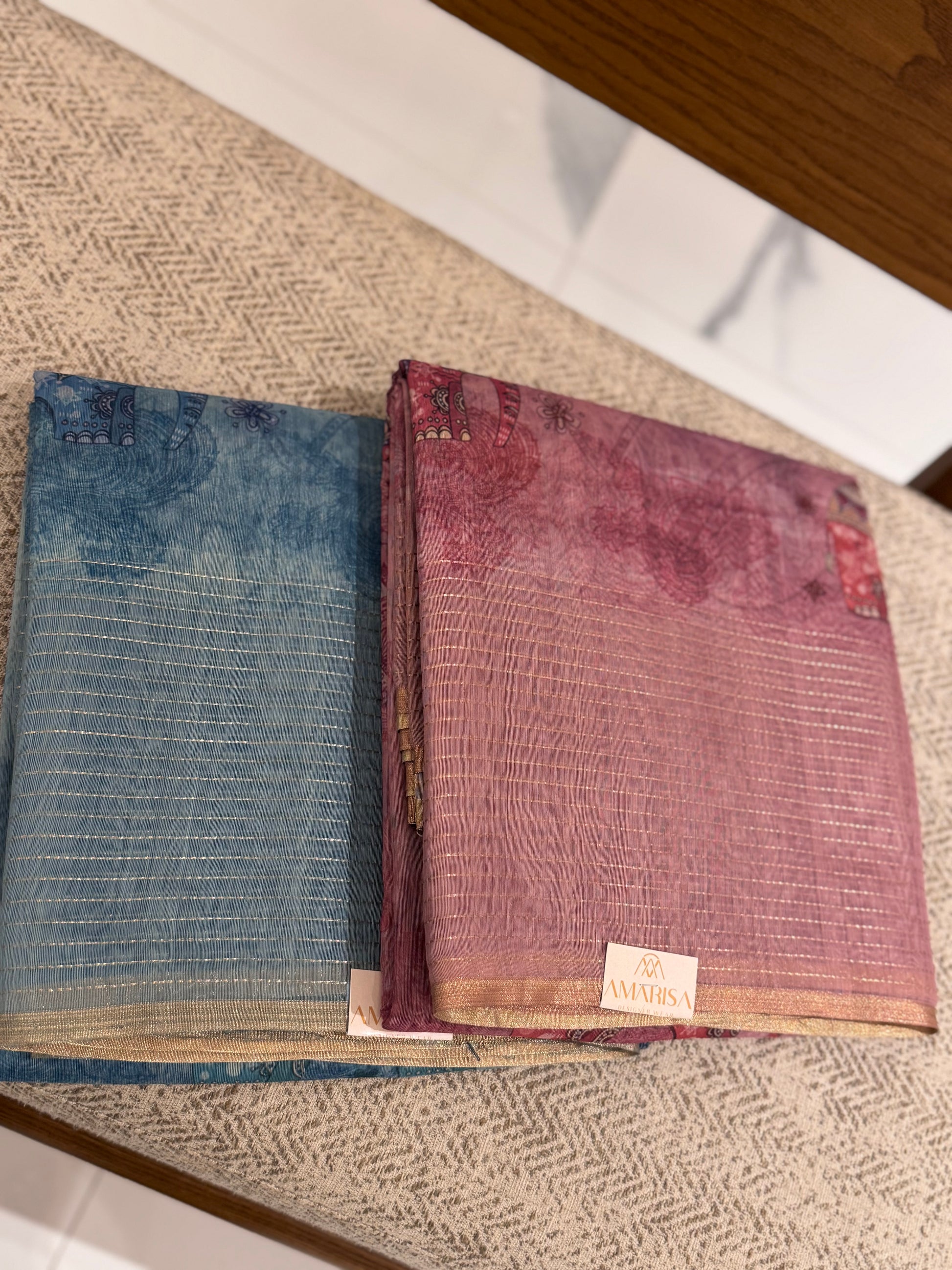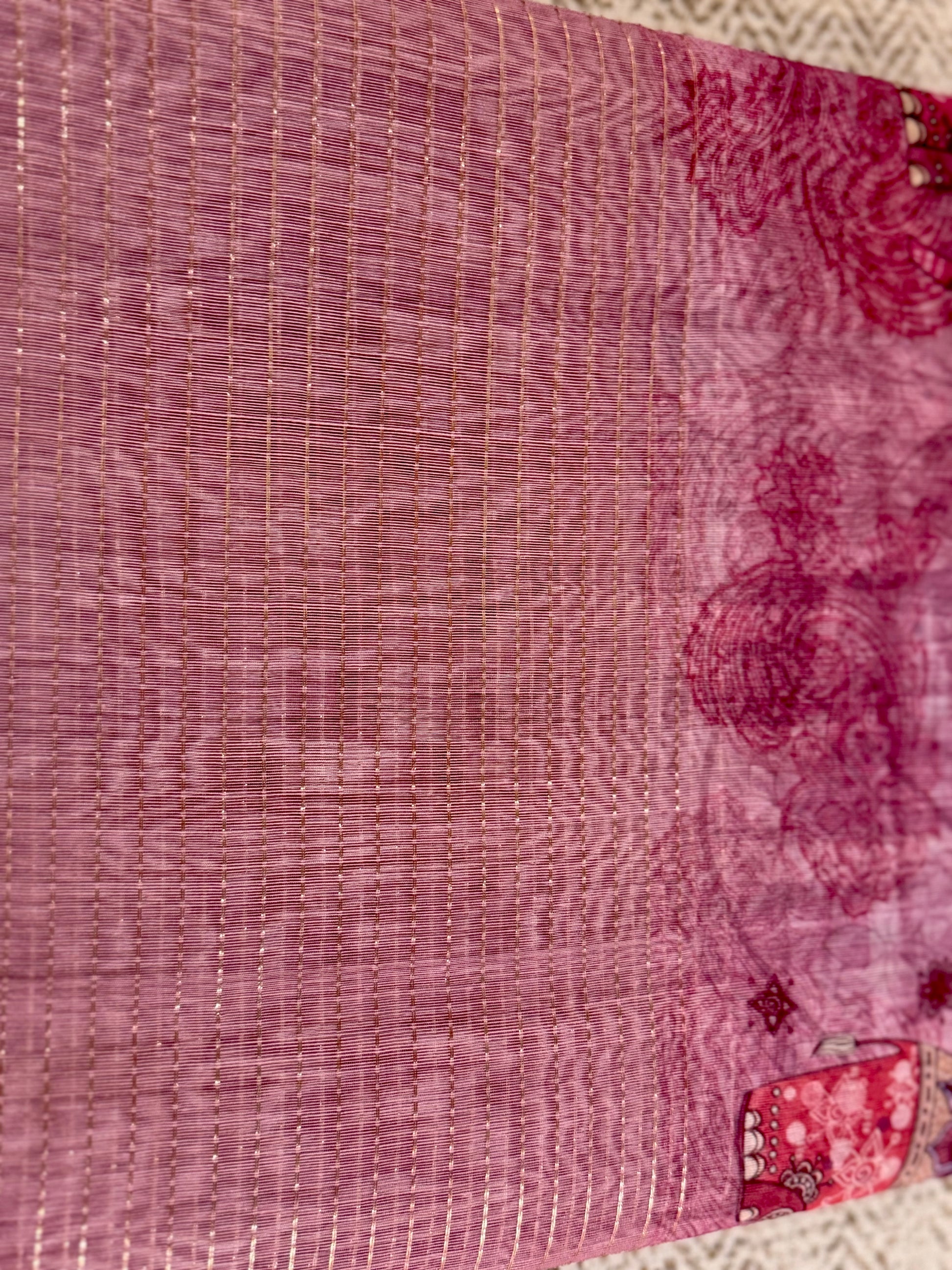 Elevate your ethnic wardrobe with this exquisite linen tissue saree in a soft light pink hue, adorned with intricate rustic brown elephant motifs that bring a touch of traditional charm. The subtle gold zari lines woven throughout the saree add a hint of shimmer, beautifully complementing the understated elegance of the fabric. Finished with a delicate golden border, this saree blends modern sophistication with timeless artistry — perfect for festive occasions, weddings, or elegant evenings.