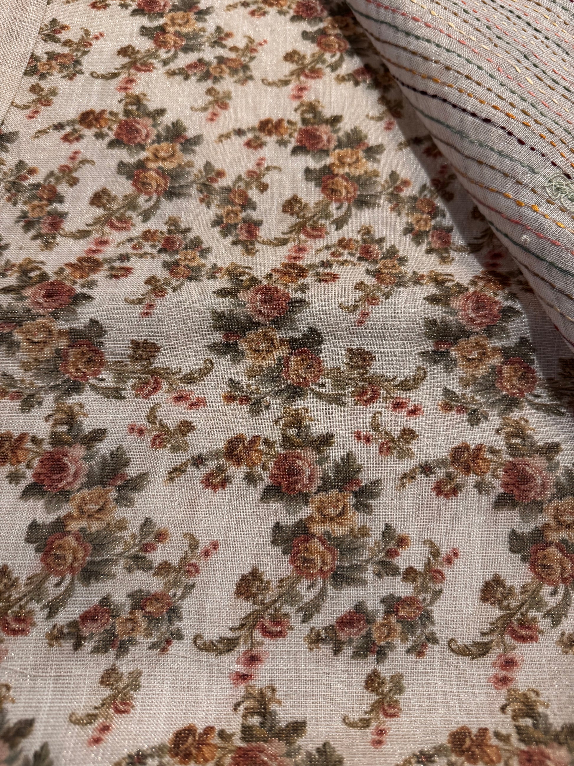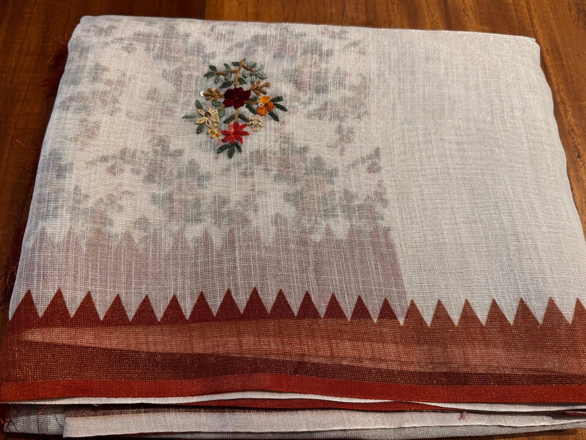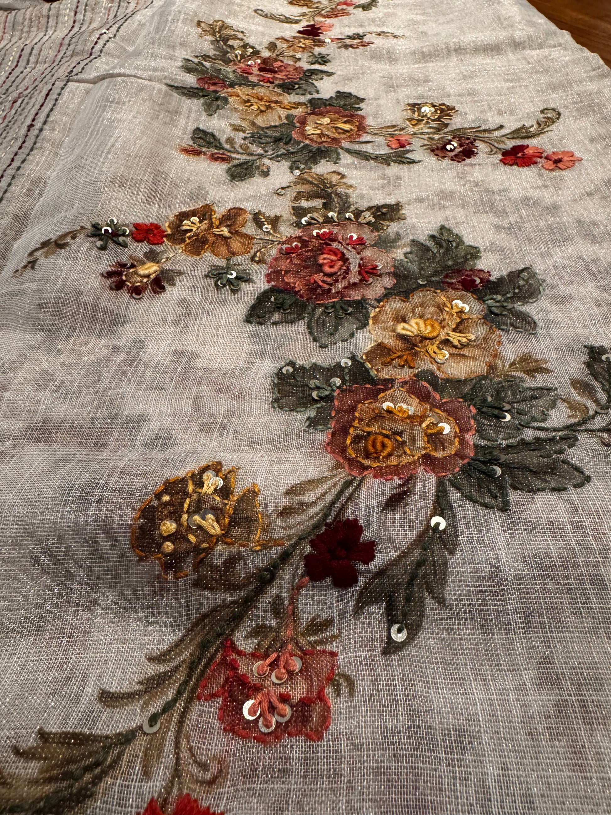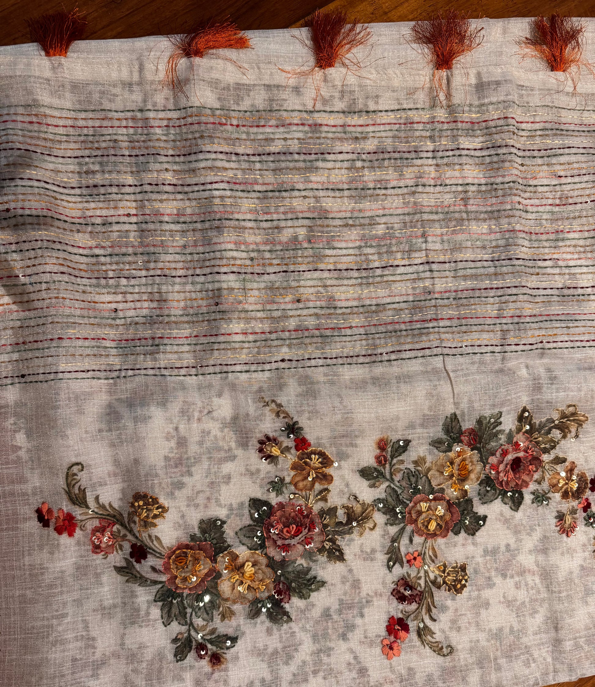 Bring home a blend of elegance and comfort with this beautifully crafted linen-tissue saree. The body features a soft vintage floral print, enhanced with delicate thread embroidery and subtle sequins that add a gentle shimmer.