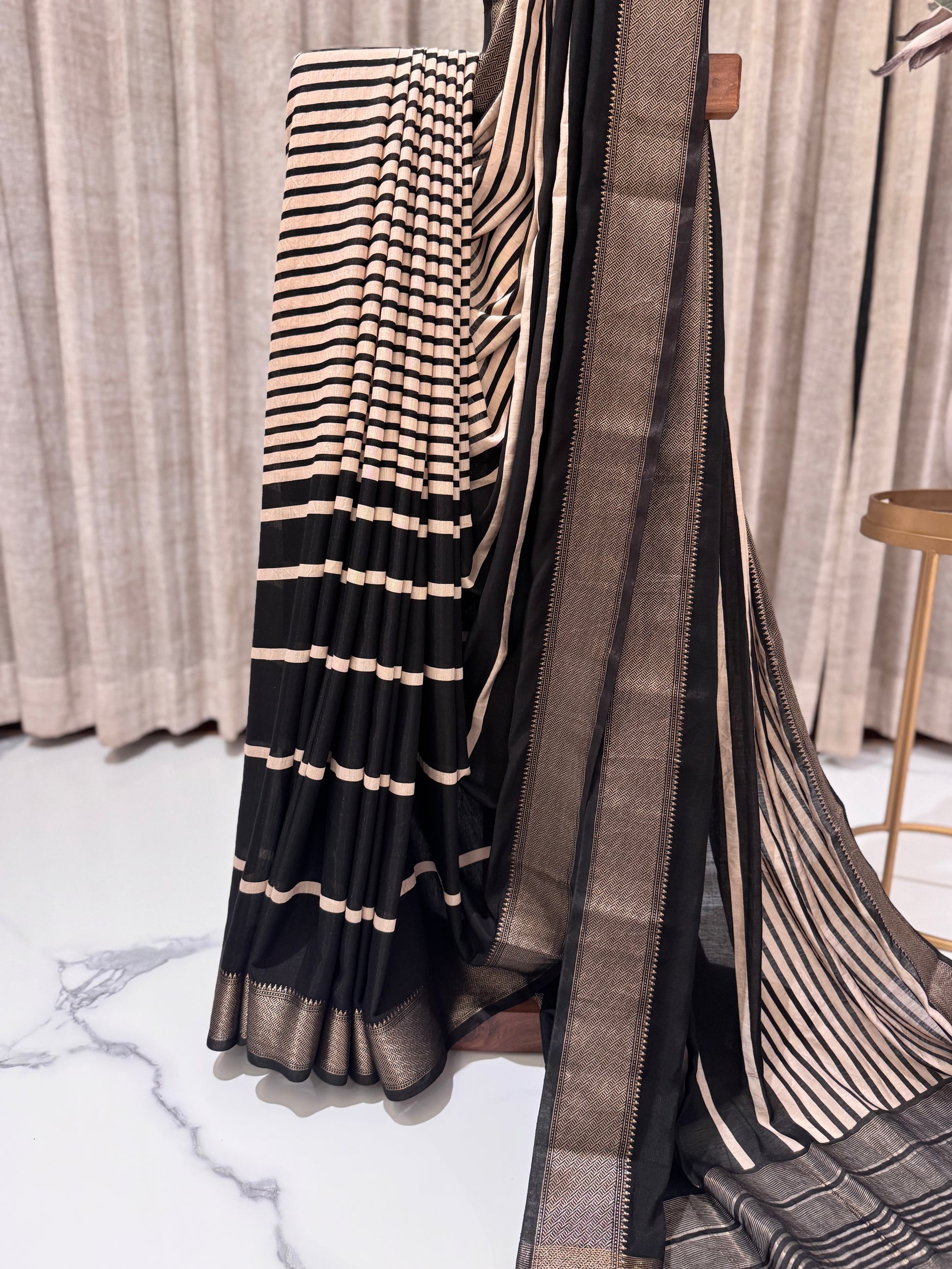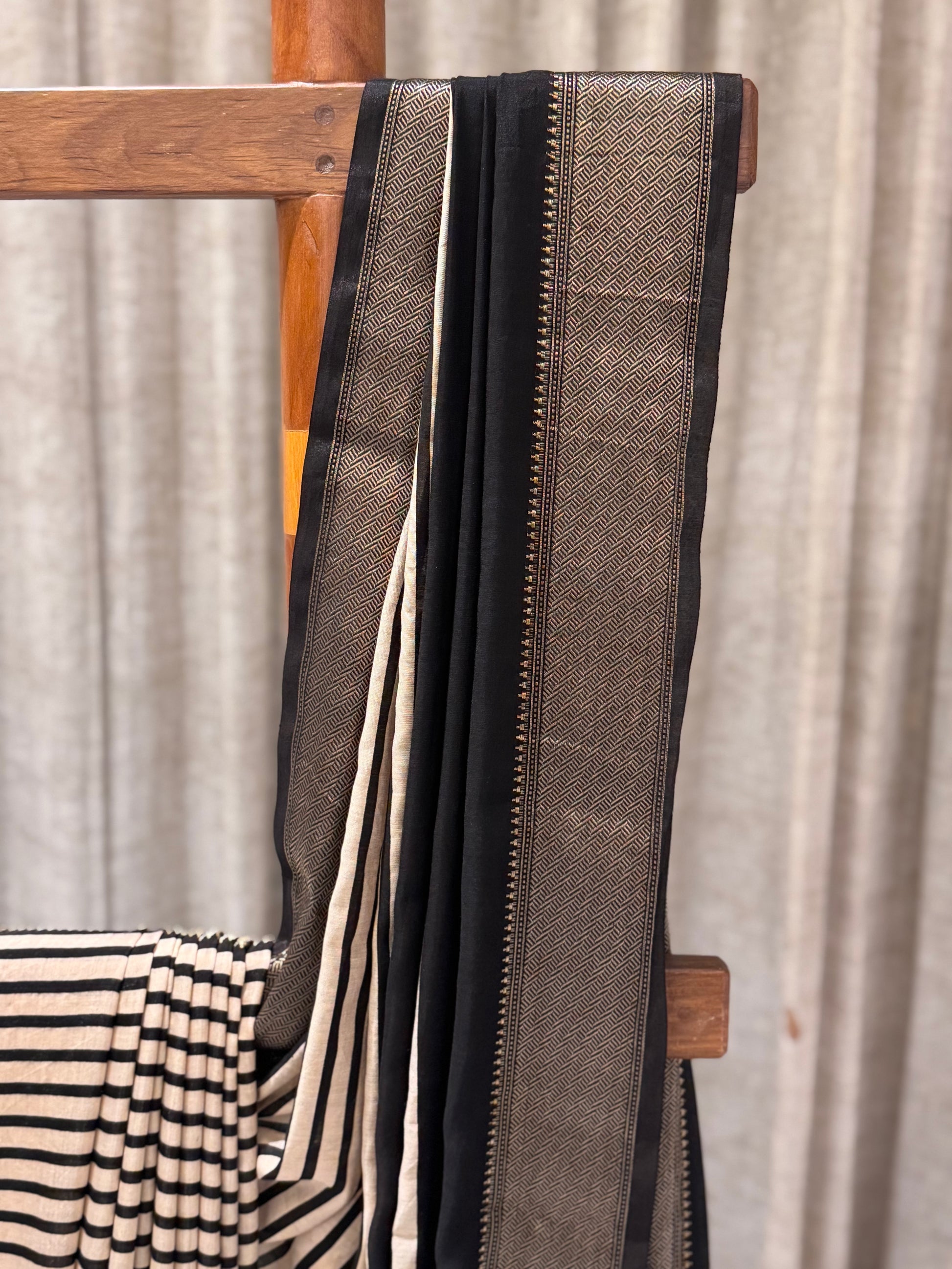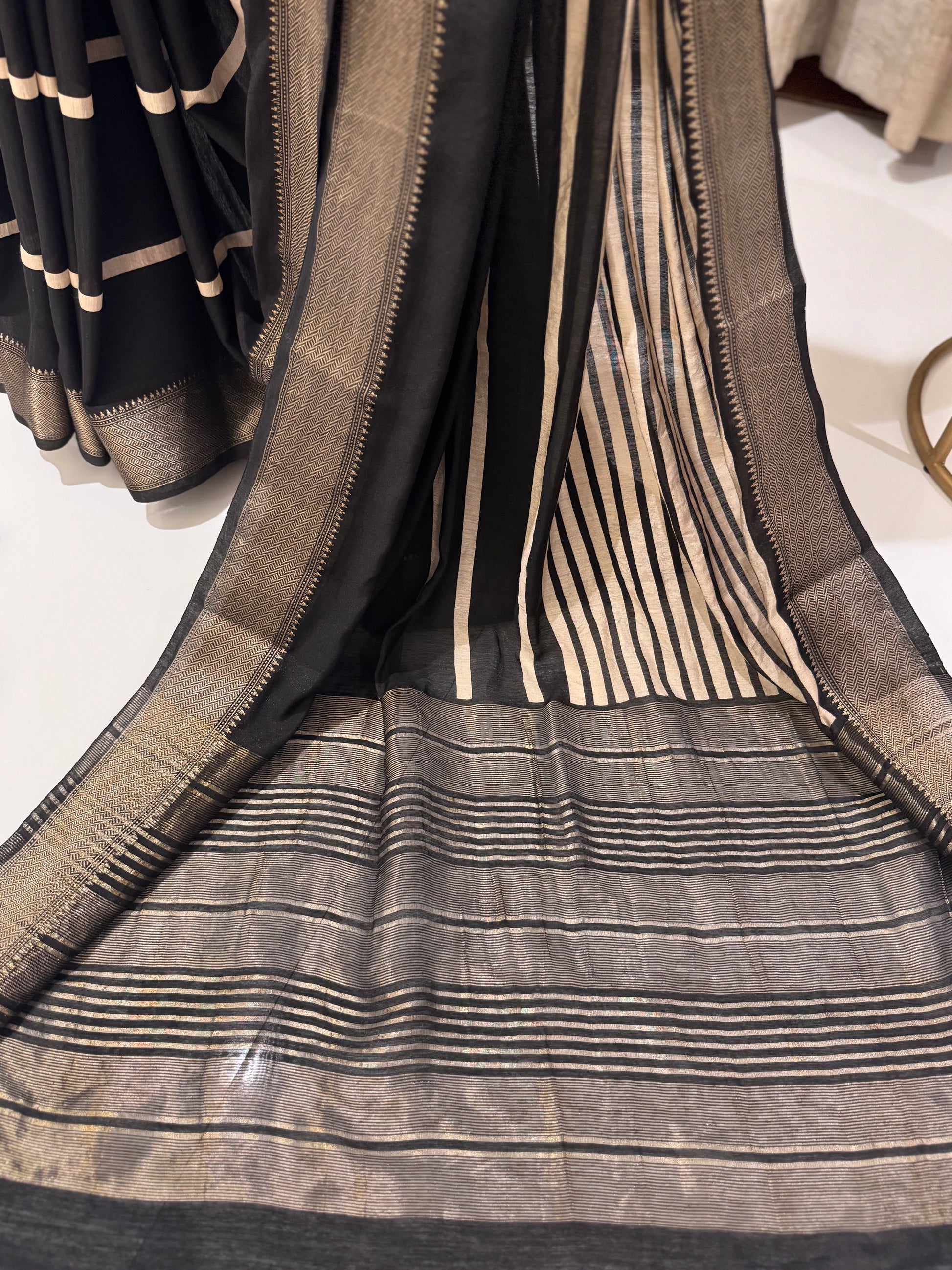 Elevate your ethnic wardrobe with this timeless Maheshwari cotton saree featuring a striking combination of black and white horizontal stripes. Handwoven in the heritage town of Maheshwar, this saree blends tradition with contemporary aesthetics, making it perfect for both casual and festive occasions.