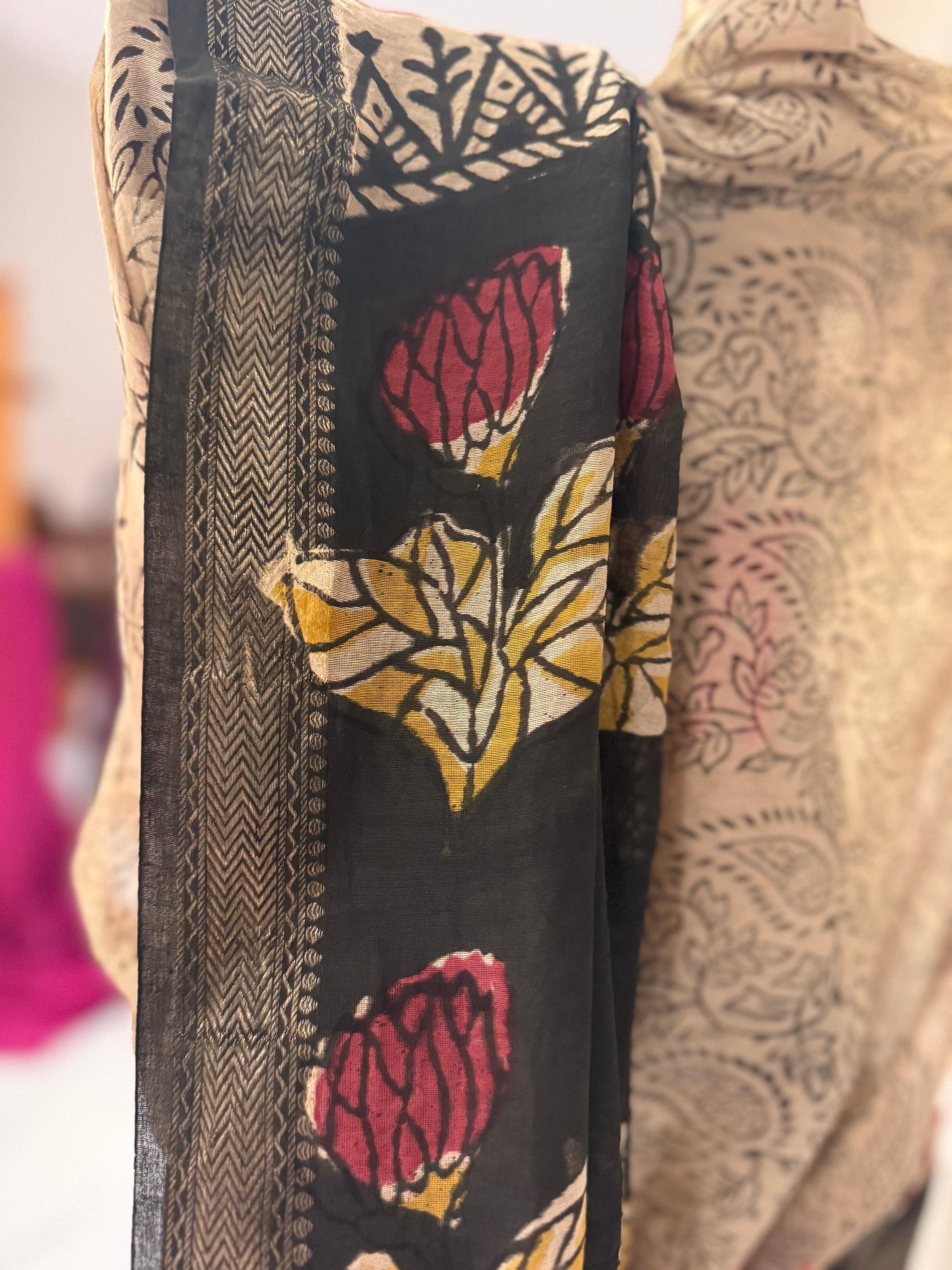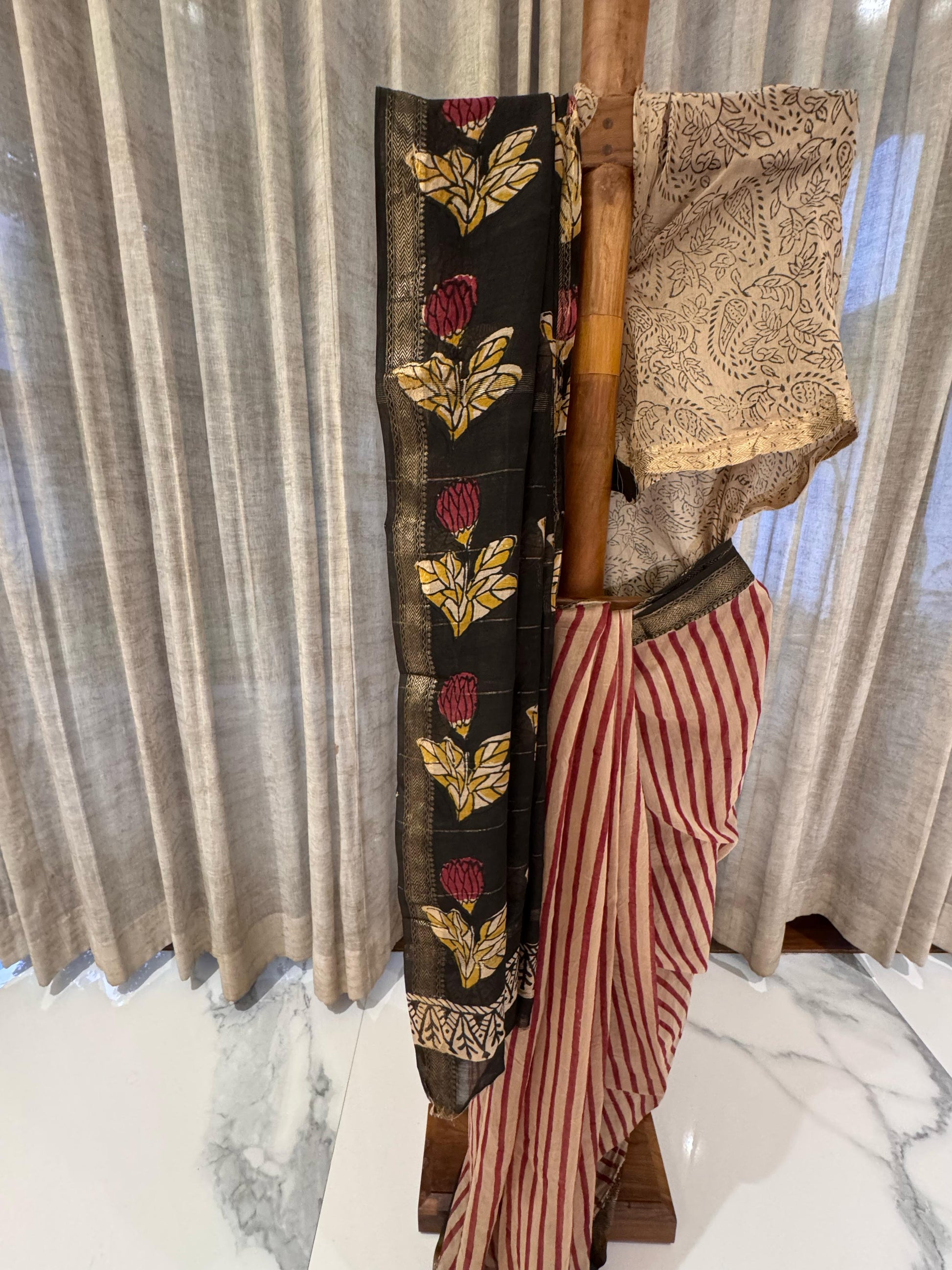 Comes with a coordinated off-white blouse piece, featuring classic black Bagru print and accented with a golden zari border, ensuring a cohesive and stylish ensemble.
