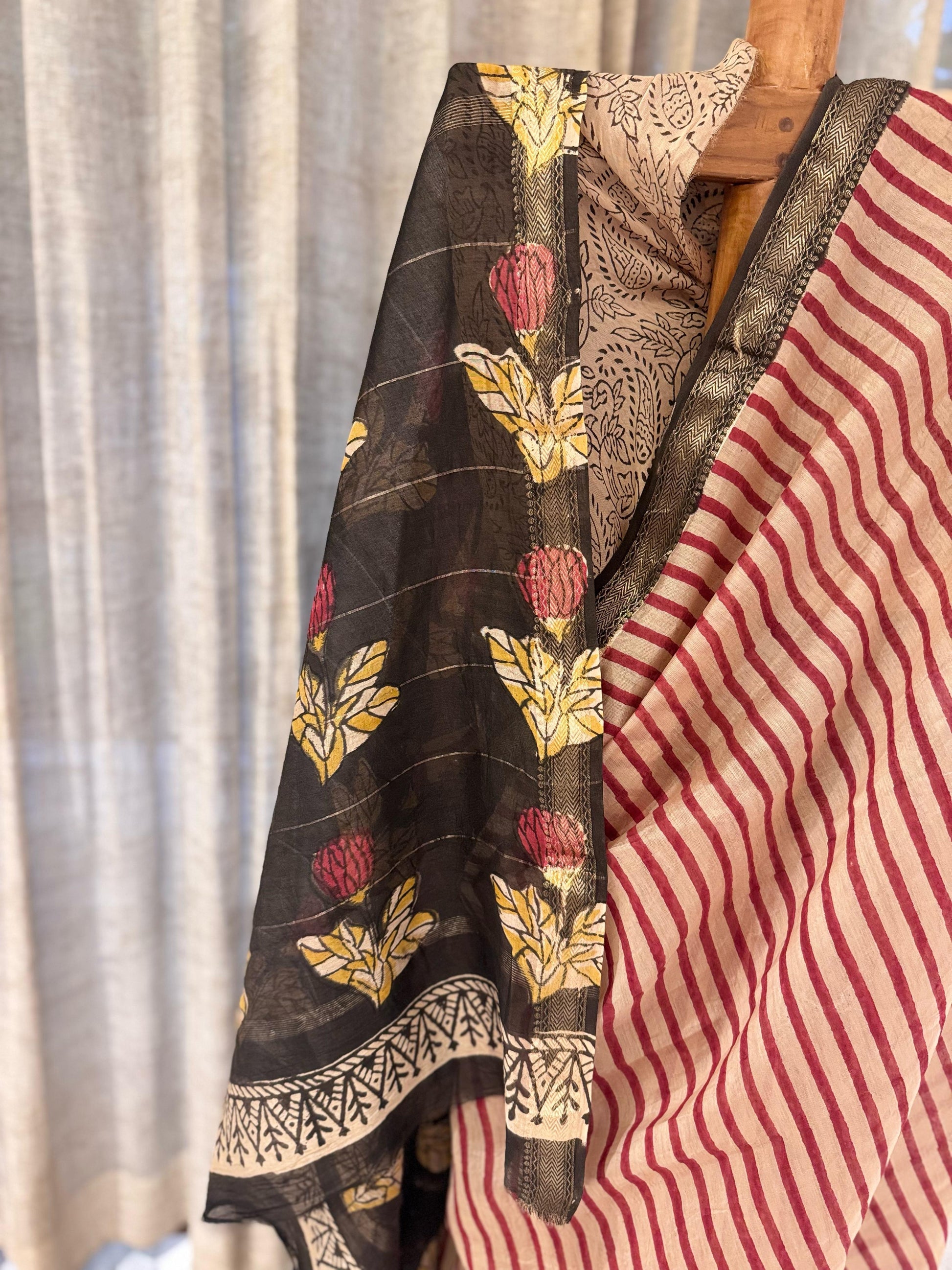 Elegant Maheshwari Silk Saree – Off White with Red Stripes & Black Pallu