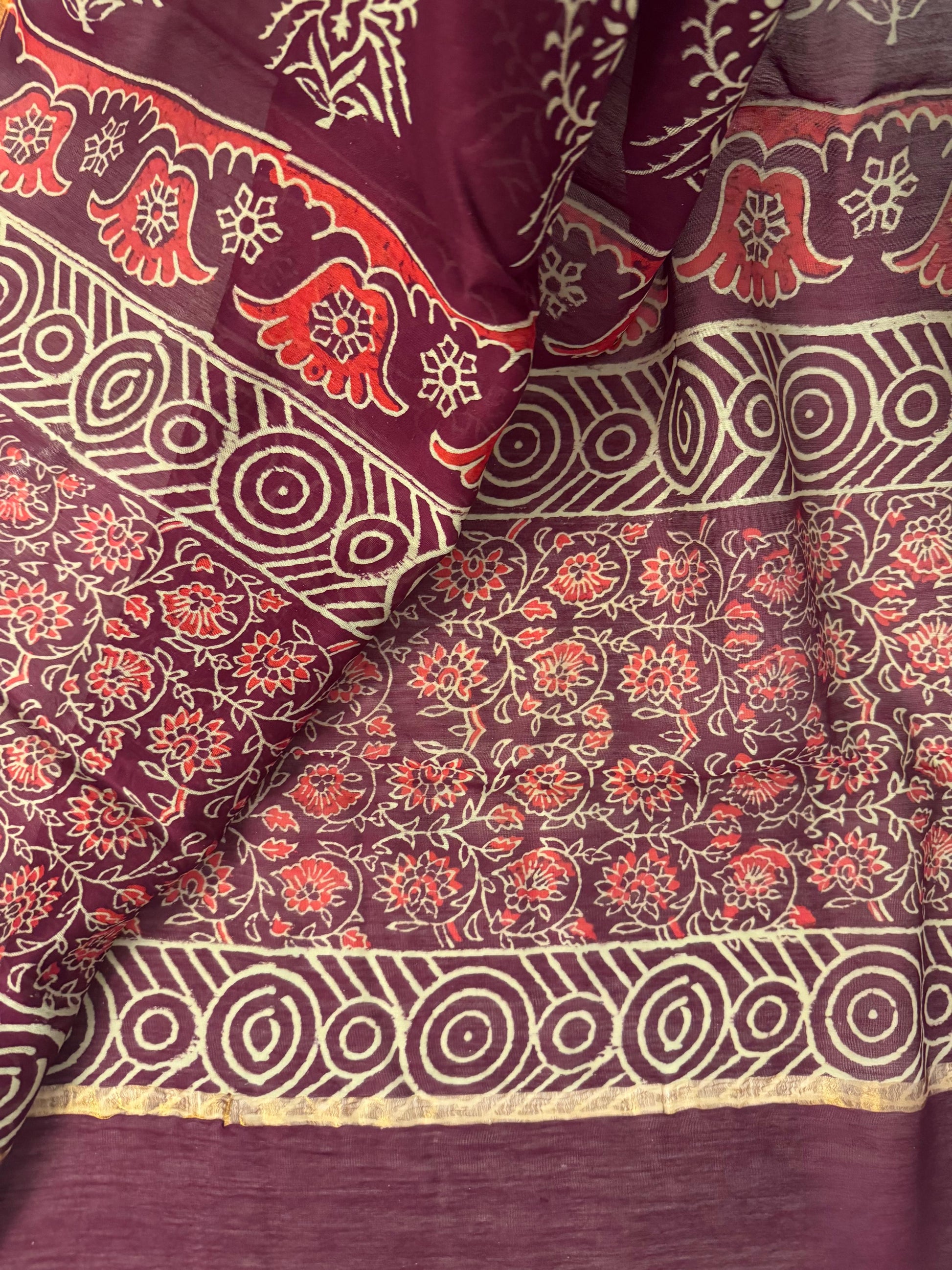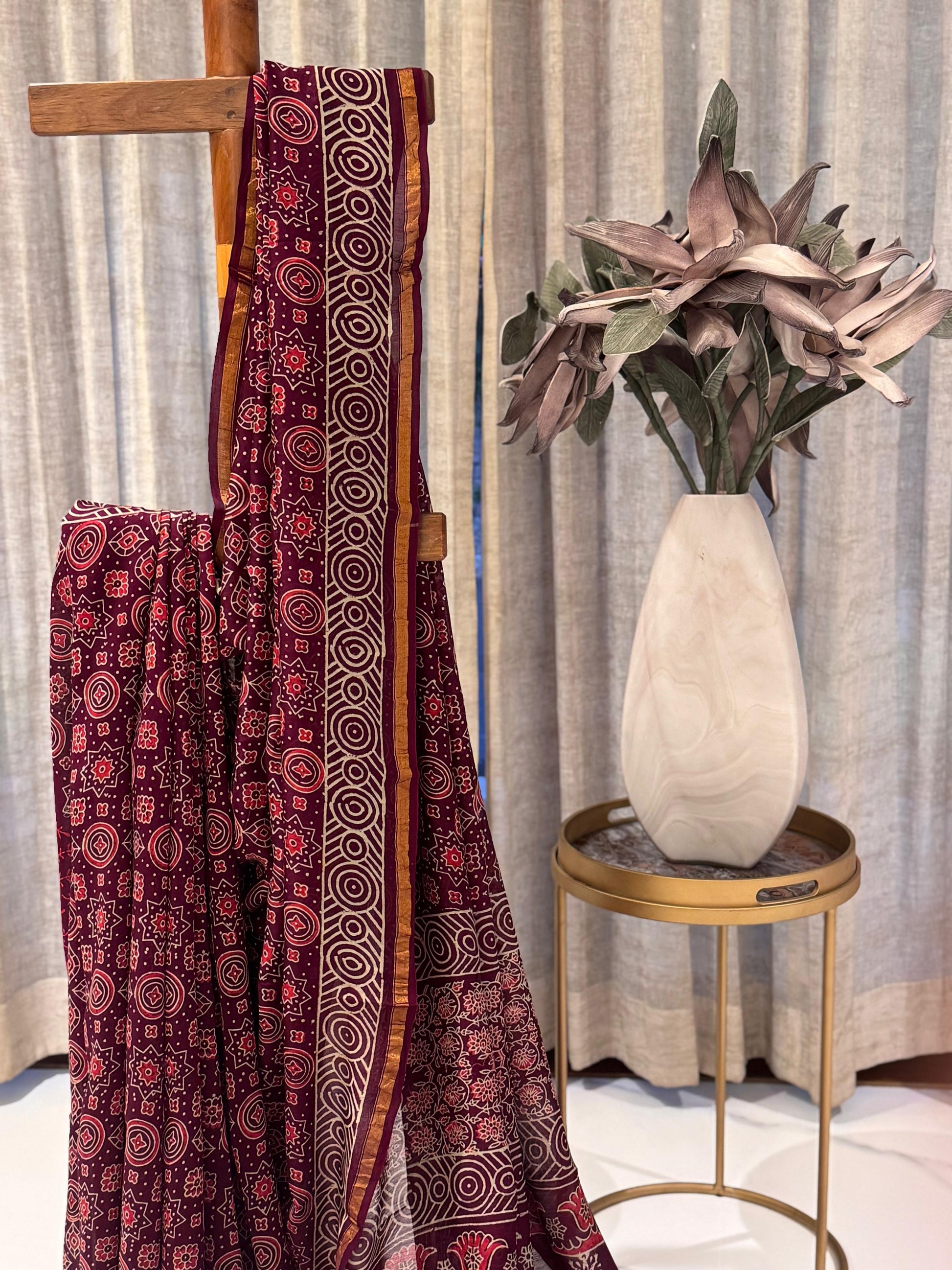Crafted from premium quality Chanderi cotton, the fabric is known for its lightweight texture, sheer feel, and subtle shine, offering comfort without compromising on elegance. The contrast of the rich maroon base with delicate white Ajrak patterns gives it a striking yet sophisticated look, making it perfect for both day and evening occasions.